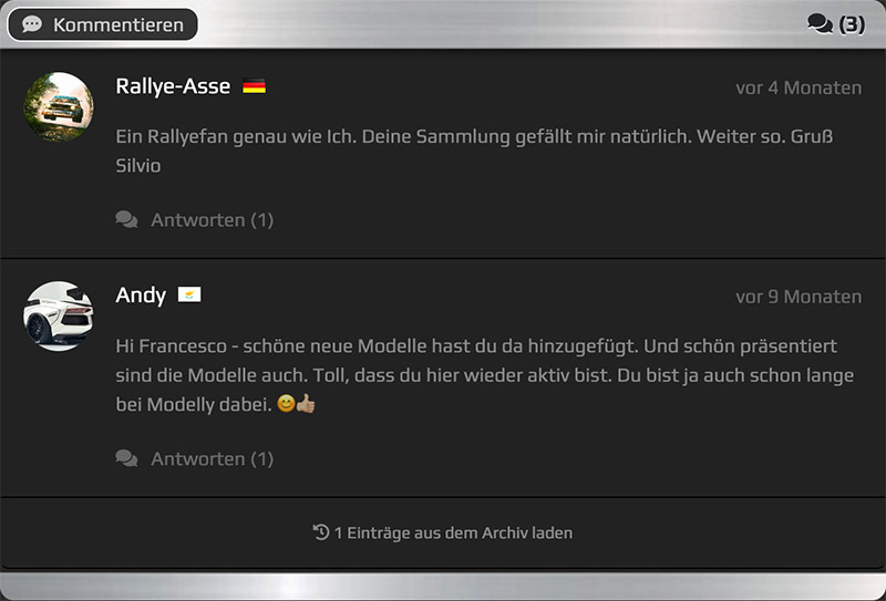 Aus diesen Verbindungen sind auf Modelly bereits viele Freundschaften und inspirierende Diskussionen entstanden. Teile und präsentiere deine Modellsammlung auf Modelly, erfreue andere Sammler damit und erlebe dein Hobby auf völlig neue Weise.