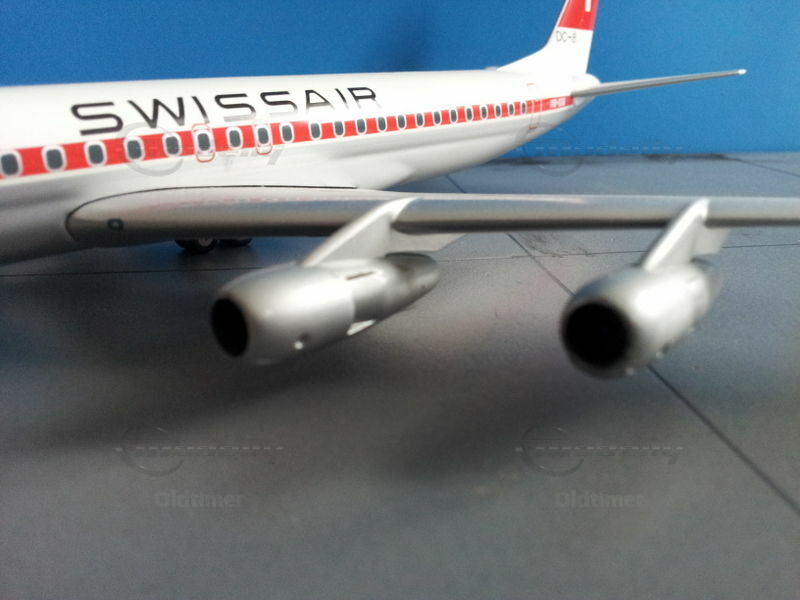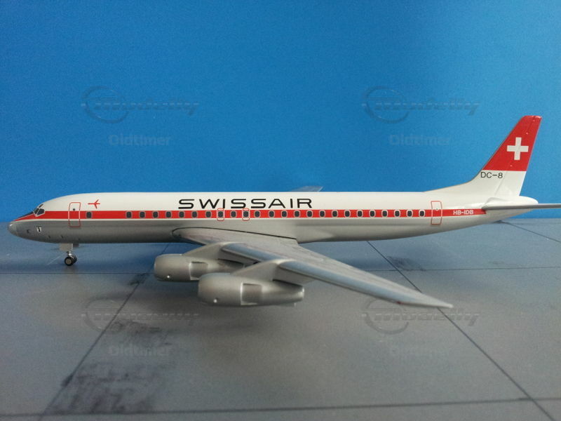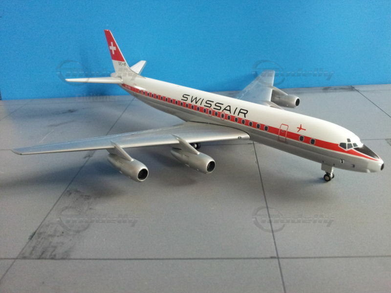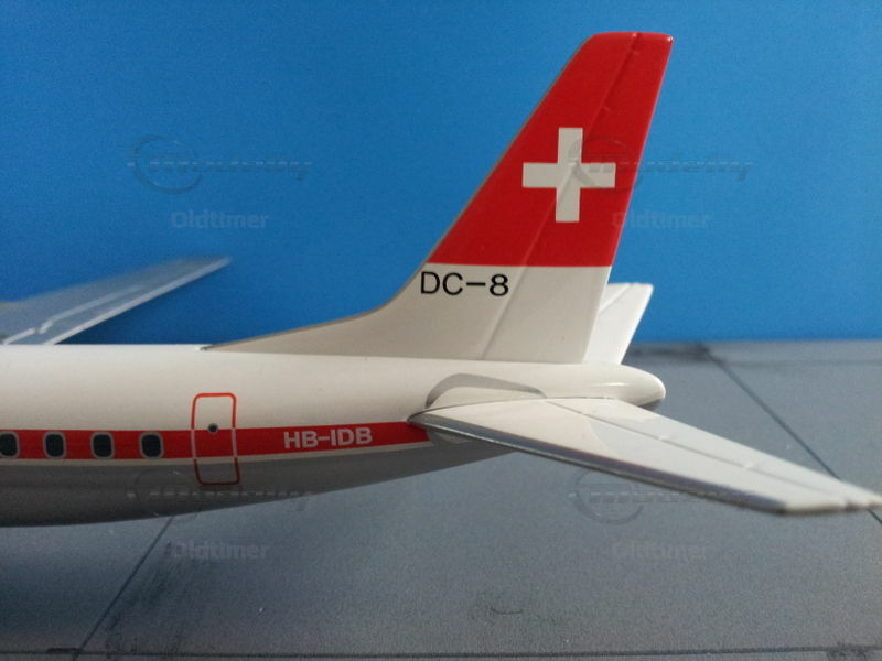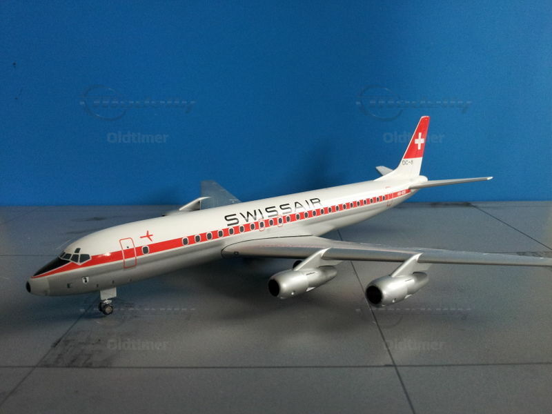 Sie wurde mehrfach umgebaut und auch unbenannt. Ihr erster Name als DC-8-32 war "Jungfrau" (ein Berg in der Schweiz), danach als DC-8-33 "Basel-Stadt (die abgebildete Version) und schliesslich als DC-8-53 "Genf".