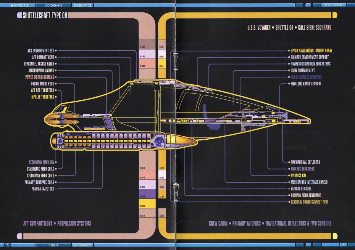 Die Hülle der Type-9 Shuttel waren aus Tritanium, welches 20x härter als Diamanten ist und sie verfügten über sehr starke Schutzschilde. Der Eingang war, wie bereits bei dem Type-6, an der Rückseite, über eine nach unten klappende Tür.