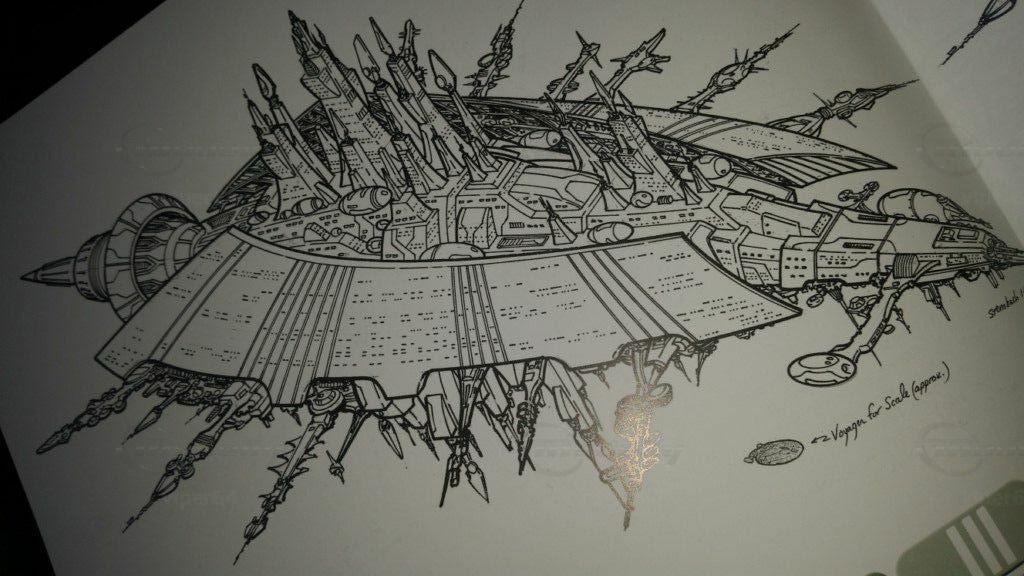 Die letzten beiden Bilder zeigen den ersten und zweiten Entwurf Sternbachs, die nicht zum Tragen kamen. Hier sieht man deutlich die Kulisse einer modernen Großstadt aus dem eigentlichen Raumschiff herausragen. Im Vordergrund sieht man ganz, ganz klein die VOYAGER im Verhältnis zu dem 11.000m langen Stadtschiff.