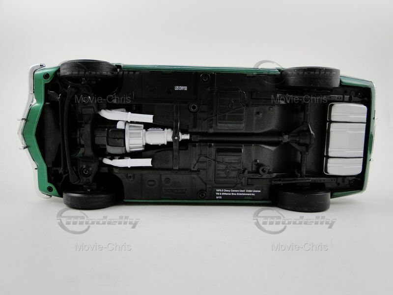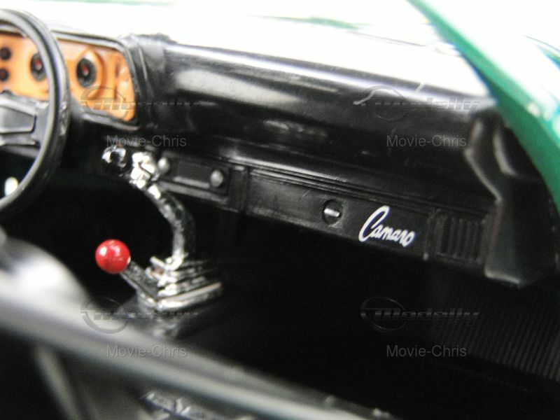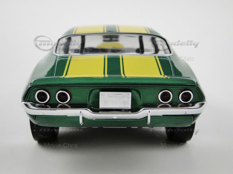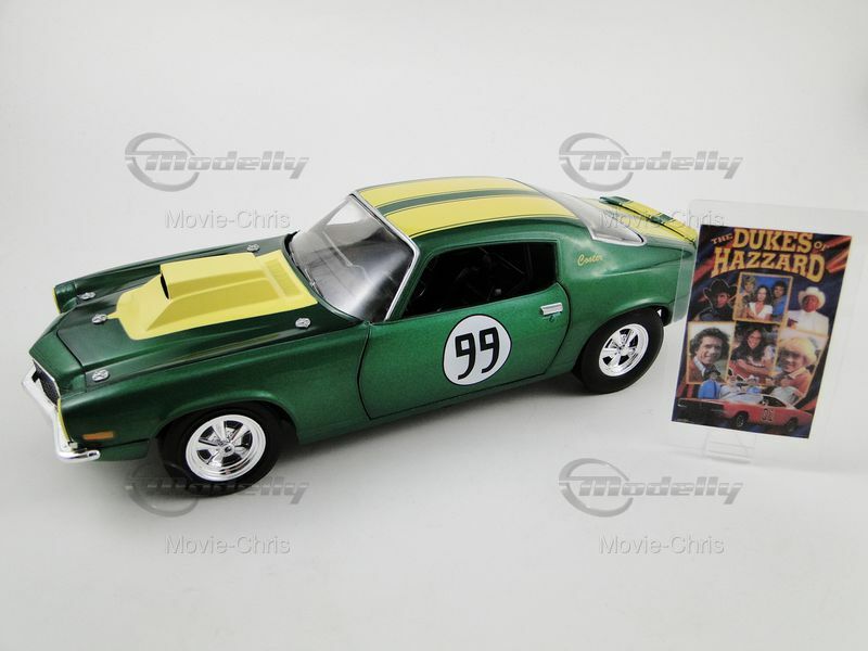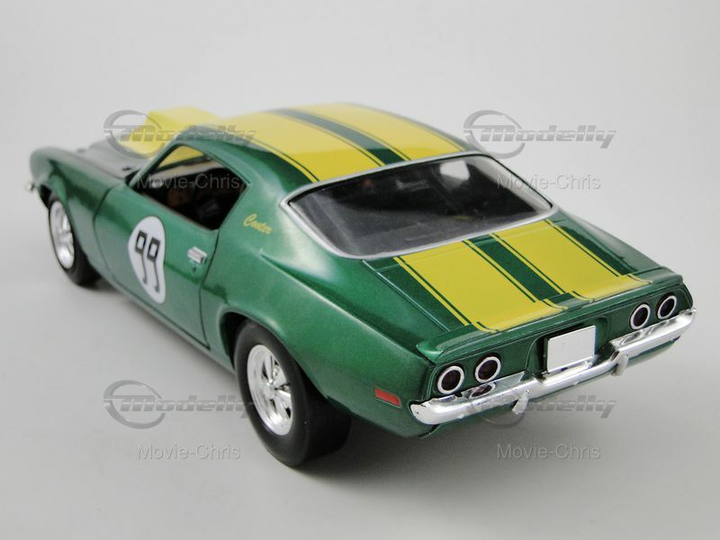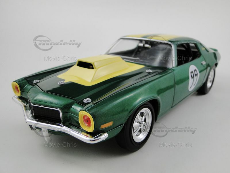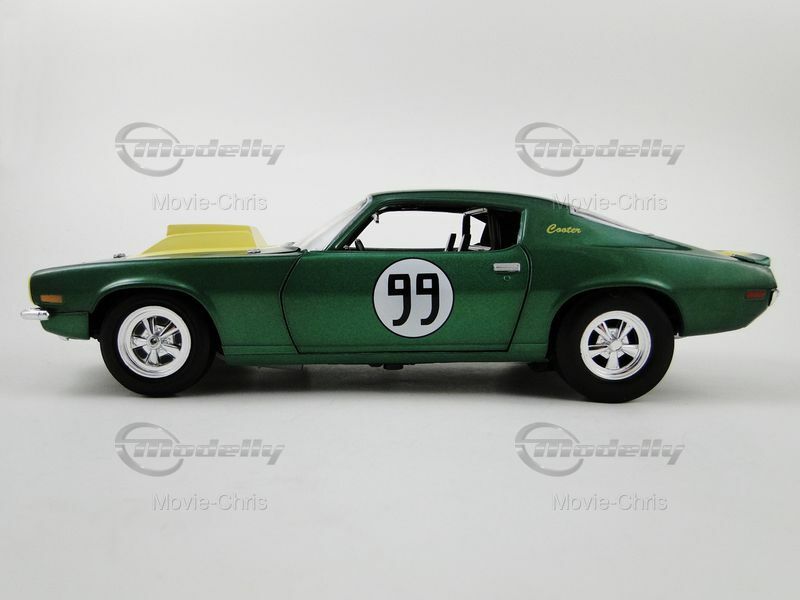 Das Modellauto im Maßstab 1:18, hergestellt von Johnny Lightning, ist eine detailgetreue Replik des Chevrolet Camaro 350. Der Modellauto ist in einem metallischen Grün lackiert, kombiniert mit auffälligen gelben Rennstreifen über die Motorhaube und das Dach. Die Startnummer 99 ist prominent an den Seiten des Modells angebracht. Weitere Details umfassen verchromte Felgen und akkurate Nachbildungen der Scheinwerfer und Rücklichter. Die Vinyldetails und Chromakzente betonen die sportliche Erscheinung. Das Modell ist Teil der Sammlung von Modelly-Mitglied „Movie-Chris“.