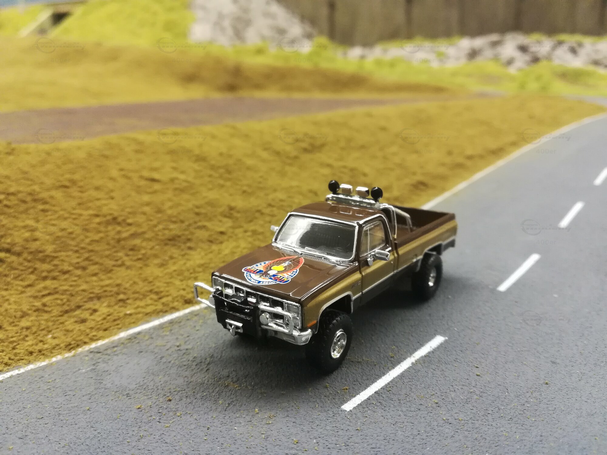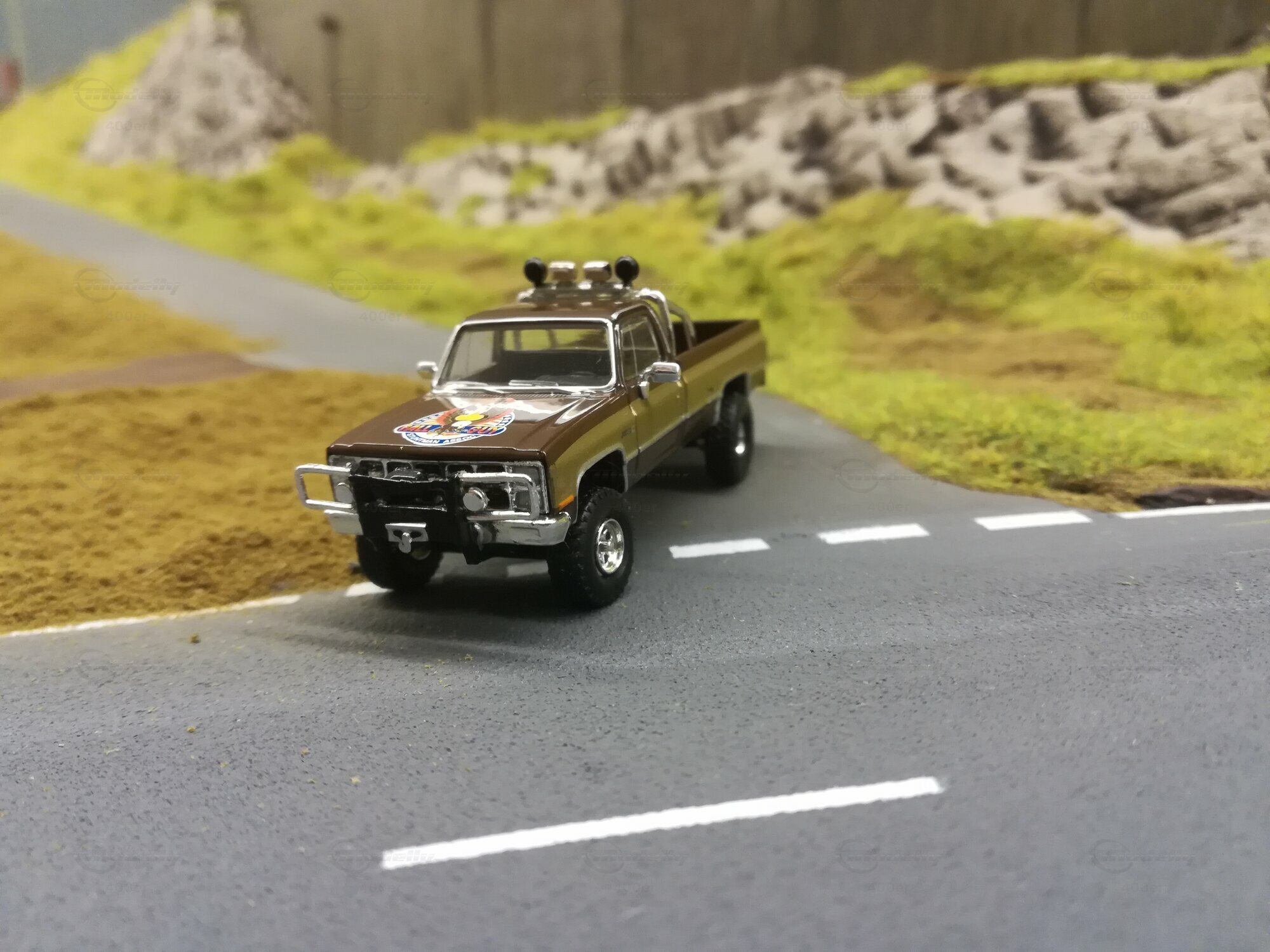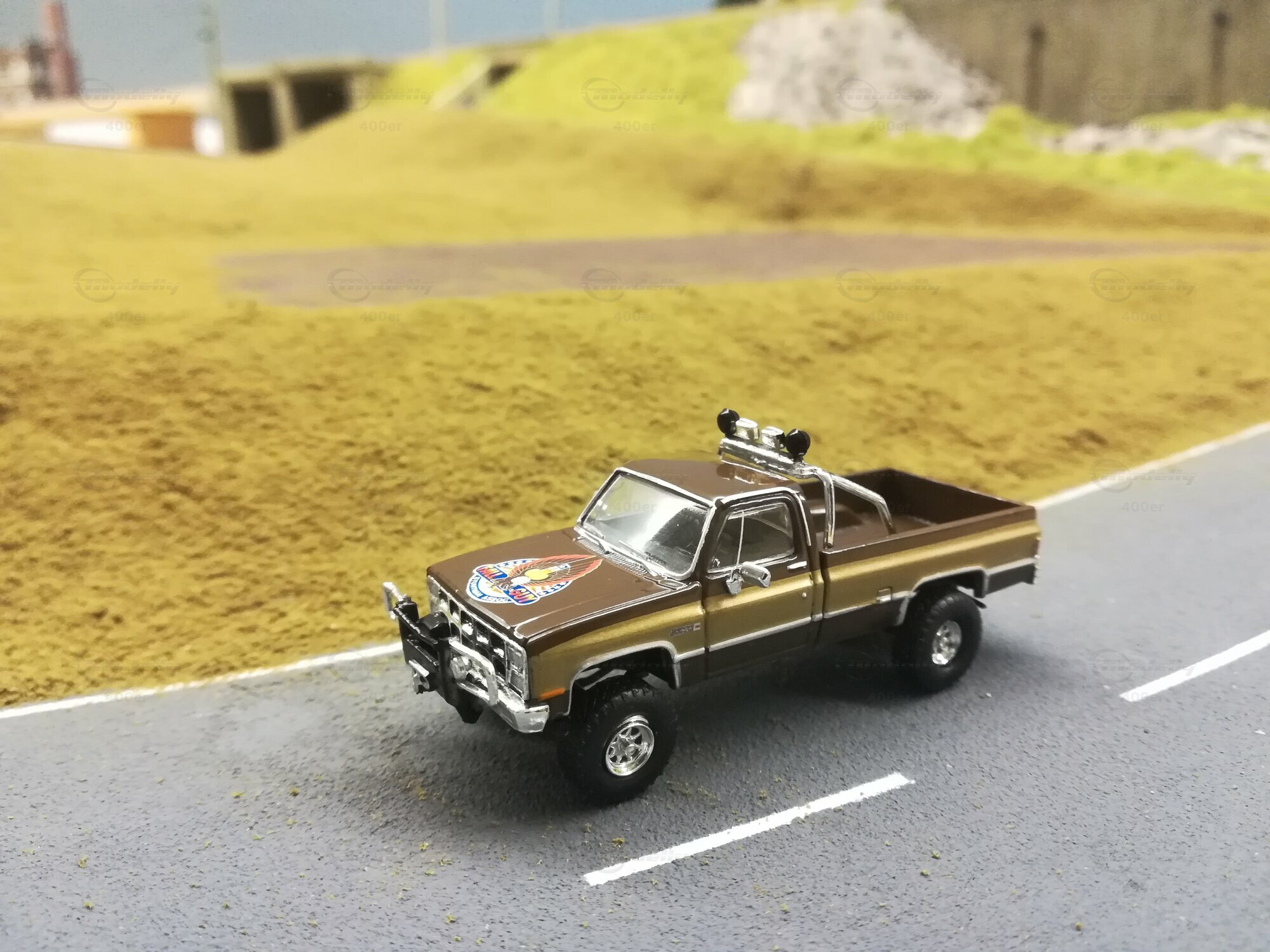 Die Miniaturausgabe des GMC Sierra, gefertigt im 1:87 Maßstab von Brekina, spiegelt die Essenz des Originalmodells wider. Die Miniatur besteht aus hochwertigem Kunststoff, was es ermöglicht, selbst kleinste Details präzise darzustellen. Die Modellbauspezialisten von Brekina haben darauf geachtet, das Modell so authentisch wie möglich zu gestalten. Auf den Fotos wird deutlich, dass das Modell eine kräftige braune Lackierung besitzt, die mit einem auffälligen Aufkleber auf der Motorhaube verziert ist. Diese Farbkombination ist charakteristisch und verleiht dem Modell einen besonderen Charme.