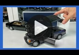 Der Lack des Miniaturwagens weist eine tief-schwarze Farbgebung mit dezenten Metallic-Effekten auf, die den Originalfarbtönen sehr nahe kommt. Auf der Seite des Fahrzeugs sind die charakteristischen Zierleisten zu sehen, die das hochwertige Design der W124-Serie unterstreichen. Die Felgen scheinen OEM-Mercedes-Felgen zu sein, was die Authentizität des Modells weiter unterstreicht. Das abnehmbare Verdeck des Cabriolets ist ein weiteres Highlight dieses Diecast-Modells und bietet Sammlern die Möglichkeit, das Fahrzeug sowohl als geschlossenes Coupé als auch als Cabrio darzustellen.