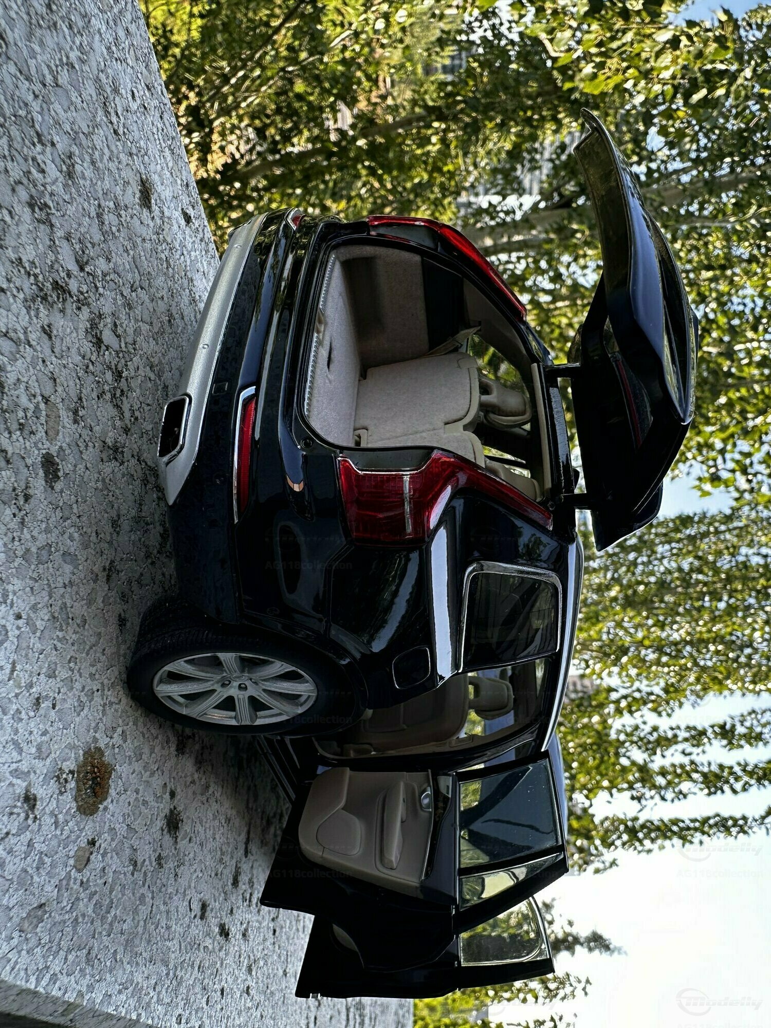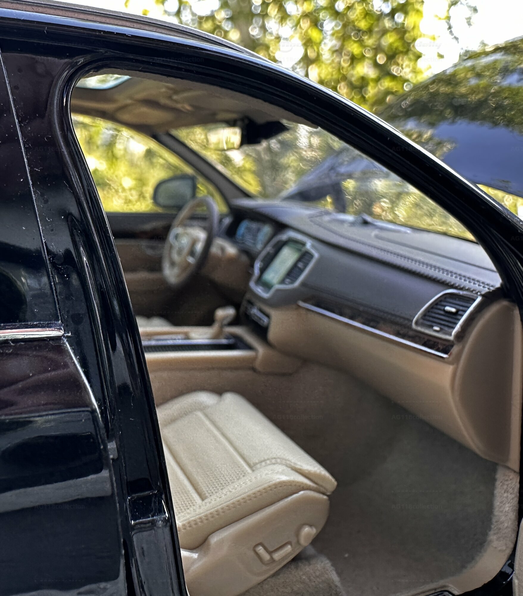 Die Miniatur ist hervorragend in der Karosserielackierung „Onyx Black“ lackiert, was ihr eine realistische und elegante optische Erscheinung verleiht. Die Liebe zum Detail erstreckt sich bis hin zu den originalgetreuen Innenraumdetails, einschließlich der akkuraten Nachbildung des Armaturenbretts, der Sitze und der Mittelkonsole. Auf den zur Verfügung gestellten Bildern ist deutlich zu erkennen, dass das Interieur in einem eleganten Beigeton gehalten ist, der die luxuriöse Atmosphäre des Innenraums perfekt einfängt. Speziell die sichtbaren Bedienelemente und Details im Cockpit des Modellfahrzeugs sind beeindruckend und lassen Sammlerherzen höherschlagen.