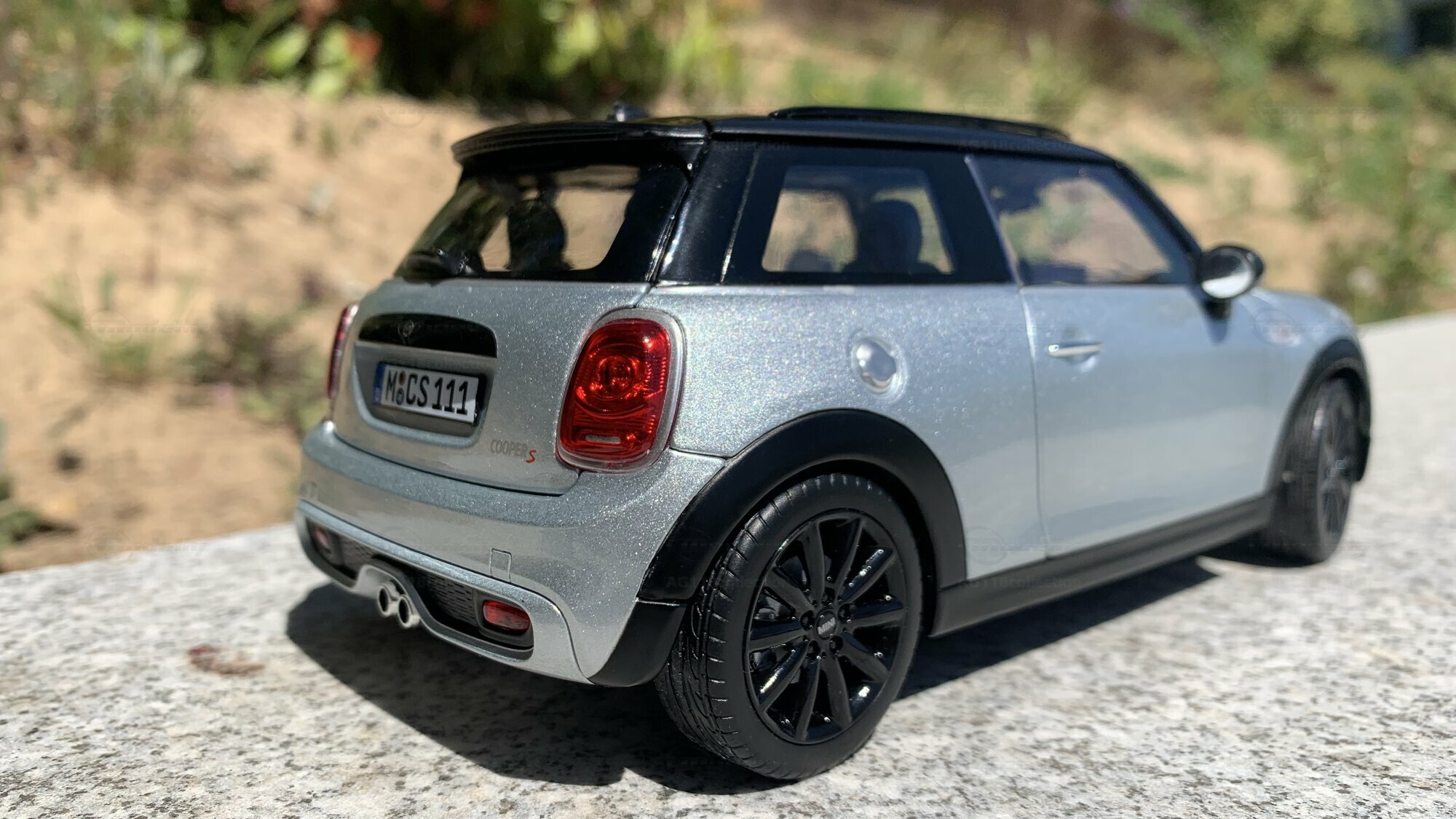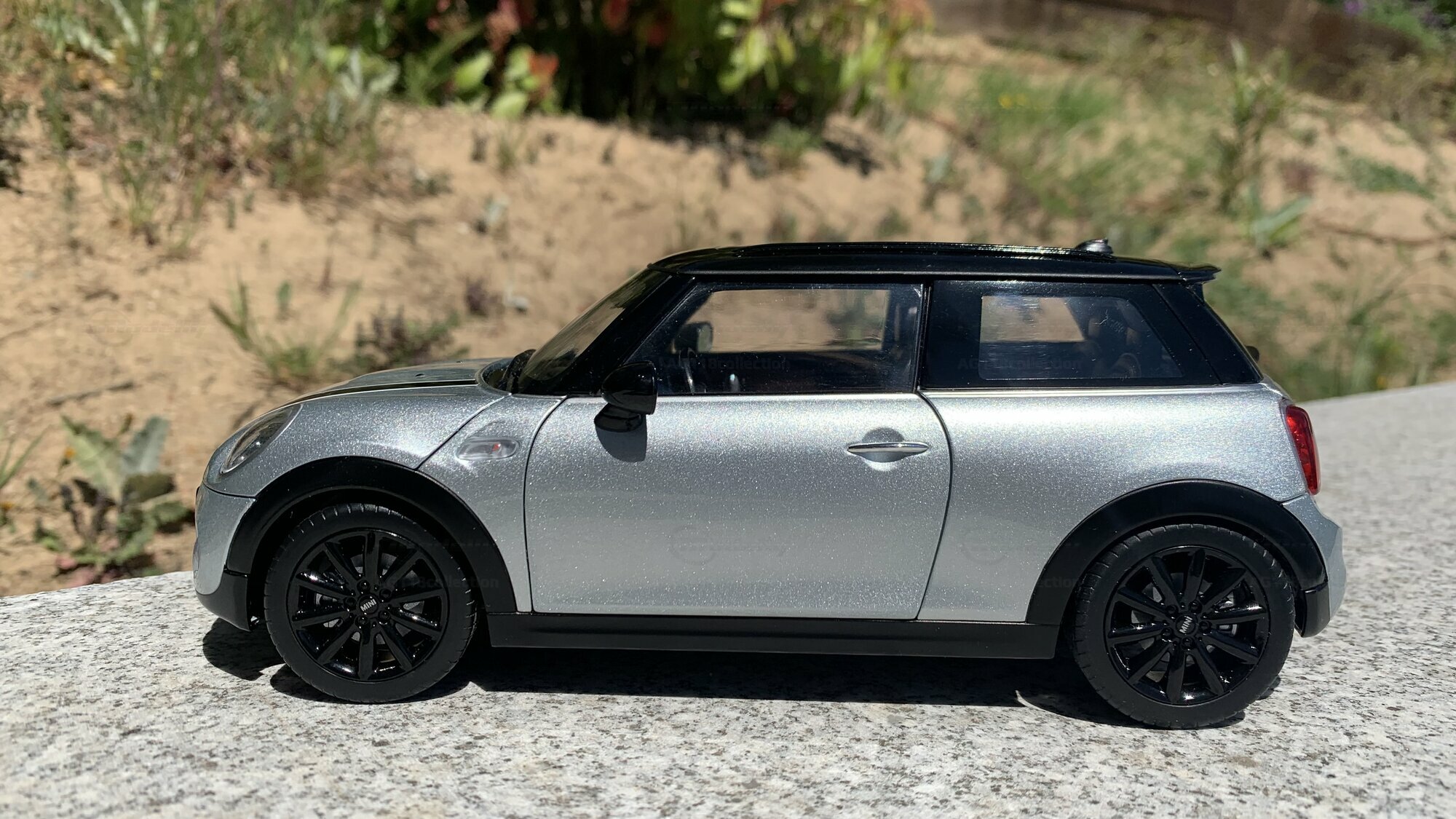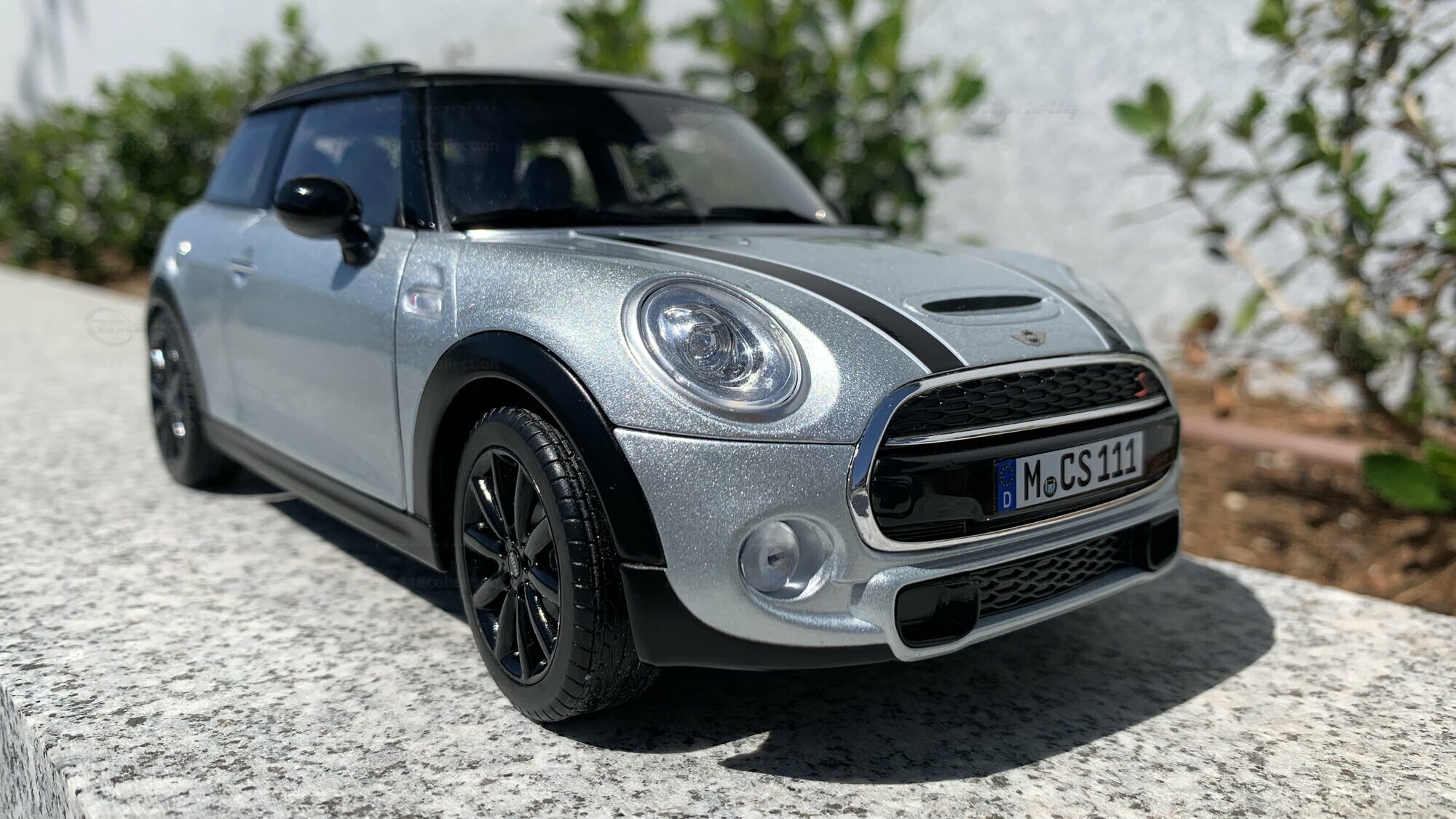 Das gezeigte 1:18 Modell von Norev beeindruckt durch seine realistische Lackierung in einem schimmernden Silberton, der den sportlichen Charakter des Originals unterstreicht. Auffällig sind die schwarzen Streifen auf der Motorhaube, die dem Modell zusätzlichen sportlichen Charme verleihen. Der farblich abgesetzte schwarze Dachhimmel und die Spiegelkappen ergänzen das stimmige Gesamtbild. Das Modell ist mit präzisen Details wie Türgriffen, Spiegeln und sogar der markanten Lufteinlasshaube auf der Motorhaube ausgestattet, die dem Mini Cooper S den typisch sportlichen Look verleihen. Präzise gefertigte Radsätze und Reifen tragen zu einer realistischen Wiedergabe bei.