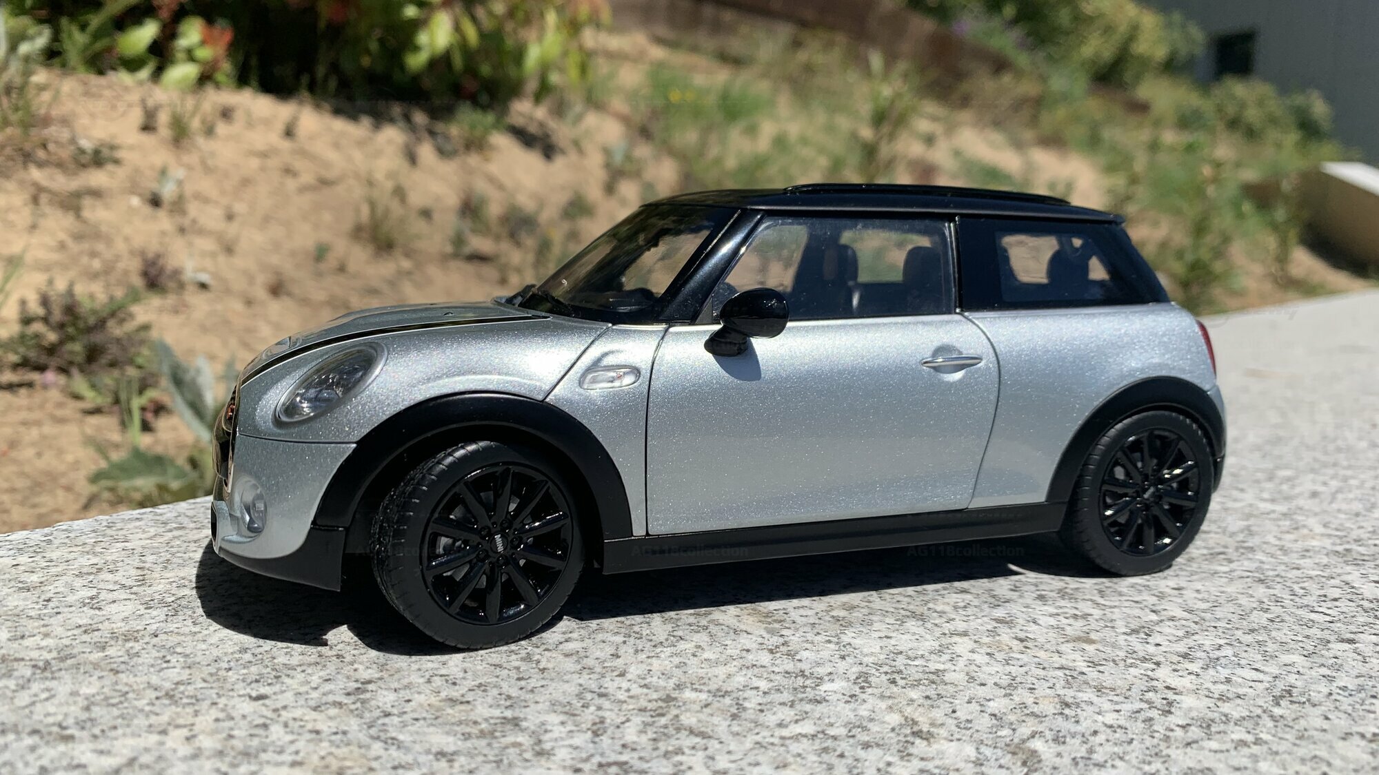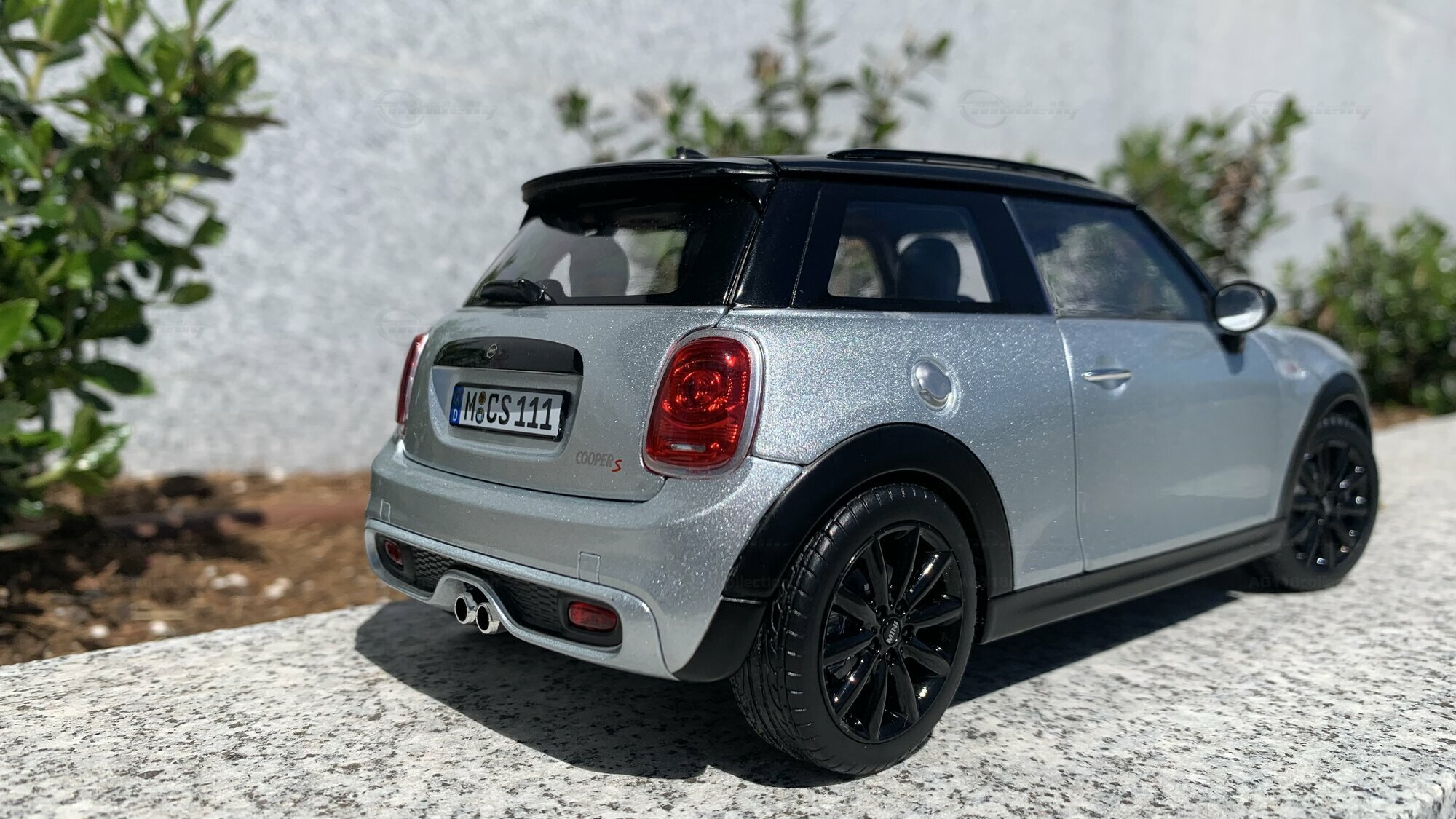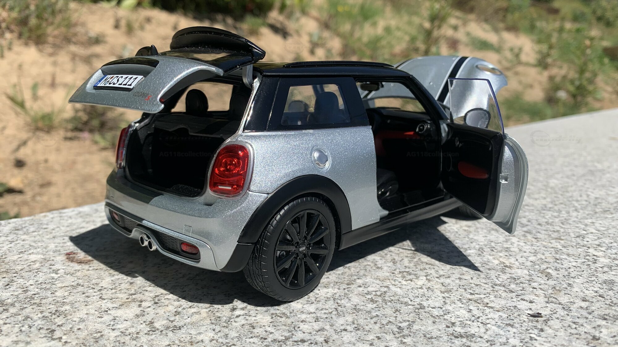 Das gezeigte 1:18 Modell von Norev beeindruckt durch seine realistische Lackierung in einem schimmernden Silberton, der den sportlichen Charakter des Originals unterstreicht. Auffällig sind die schwarzen Streifen auf der Motorhaube, die dem Modell zusätzlichen sportlichen Charme verleihen. Der farblich abgesetzte schwarze Dachhimmel und die Spiegelkappen ergänzen das stimmige Gesamtbild. Das Modell ist mit präzisen Details wie Türgriffen, Spiegeln und sogar der markanten Lufteinlasshaube auf der Motorhaube ausgestattet, die dem Mini Cooper S den typisch sportlichen Look verleihen. Präzise gefertigte Radsätze und Reifen tragen zu einer realistischen Wiedergabe bei.