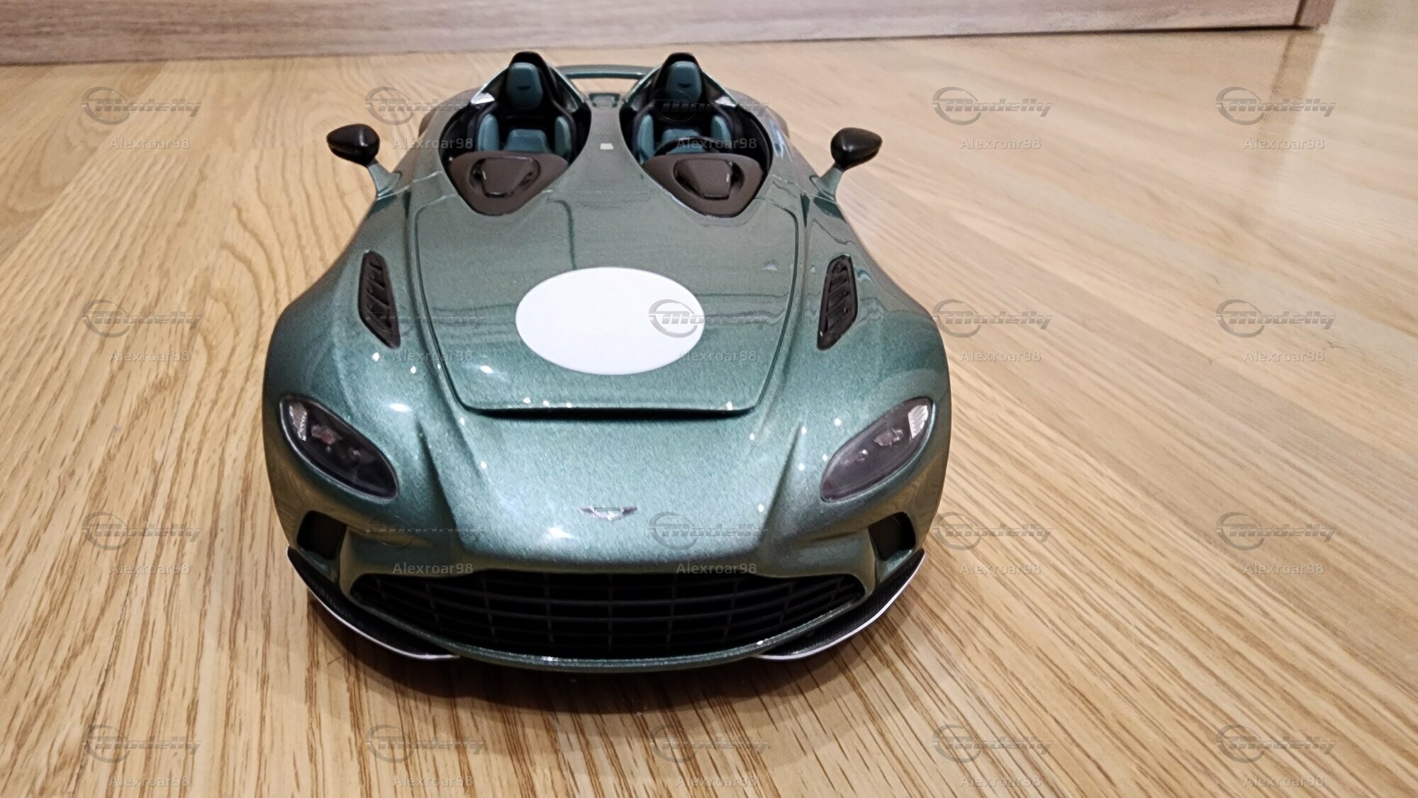 Die Miniatur des Aston Martin V12 Speedster in 1:18 Scale von GT Spirit besticht durch ihre hervorragende Detailtreue. Der Lack in einem metallic-grünen Farbton hat eine besondere Tiefe und Glanz, die das Erscheinungsbild des Originals exakt widergeben. Die aufgesetzten weißen Rennstreifen und Kreise verleihen dem Modell eine sportliche Note, die an die historischen Rennwagen erinnert. Auch die charakteristischen Luftauslässe und der markante Kühlergrill sind exakt nachgebildet. Die Sitze im Innenraum, ebenfalls detailliert nachgebildet, weisen das typische Aston Martin Design auf. Ein weiteres Highlight sind die Felgen von Michelin Pilot Sport, die dem Modell einen dynamischen Touch verleihen.