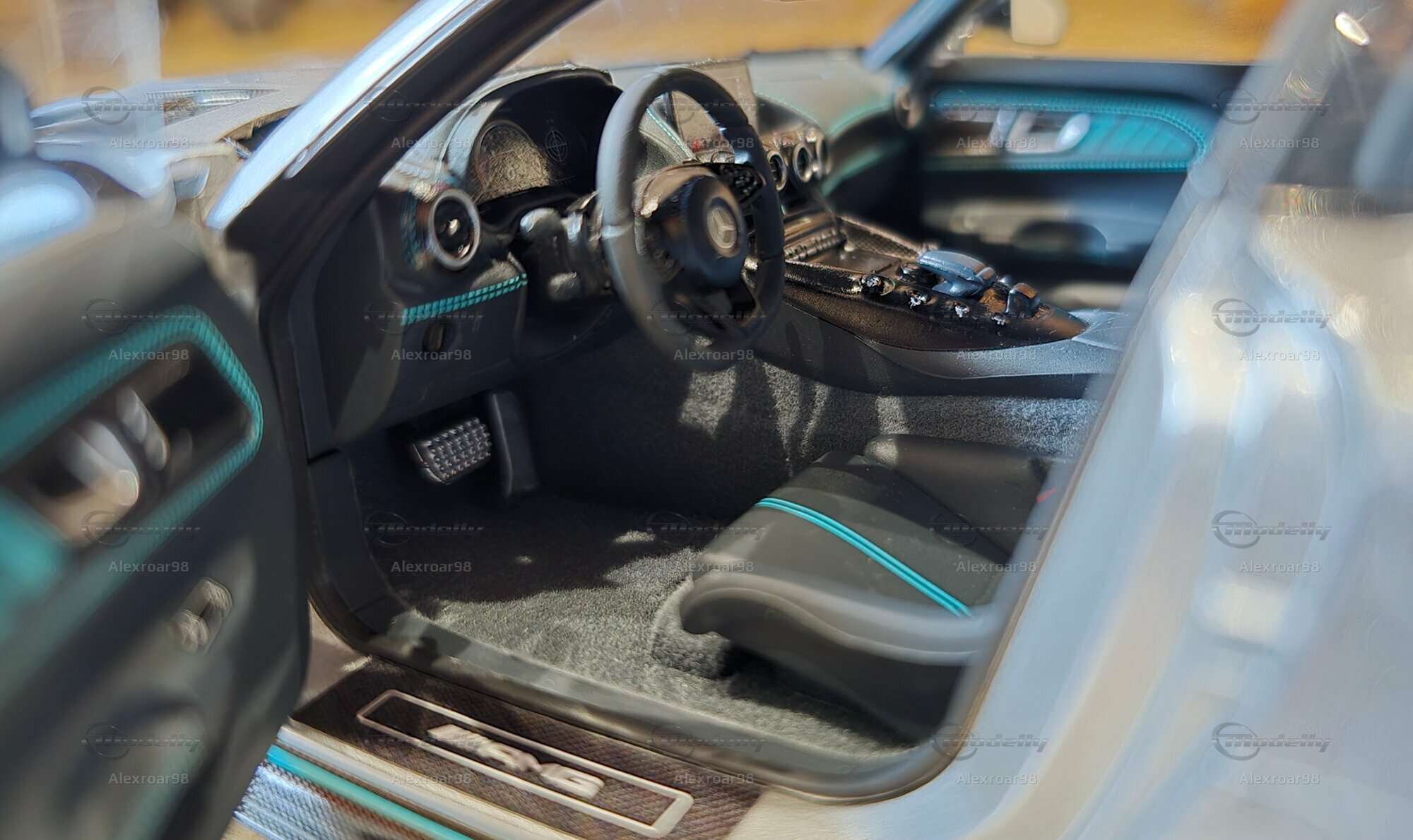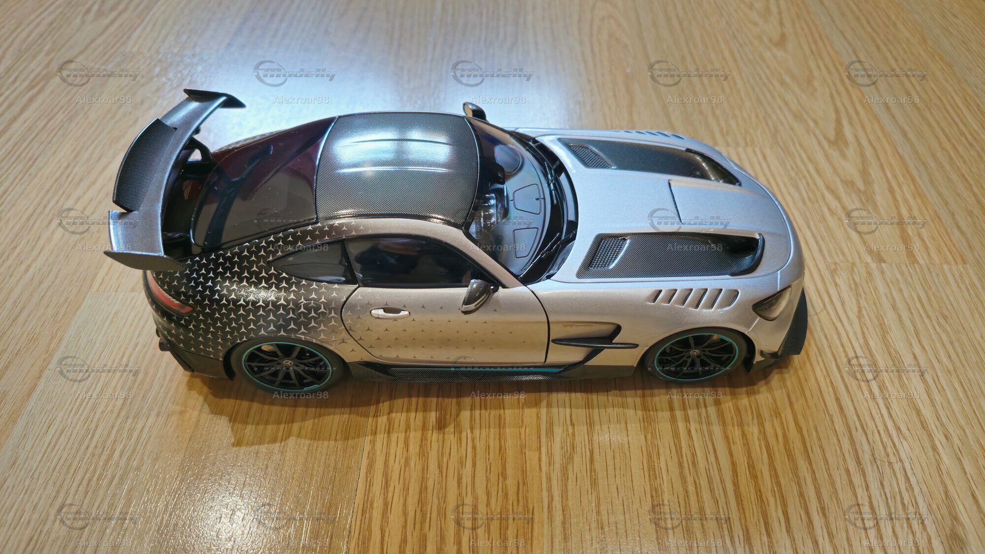 Die Lackierung des Modells ist besonders herausragend und fängt das markante Erscheinungsbild des Originals perfekt ein. Die silberne Grundfarbe des Fahrzeugs wird durch einen schwarzen Ton ergänzt, der den markanten Flügel, den Dachbereich und die Motorhaube abdeckt. Feine Details wie die aufgedruckten Sterne auf dem hinteren Bereich des Modells spiegeln die Designästhetik wider, die auch beim Original zu sehen ist. Das Modellauto besticht durch eine außergewöhnliche Detailtreue, sei es in der Gestaltung der Seitenlinien oder der Form der Außenspiegel. Diese Attribute bieten den Sammlern die Gelegenheit, die Eleganz und Ingenieurskunst des echten Mercedes-Benz AMG GT Black Series im Miniaturformat zu erleben.