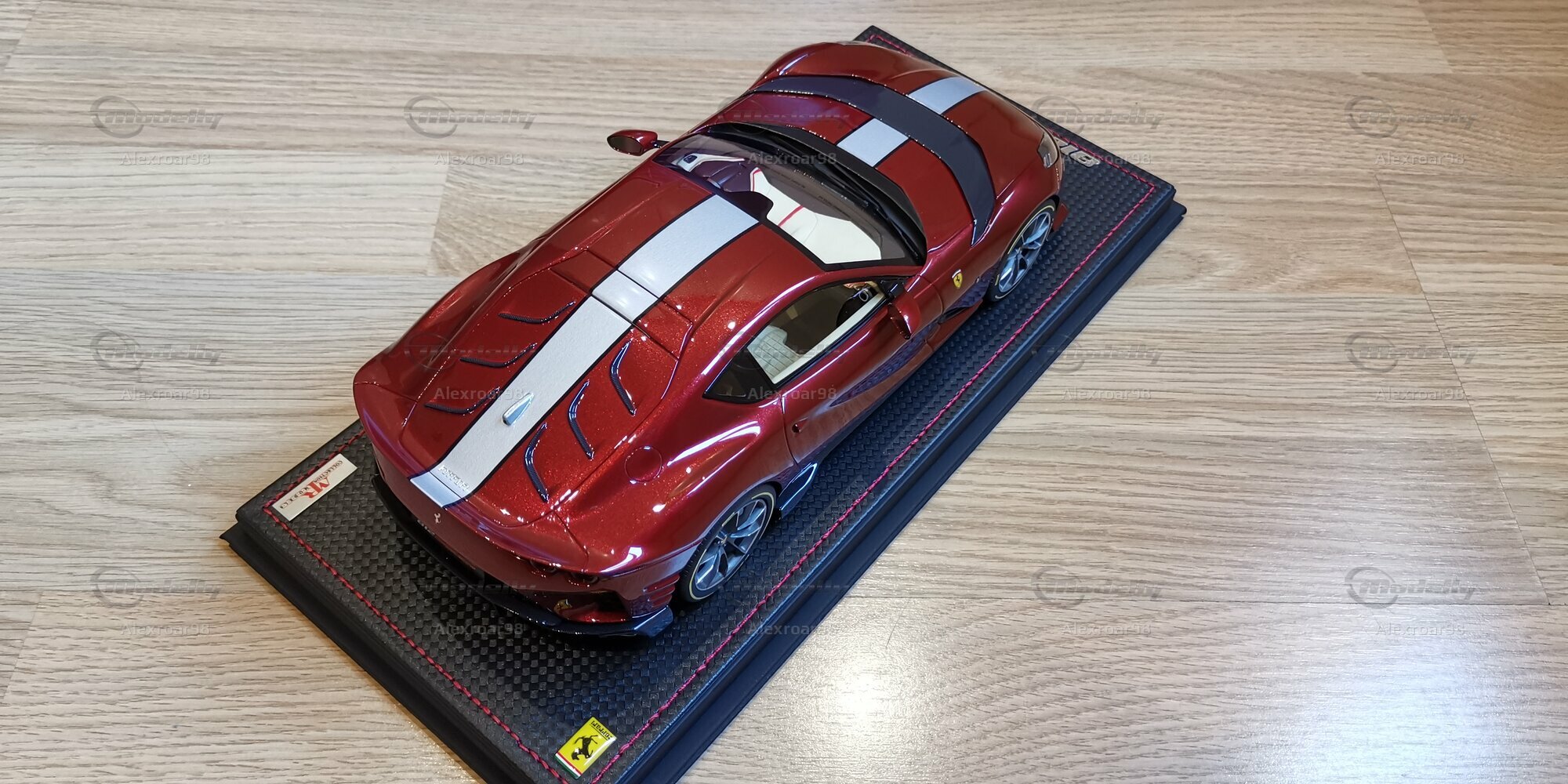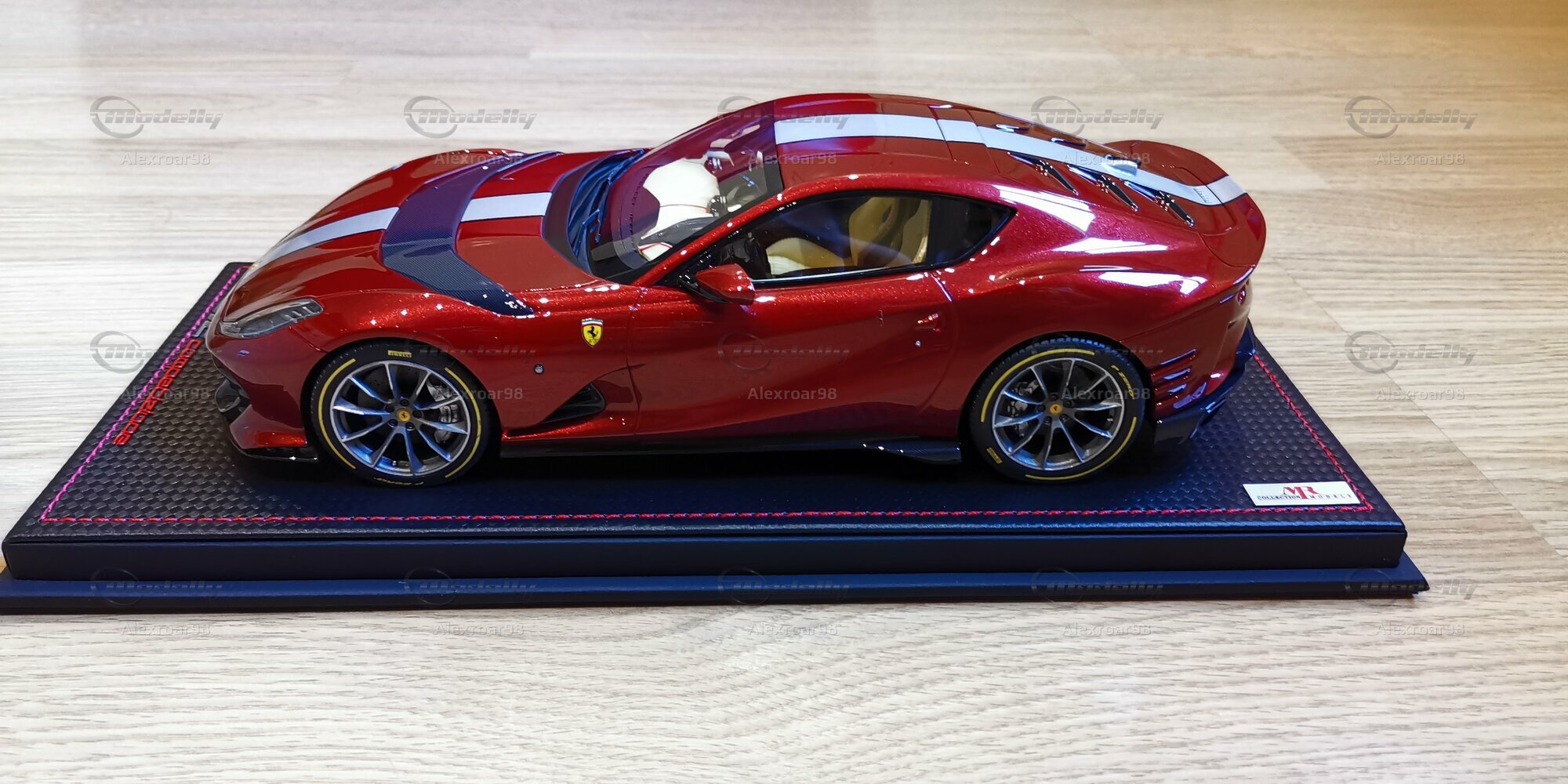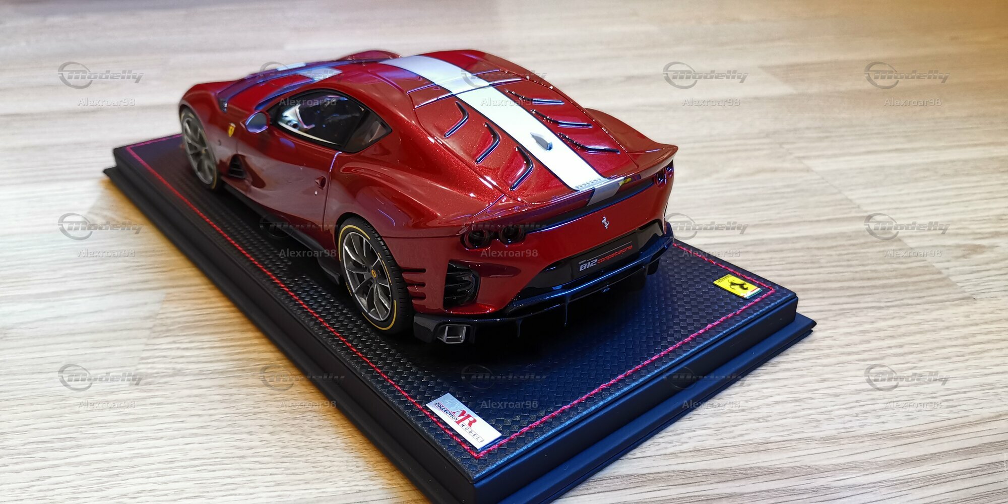 Für Modellauto-Enthusiasten und -Sammler ist dieses Modell des Ferrari 812 Competizione im 1:18 Maßstab ein wahres Highlight. Hergestellt von MR Models, zeichnet sich dieses Modell durch seine exakte Detailgenauigkeit und hochwertige Verarbeitung aus. Besonders bemerkenswert ist die Verwendung von Resin, das eine präzise Nachbildung der feinen Details ermöglicht. Die Lackierung des Modells ist in einem tiefen Rot gehalten, das perfekt den unverwechselbaren Glanz des Originals einfängt. Der schwarze Kohlefaserlook, der sich über die Motorhaube erstreckt, und die weißen Zierstreifen fügen einen Hauch von Exklusivität hinzu.