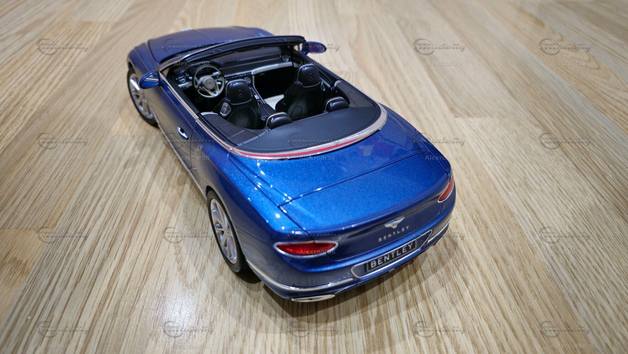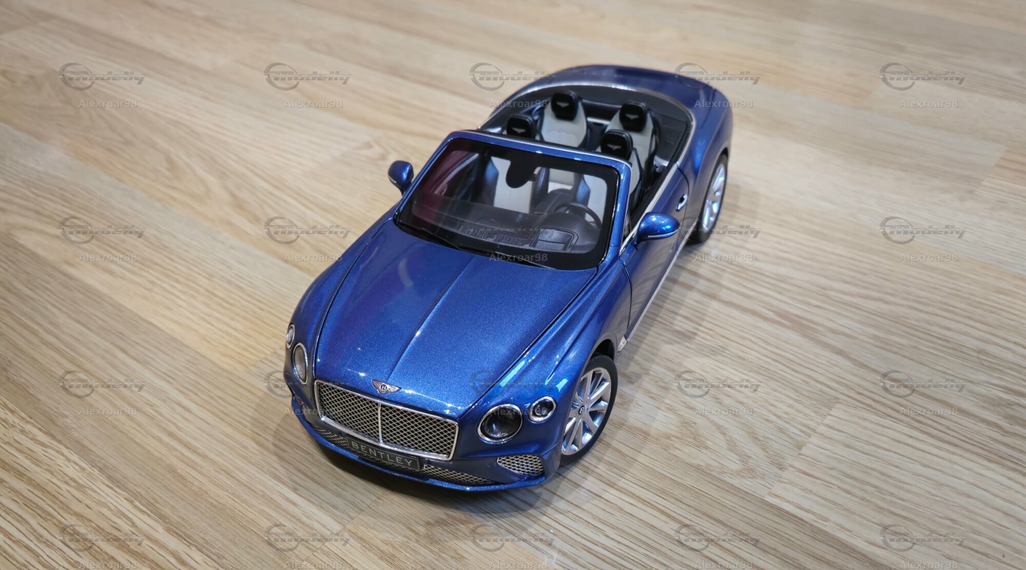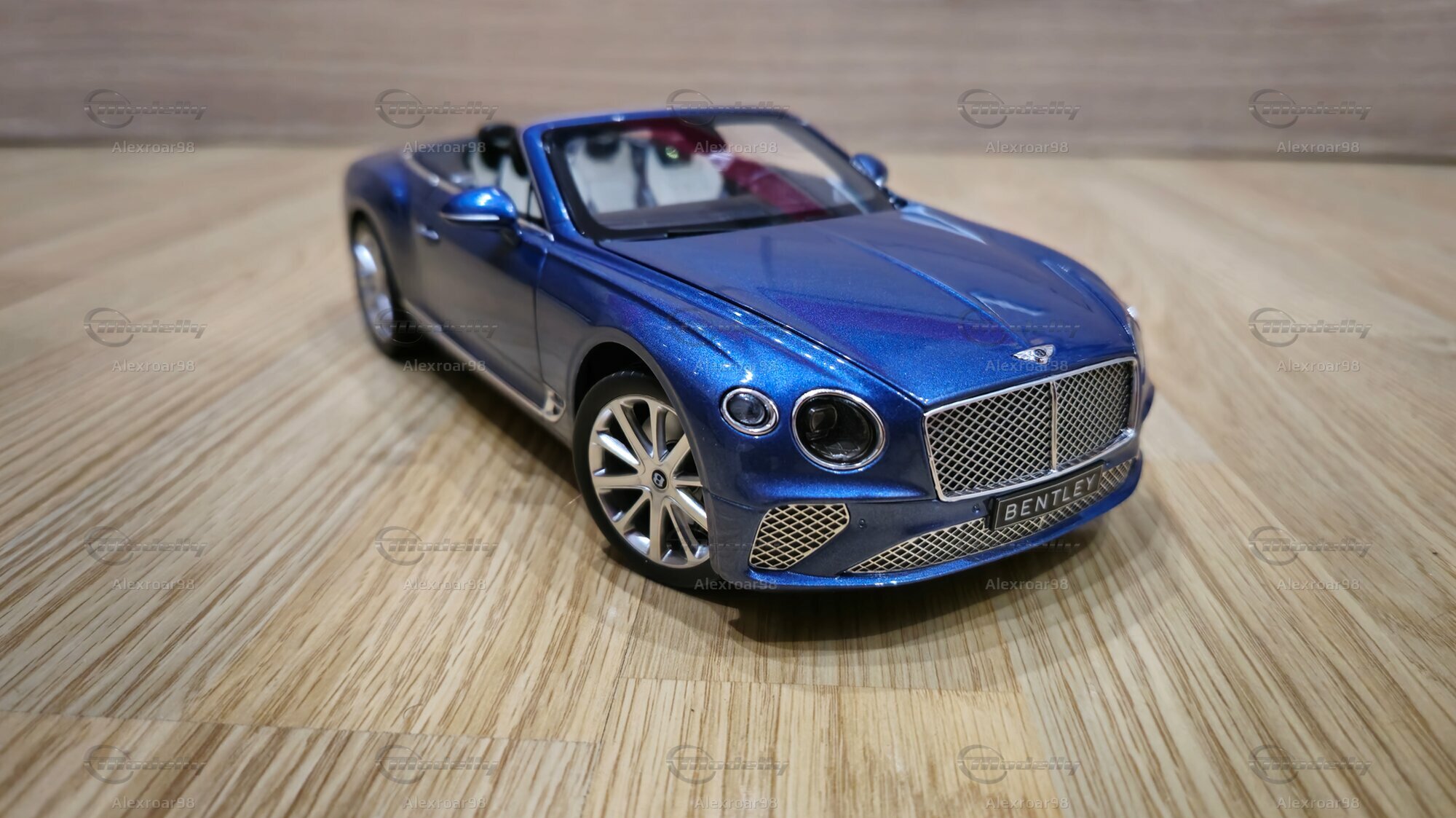 Der Lack des Modells in einem metallischen Blau zeigt eine klare, reflektierende Oberfläche, die die Eleganz des Originals einfängt. Die Innenausstattung ist detailliert dargestellt, mit deutlich sichtbaren Sitzen, Verkleidungen und Bedienelementen. Auch die Speichenfelgen und der Bentley-typische Kühlergrill werden präzise nachgebildet. Ein besonderes Highlight ist die sichtbare Bentley-Plakette auf der Fahrzeugfront und -rückseite, die die Zugehörigkeit zur Luxusmarke unterstreicht.