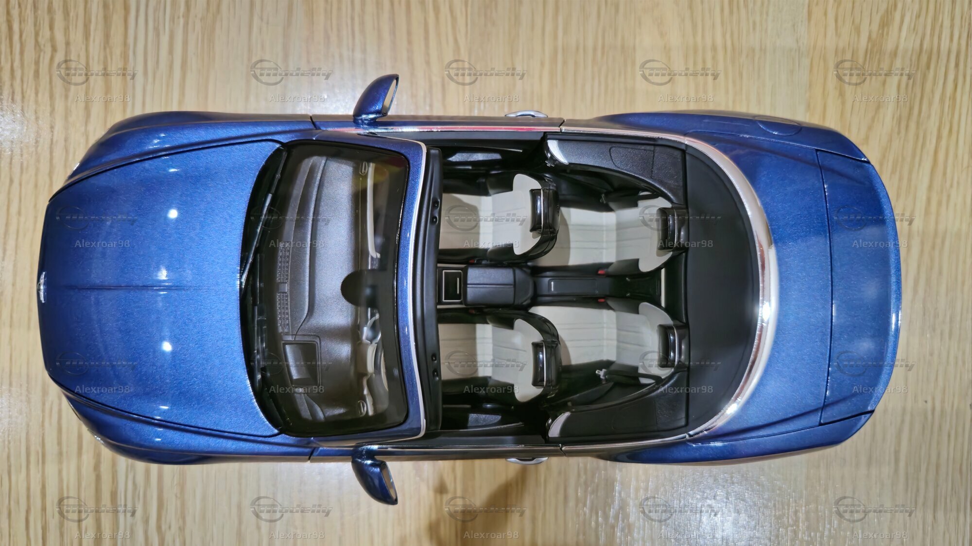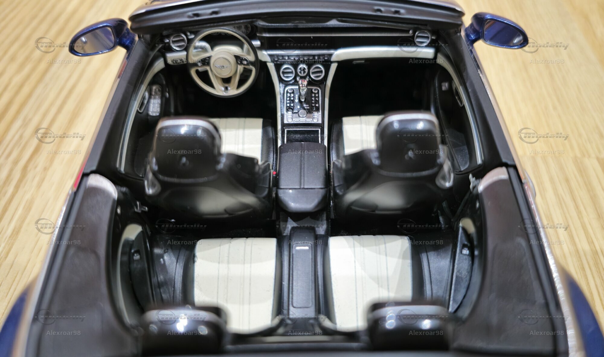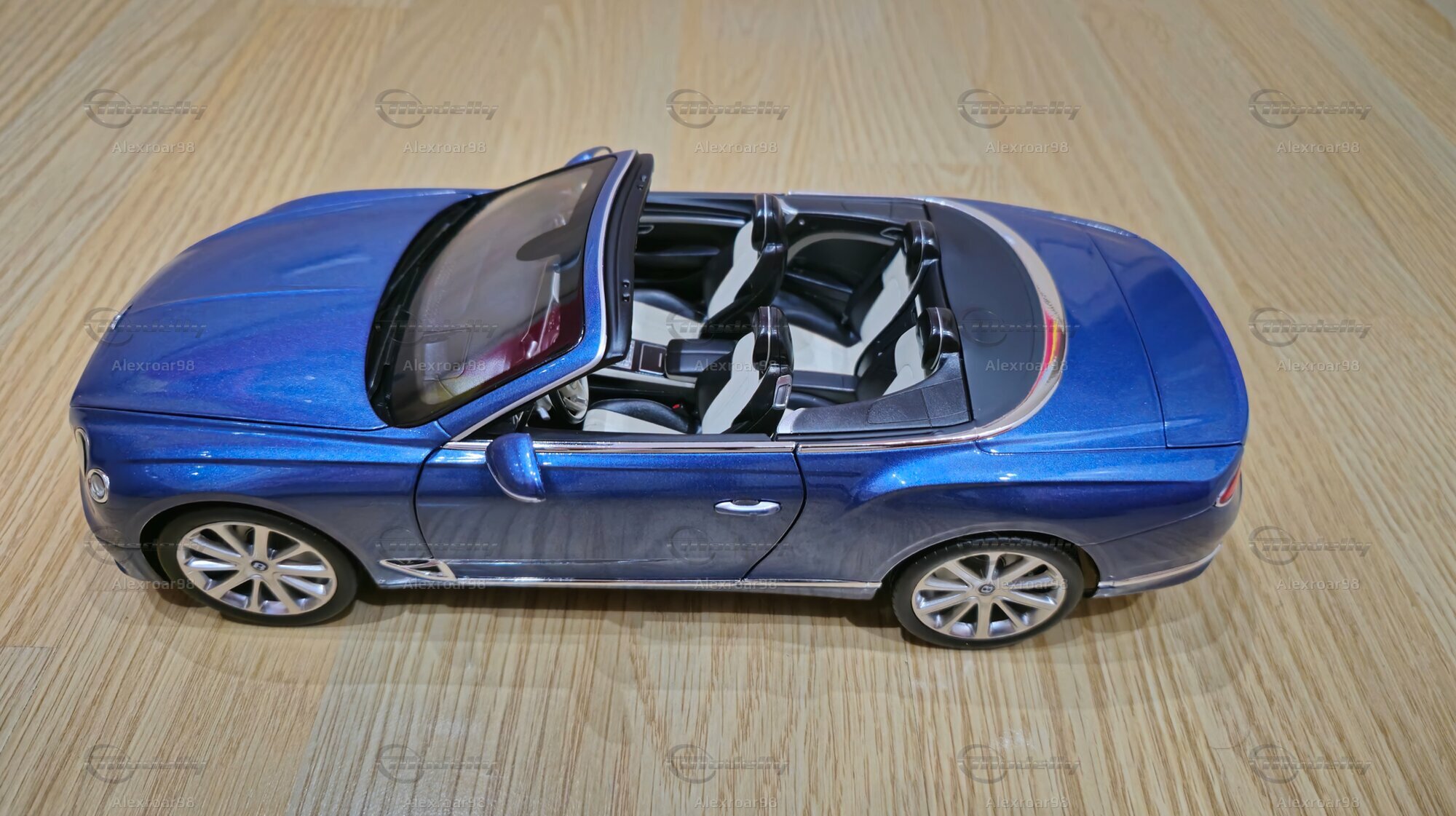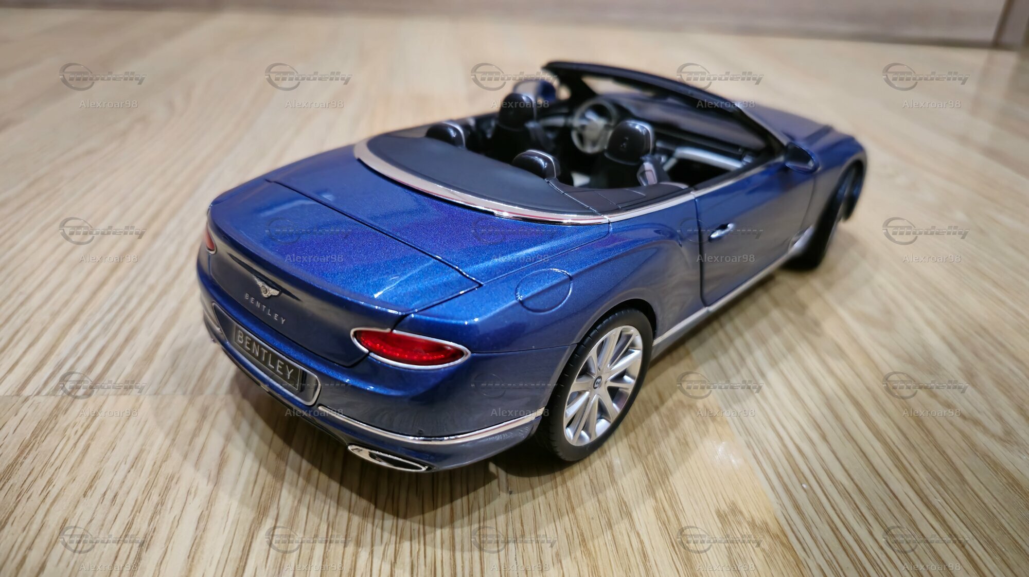 Der Lack des Modells in einem metallischen Blau zeigt eine klare, reflektierende Oberfläche, die die Eleganz des Originals einfängt. Die Innenausstattung ist detailliert dargestellt, mit deutlich sichtbaren Sitzen, Verkleidungen und Bedienelementen. Auch die Speichenfelgen und der Bentley-typische Kühlergrill werden präzise nachgebildet. Ein besonderes Highlight ist die sichtbare Bentley-Plakette auf der Fahrzeugfront und -rückseite, die die Zugehörigkeit zur Luxusmarke unterstreicht.