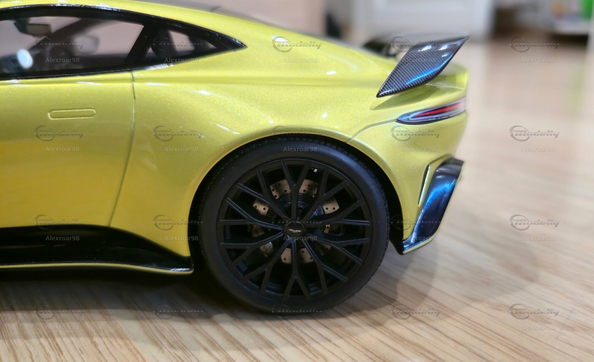 Auffällig bei diesem Modell im Maßstab 1:18 von Top Speed Models ist die deutlich sichtbare Zweifarblackierung: Die Karosserie ist in einem kräftigen Gelbton gehalten, ergänzt durch ein detailliertes Carbondekor auf Haube, Dach und Heckspoiler. Dies spiegelt die Farboptionen wider, mit denen Aston Martin seine Hochleistungsfahrzeuge oft ausstattet. Die Felgen sind im Design des Originals gehalten, bestehen jedoch im Modell aus schwarz lackiertem Material und weisen eine typische Mehrspeichenoptik auf. Auf der Heckpartie ist die Beschriftung „ASTON MARTIN“ sowie „VANTAGE“ detailgetreu aufgebracht. Das Modell ist ein limitiertes Sondermodell, was in Sammlerkreisen den Wert erheblich steigert. Eine Limitierungsnummer oder ein Hinweis auf die Stückzahl findet sich in der Regel an der Unterseite oder auf der Verpackung, es handelt sich hierbei um ein streng limitiertes Sammlerstück.