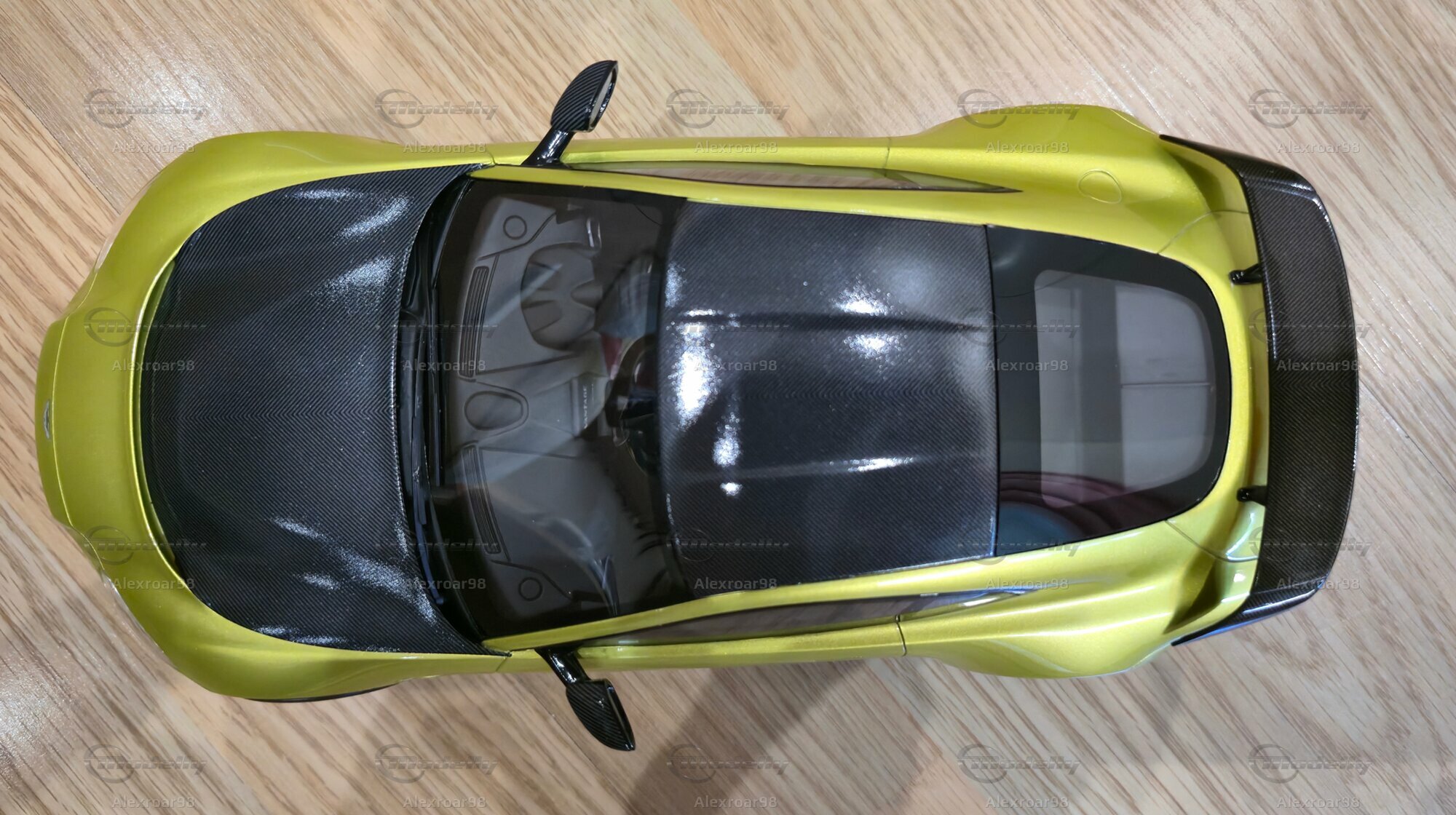 Das gezeigte Modellfahrzeug in der Sammlung von Modelly-Mitglied „Alexroar98“ ist ein detailgetreues Sammlerstück im Maßstab 1:18, das von Top Speed Models produziert wurde. Bei diesem Miniaturmodell handelt es sich um eine Nachbildung aus Resin, einem hochwertigen Verbundmaterial, das besonders für die präzise Reproduktion von feinen Details geschätzt wird. Zu den sichtbar nachgebildeten Merkmalen gehört die charakteristische Karosserielinie des Originals, inklusive des markanten Carbonmotivs auf Motorhaube, Dach und Heckspoiler – Elemente, die im realen Fahrzeug das Leistungsgewicht optimieren. Typische Details wie die schwarzen Aerodynamik-Elemente an den Seitenschwellern und der große Heckflügel sind bei diesem Modell ebenfalls exakt umgesetzt. Auch die Spiegelkappen sind mit einer Carbonstruktur nachgebildet. Der Innenraum spiegelt die komplexe Gestaltung des Originals wider, darunter die stark konturierten Sportsitze und die Mittelkonsole mit den Bedienelementen.