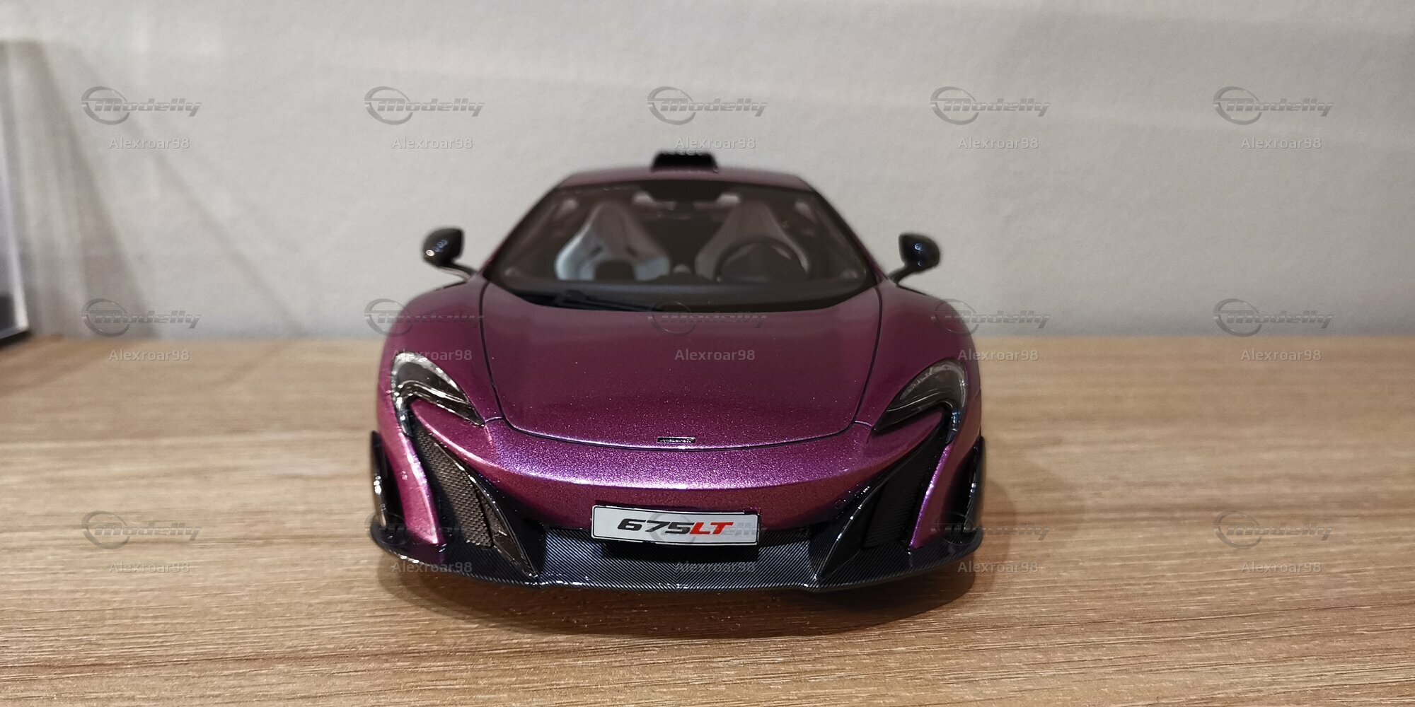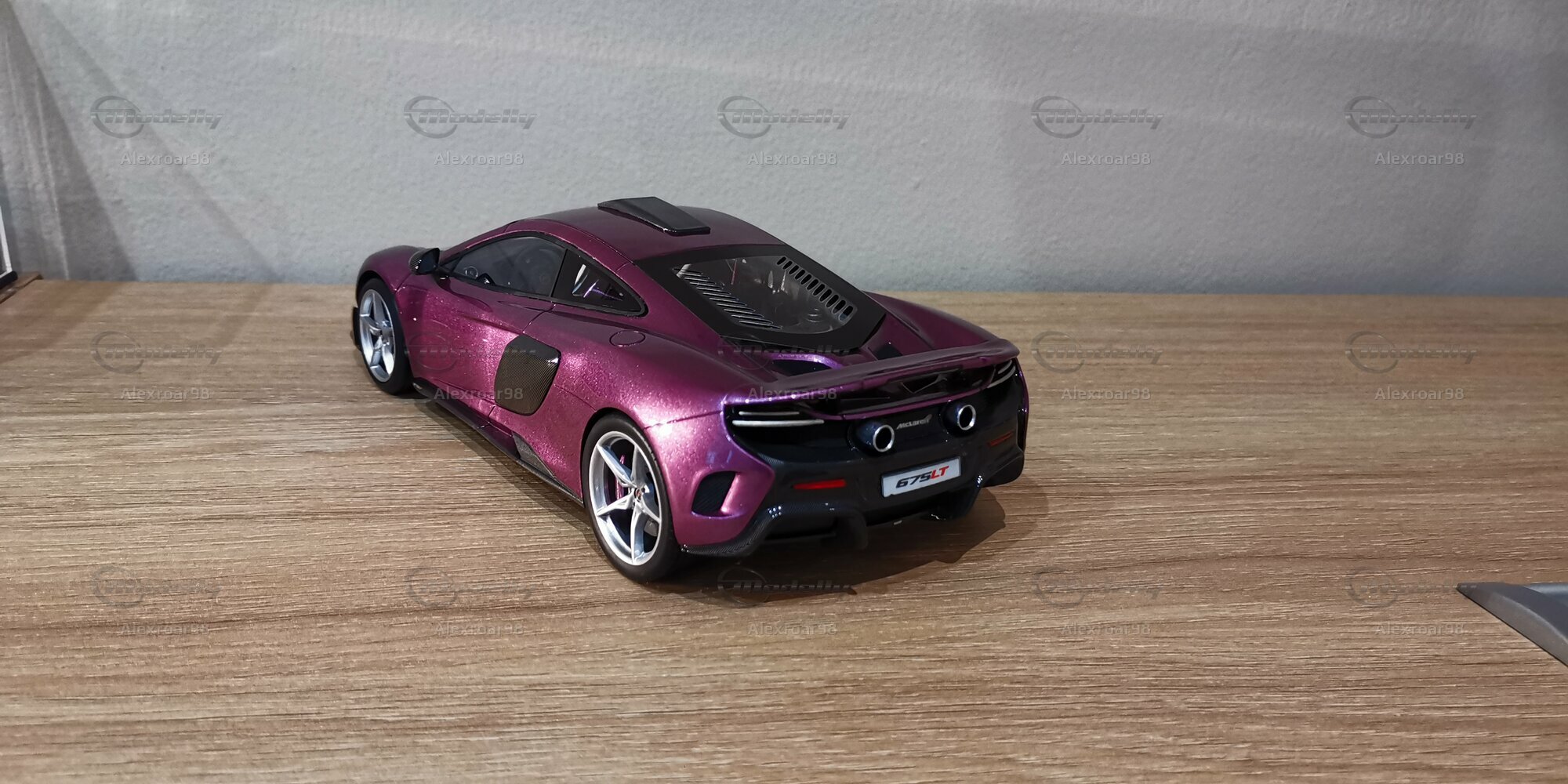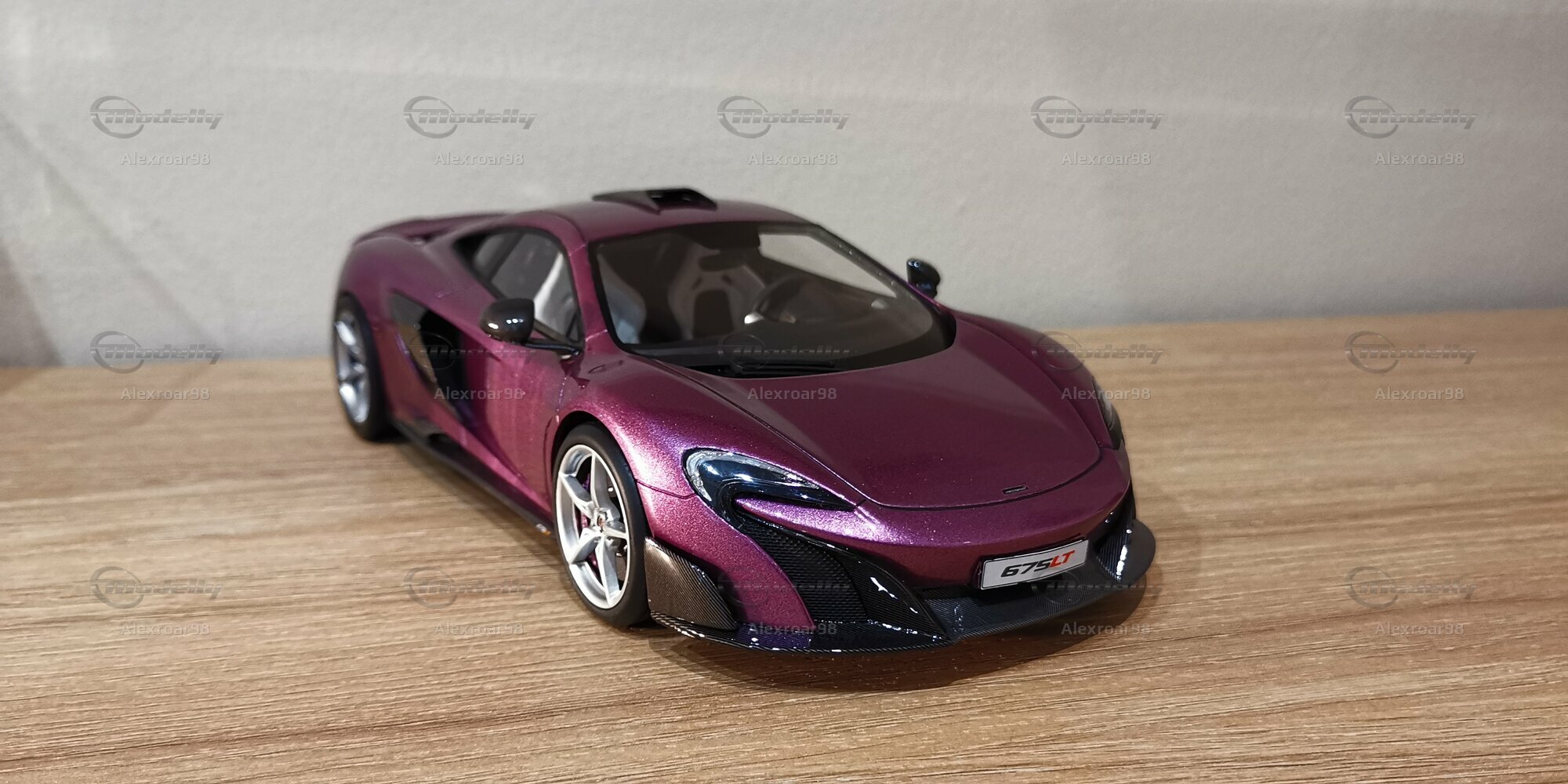 Dieses Modellauto im 1:18 Maßstab, hergestellt von Top Speed Models, ist eine exakte Nachbildung des legendären McLaren 675 LT. Die Miniatur zeigt beeindruckende Liebe zum Detail und exzellente Handwerkskunst, die die markanten Linien und die aerodynamischen Elemente des Originals akribisch nachahmt. Das Modell ist aus hochwertigem Resin gefertigt, was es robust und langlebig macht. In der Sammlung von "Alexroar98" auf Modelly sticht dieses Modell besonders hervor durch seine detailgetreue Umsetzung und die besondere Lackierung. Die Miniatur zeigt ein elegantes Metallic-Violett, das im richtigen Licht prachtvoll schimmert. Die Frontpartie wird durch die charakteristischen Lufteinlässe und die nachgebildeten Frontscheinwerfer dominiert, die in der Realität zur optimalen Kühlung des Motors und der aerodynamischen Effizienz beitragen.