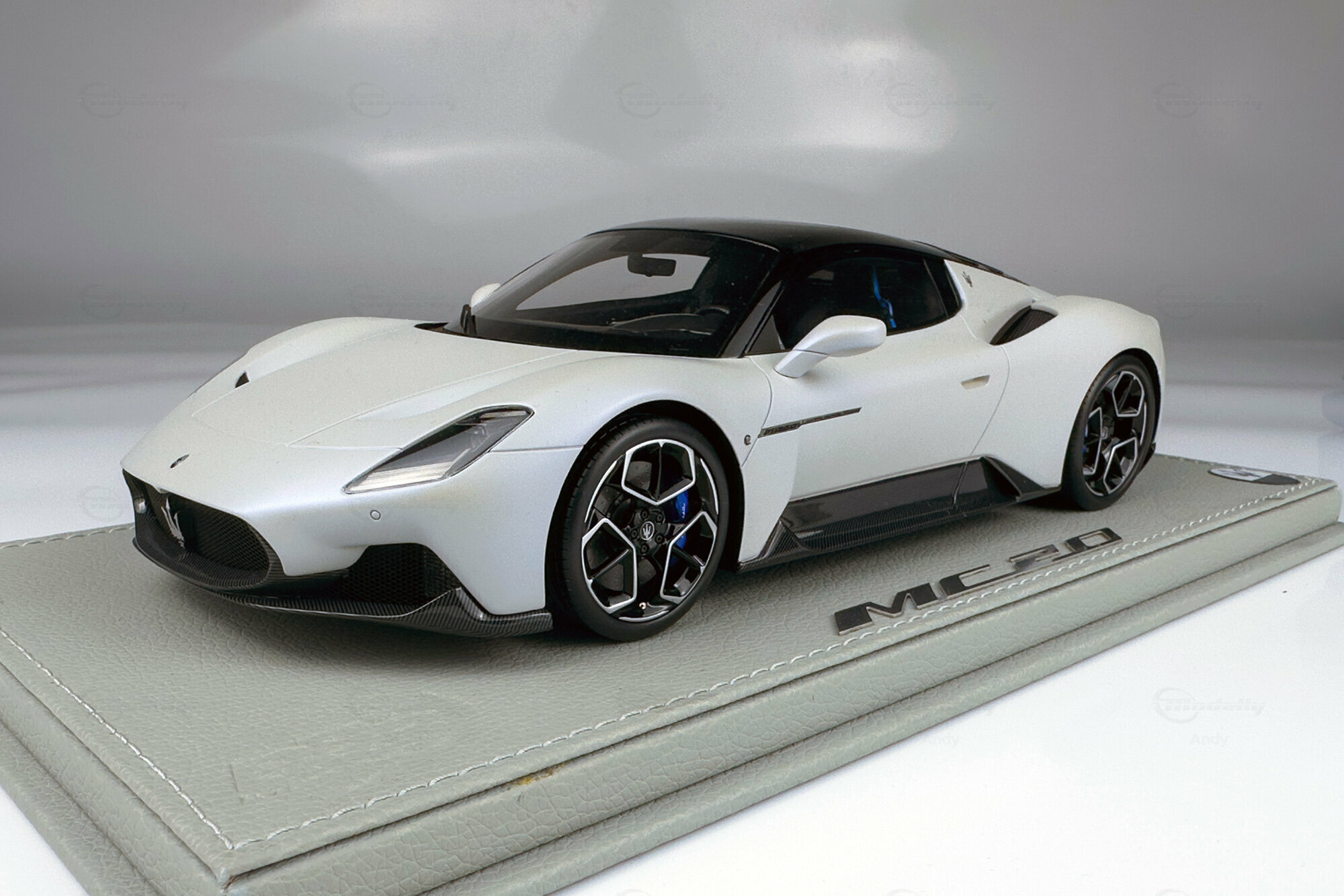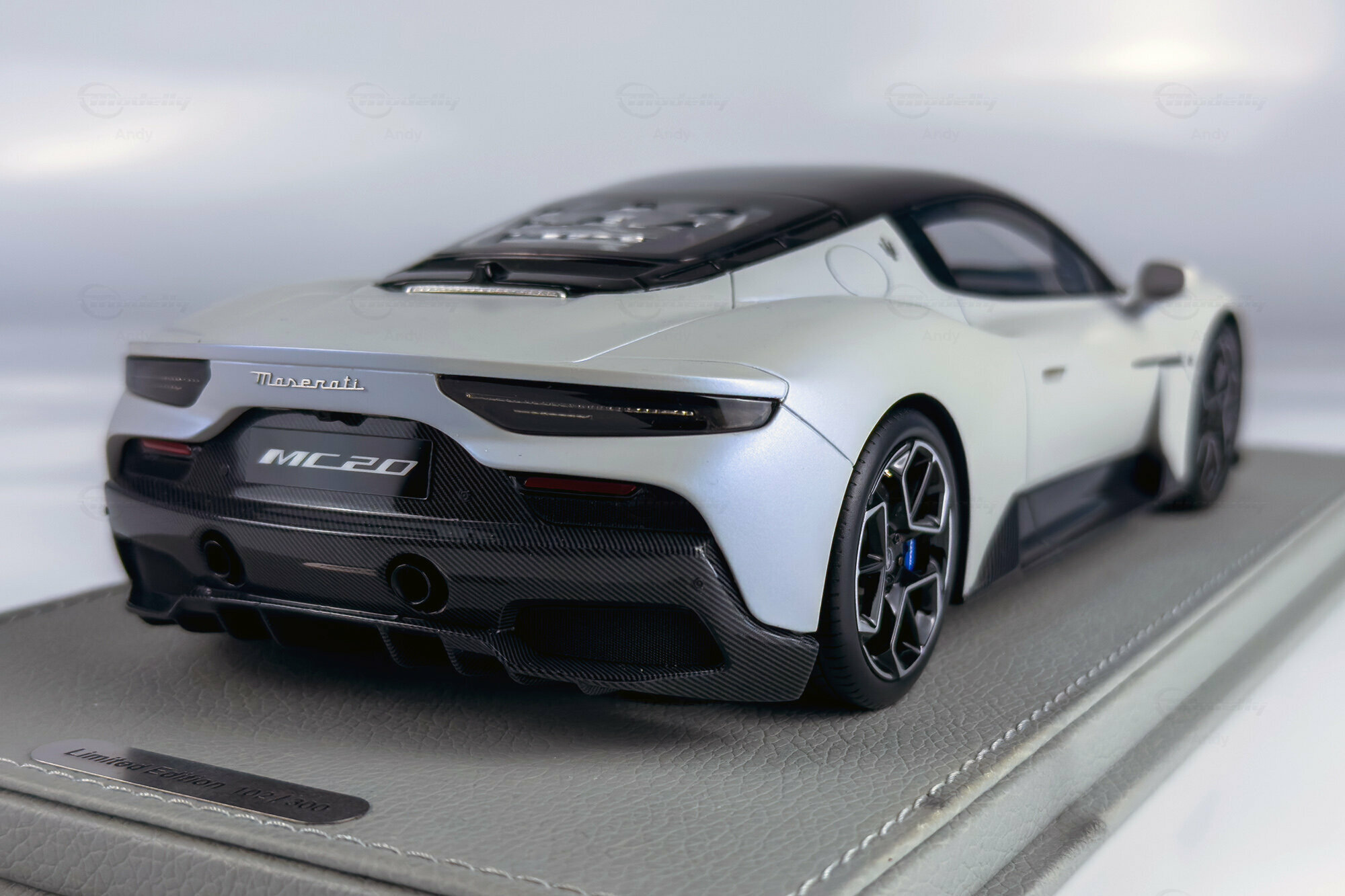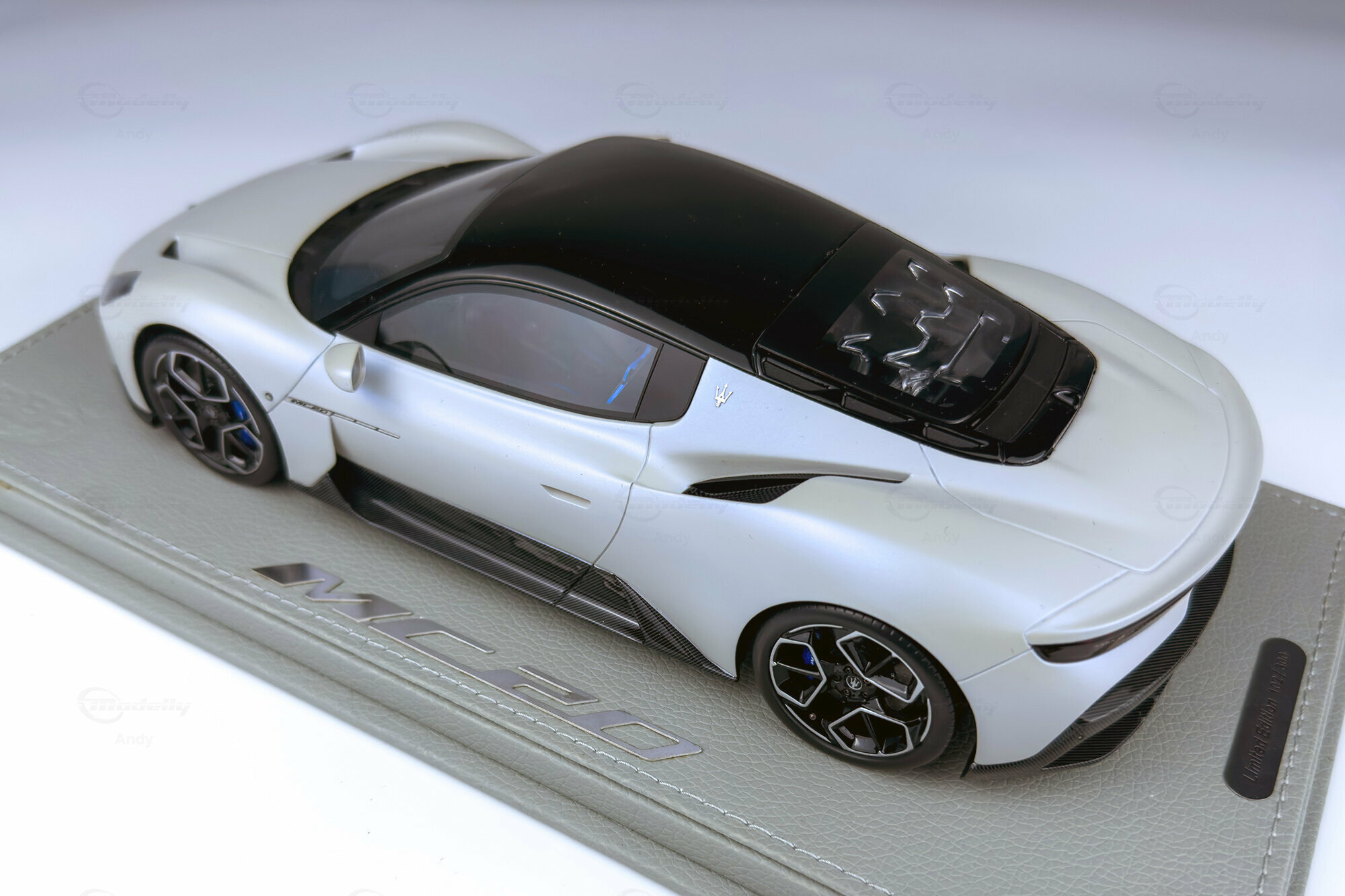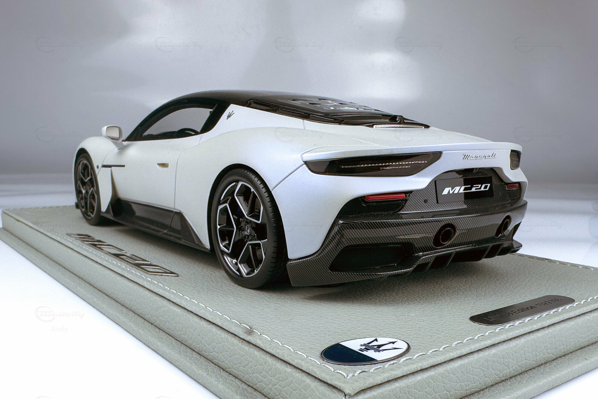Diese auf 300 Stück weltweit limitierte Edition, die von BBR Models gefertigt wurde, bietet eine detailreiche Replik des Maserati MC20. Die Miniatur im Maßstab 1:18 besteht aus hochwertigem Resin und begeistert Sammler durch ihre präzise Nachbildung. Das Modell zeigt die markanten Linien und die kraftvolle Präsenz des Originals. Die realistische Darstellung des Interieurs und der Karosserie sorgen dafür, dass dieses Modell eine Bereicherung für jede Sammlung darstellt. Das Fahrzeug von Modelly-Mitglied "Andy" ist in einem eleganten Weiß sowie mit einem schwarzen Dach und Carbon-Details lackiert, die die sportliche Ästhetik des Fahrzeugs unterstreichen.