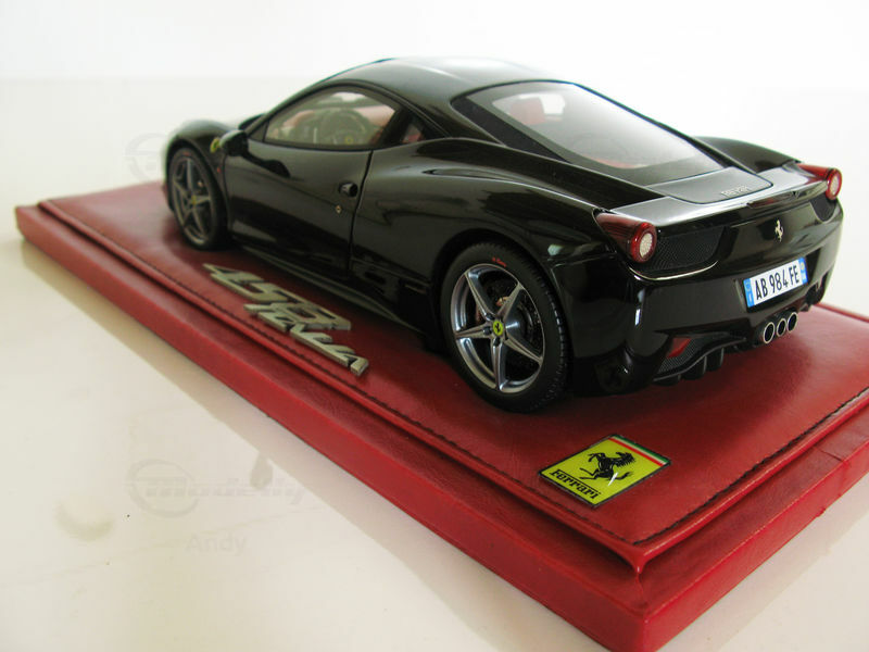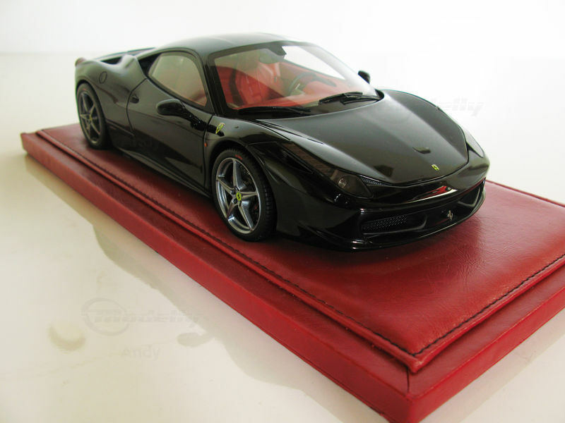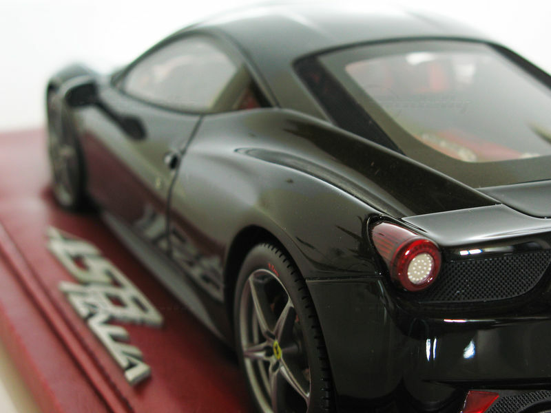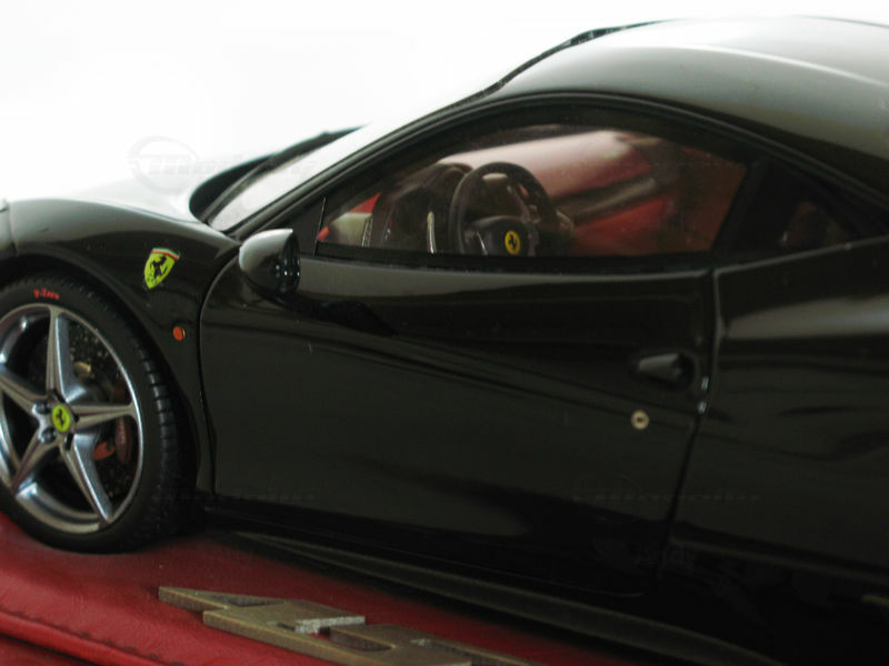 Die Lackierung dieser BBR Modellauto ist besonders auffallend. Sie spiegelt eine glatte, glänzende Oberfläche wider, die den luxuriösen Charakter des Ferrari 458 Italia unterstreicht. Das Interieur dieser Miniatur ist in Rot gehalten und sehr detailliert, mit sichtbaren Elementen wie dem Lenkrad, den Sitzen und der Armaturentafel. Die Farbkombination kontrastiert eindrucksvoll mit der schwarzen Außenlackierung des Modells, wodurch es im Sammlerregal besonders hervorsticht. Auch die subtilen Embleme, wie das Ferrari-Logo und die Nummernschilder, sind präzise angebracht und bieten den Sammlern eine nahezu perfekte Kopie des Originals.
