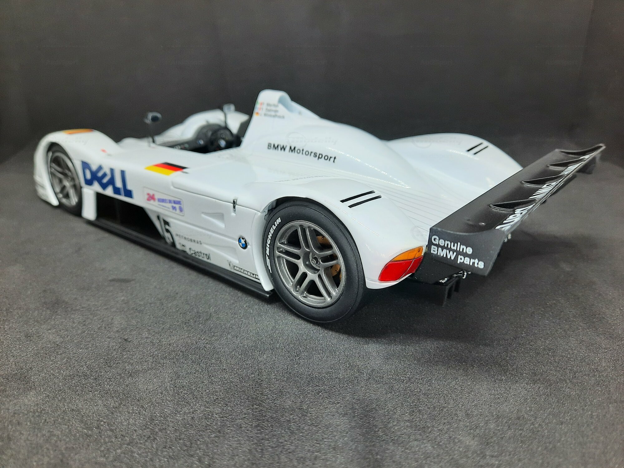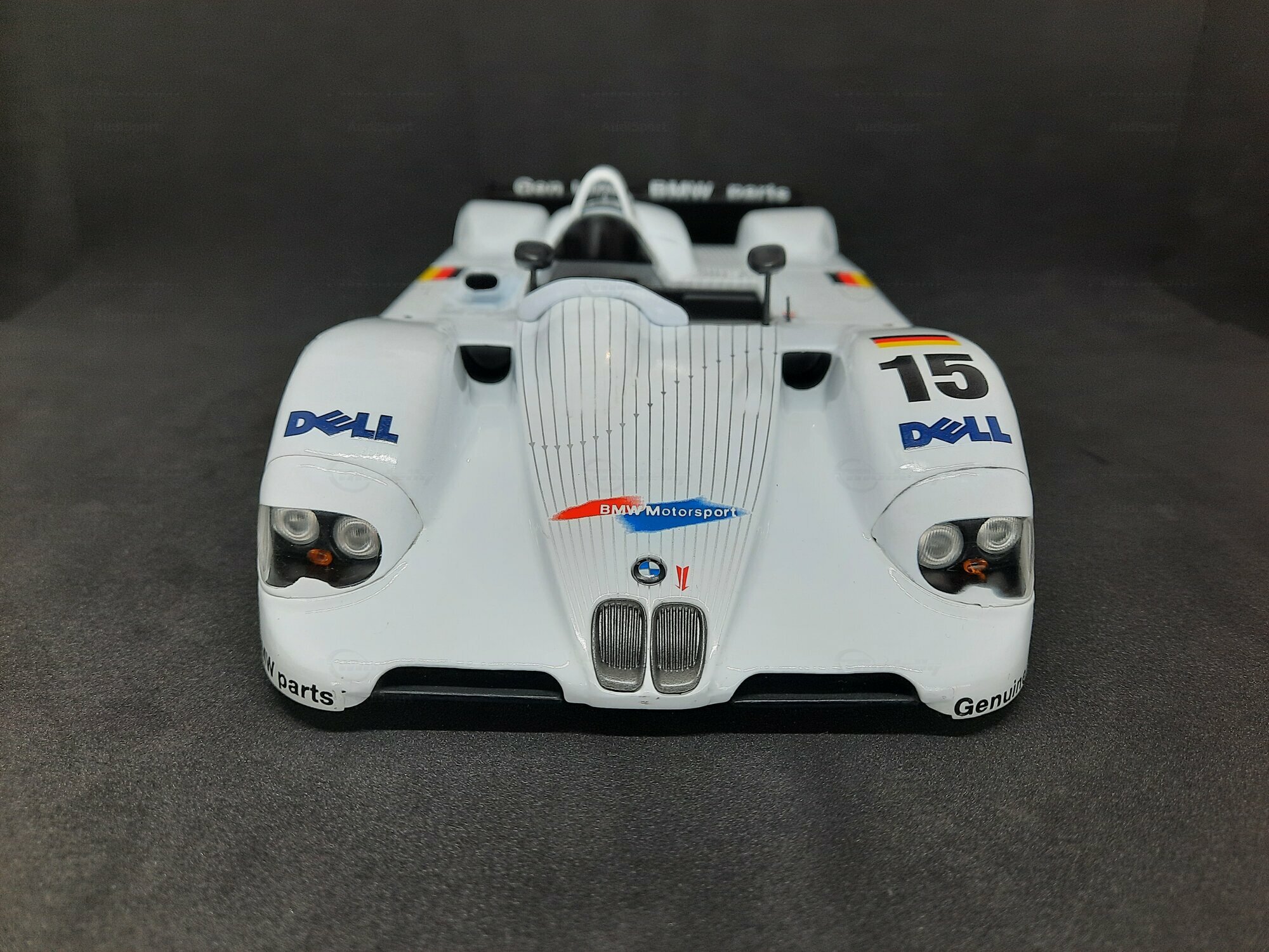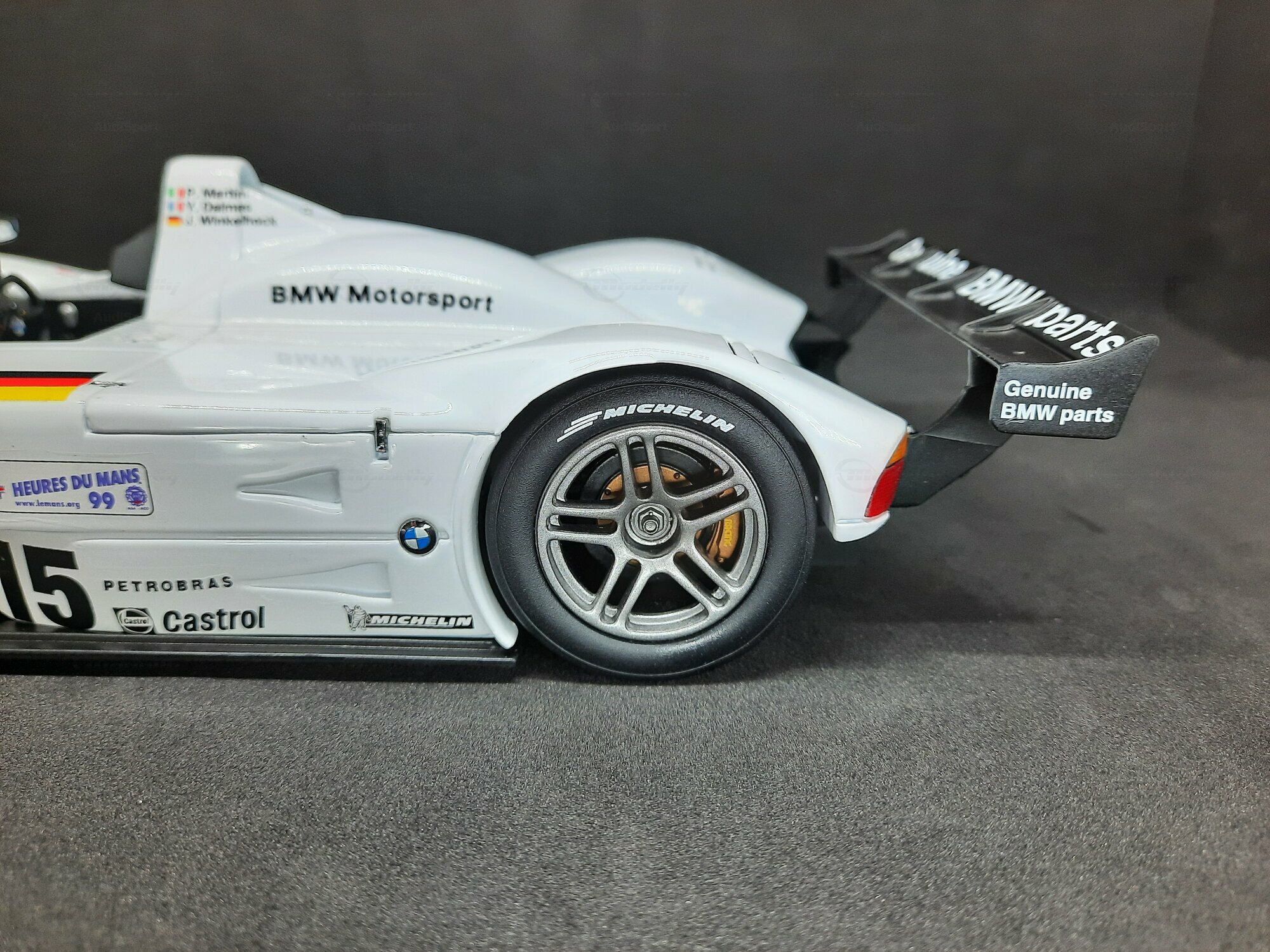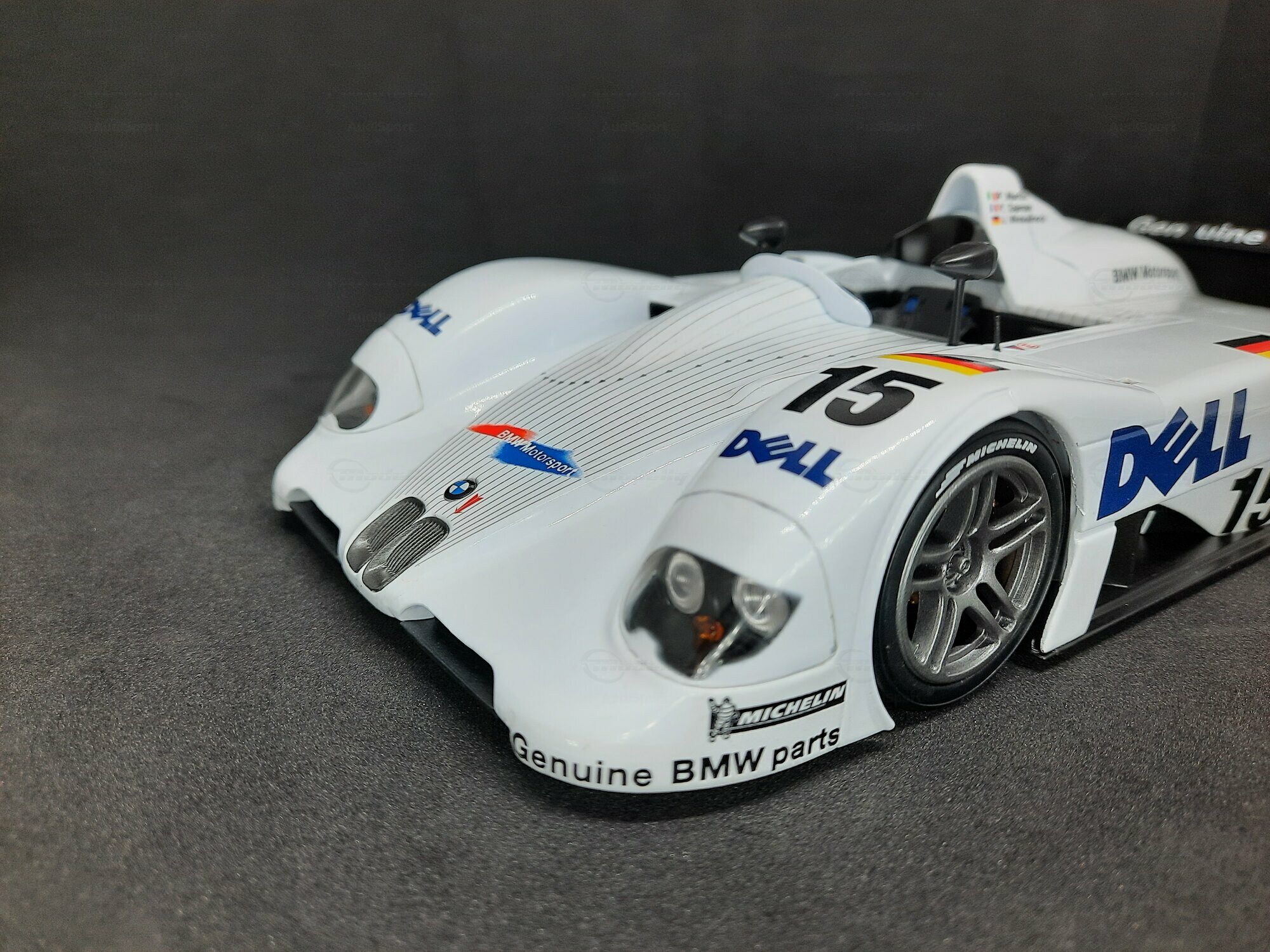 Ein Blick auf die Fotos zeigt die Liebe zum Detail, die in diese 1:18 Miniatur geflossen ist. Die Frontpartie des Fahrzeugs trägt das Nummernschild 15, genau wie das originale Rennfahrzeug. Die Sponsorenlogos von BMW, Dell und Michelin sind präzise aufgetragen und verleihen dem Modell eine authentische Optik. Die filigranen Felgen und Reifen sind exakte Nachbildungen der originalen Rennbereifung. Selbst die Rückspiegel und die Heckpartie sind originalgetreu und sorgen für ein realistisches Erscheinungsbild. Es ist ein Modell, das in keiner Sammlung fehlen sollte und eine wahre Bereicherung für jeden Liebhaber von Motorsport-Miniaturen darstellt.