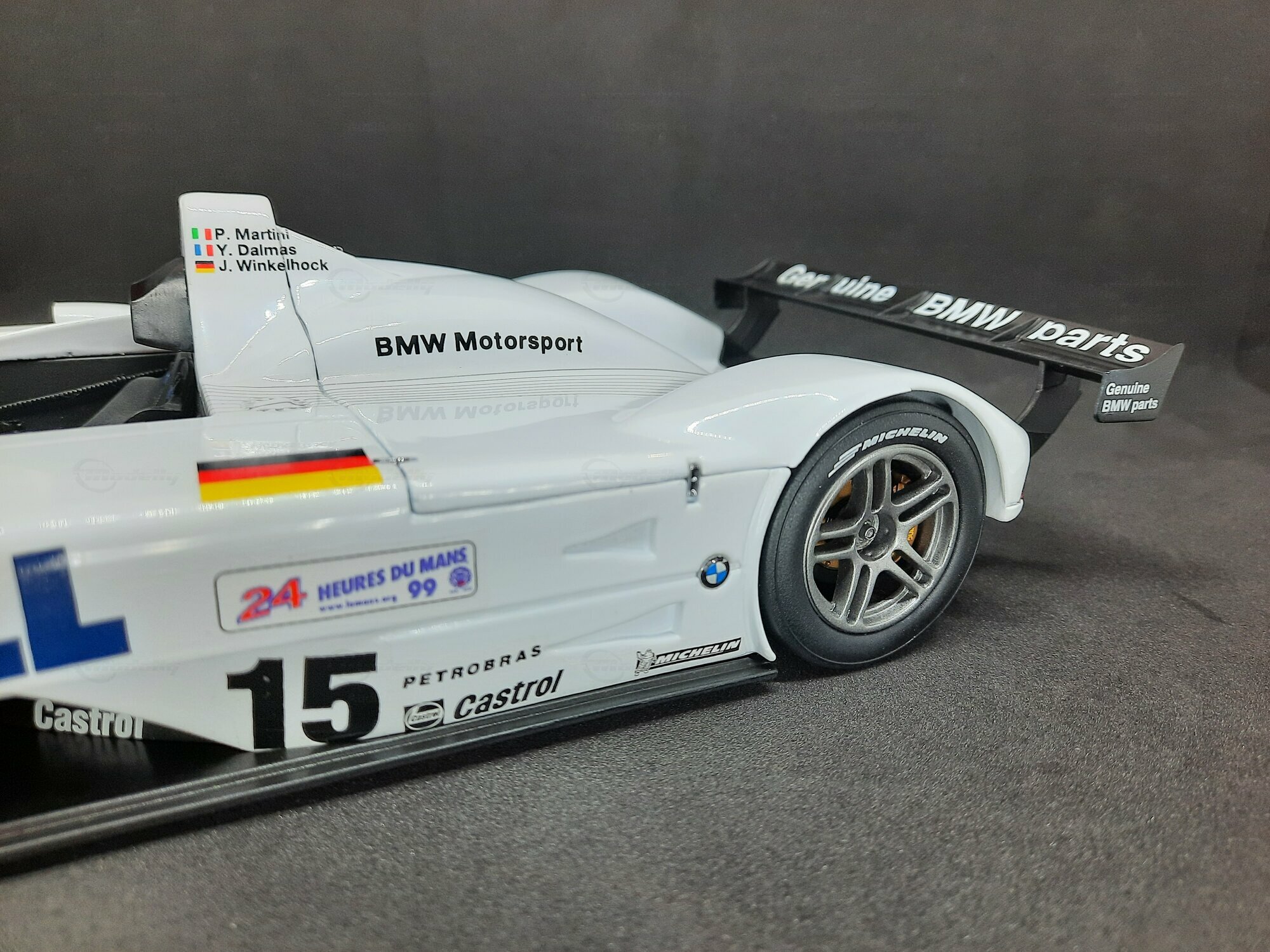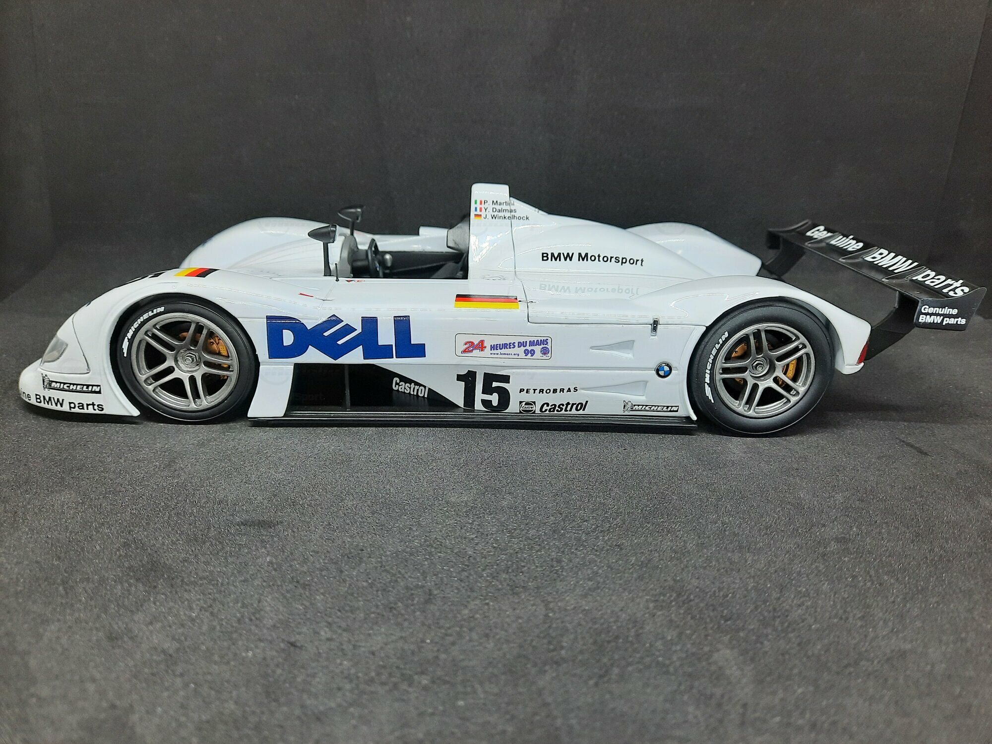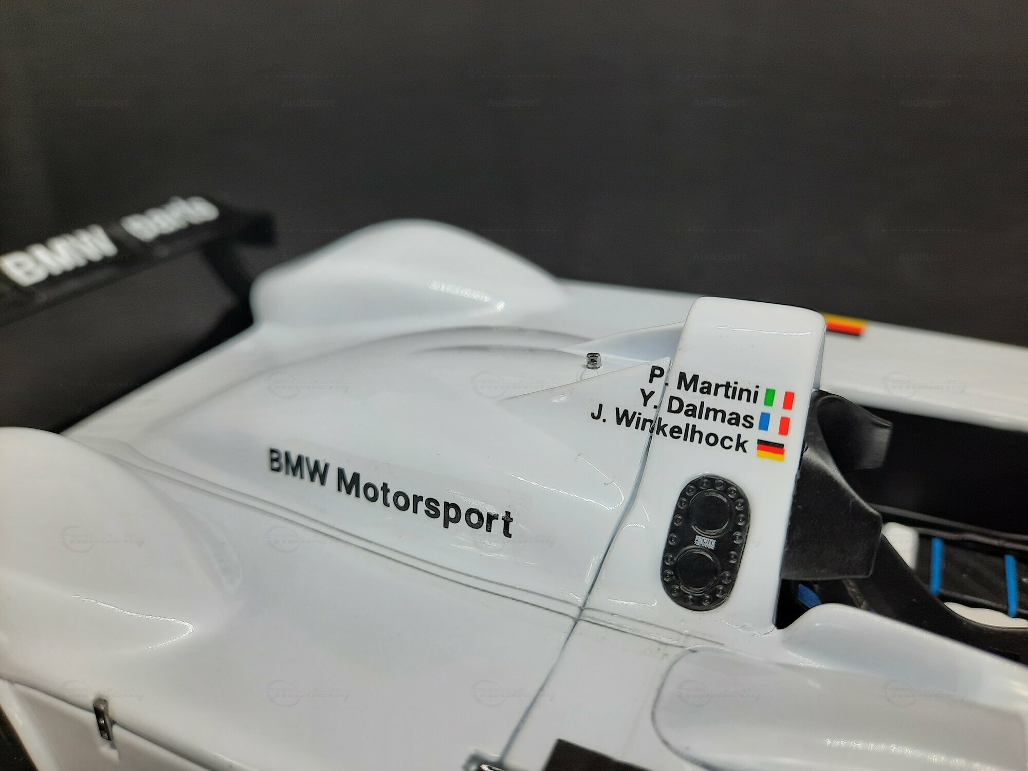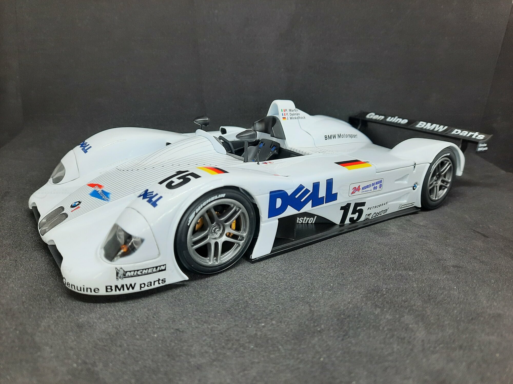 Ein Blick auf die Fotos zeigt die Liebe zum Detail, die in diese 1:18 Miniatur geflossen ist. Die Frontpartie des Fahrzeugs trägt das Nummernschild 15, genau wie das originale Rennfahrzeug. Die Sponsorenlogos von BMW, Dell und Michelin sind präzise aufgetragen und verleihen dem Modell eine authentische Optik. Die filigranen Felgen und Reifen sind exakte Nachbildungen der originalen Rennbereifung. Selbst die Rückspiegel und die Heckpartie sind originalgetreu und sorgen für ein realistisches Erscheinungsbild. Es ist ein Modell, das in keiner Sammlung fehlen sollte und eine wahre Bereicherung für jeden Liebhaber von Motorsport-Miniaturen darstellt.