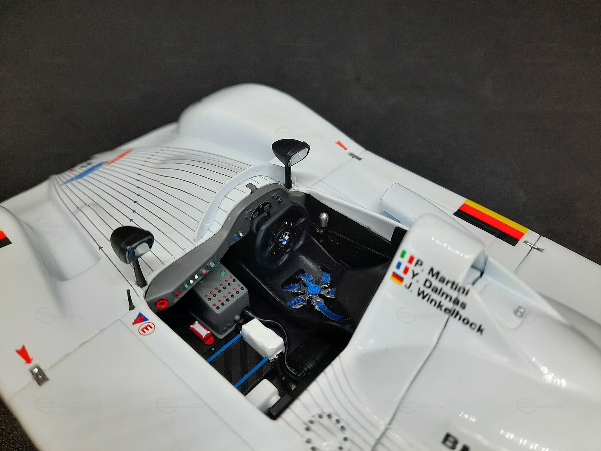 Das Modell des BMW V12 LMR im Maßstab 1:18 wurde von Kyosho hergestellt und ist ein echtes Sammlerstück. Die Miniatur, die in die Sammlung von Modelly-Mitglied "AudiSport" gehört, besticht durch ihre Detailltreue. Die Karosserie aus Diecast-Material zeigt alle wesentlichen Merkmale des Originals, einschließlich der aerodynamischen Formen und Lüftungsschlitze. Die Lackierung des Modells ist in klassischem Weiß gehalten, verziert mit den bekannten Sponsorenlogos von BMW, Dell, Michelin und Castrol.