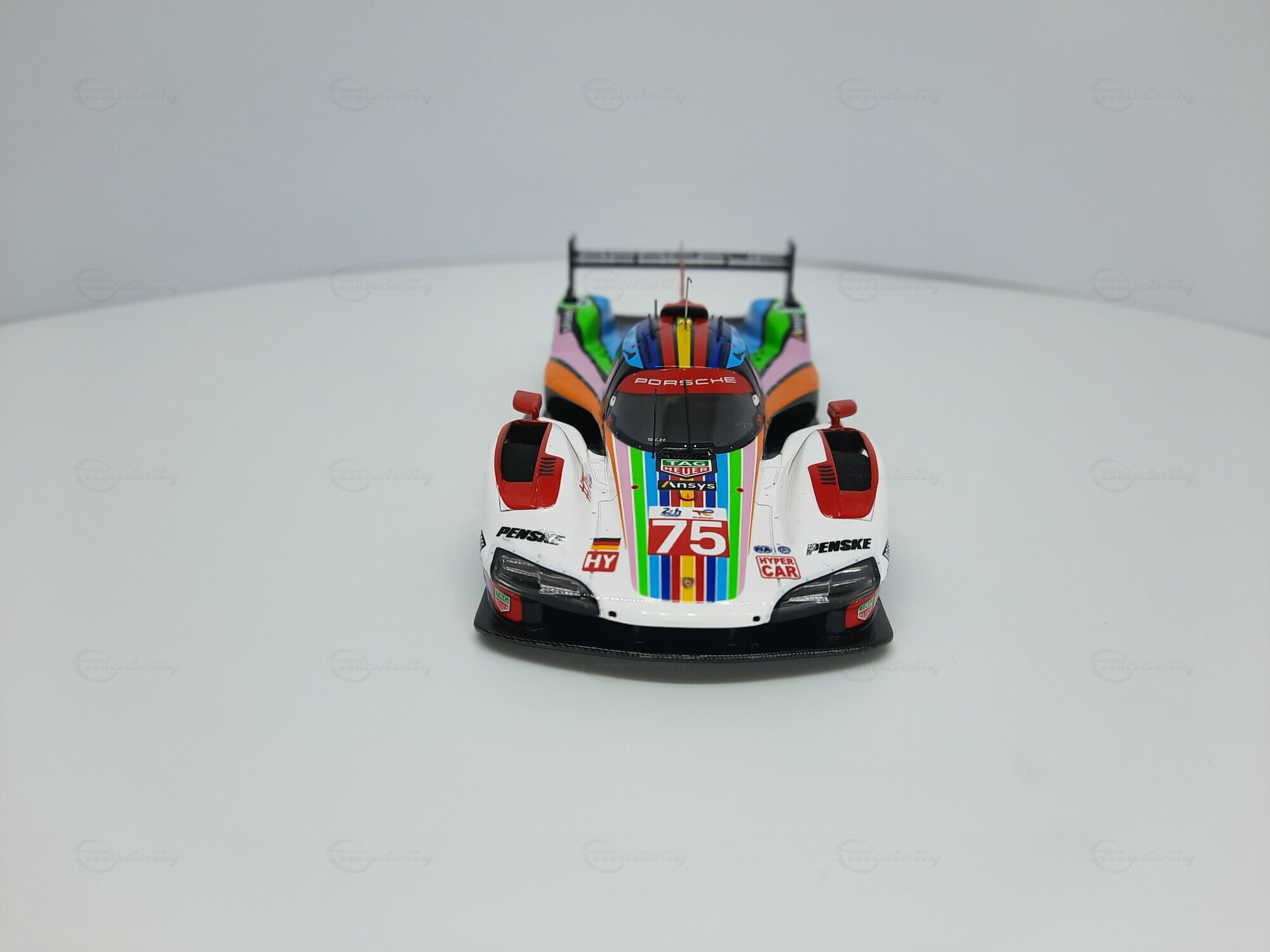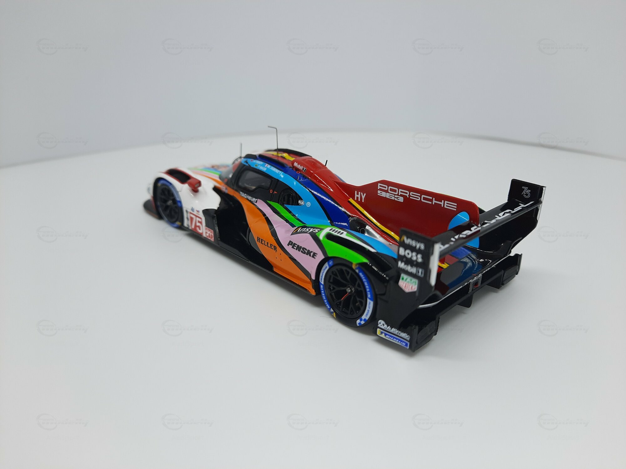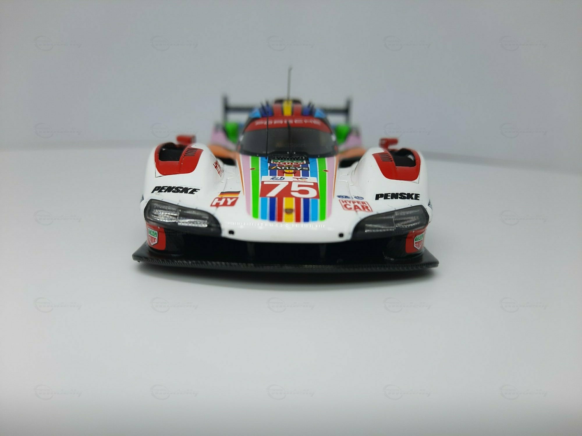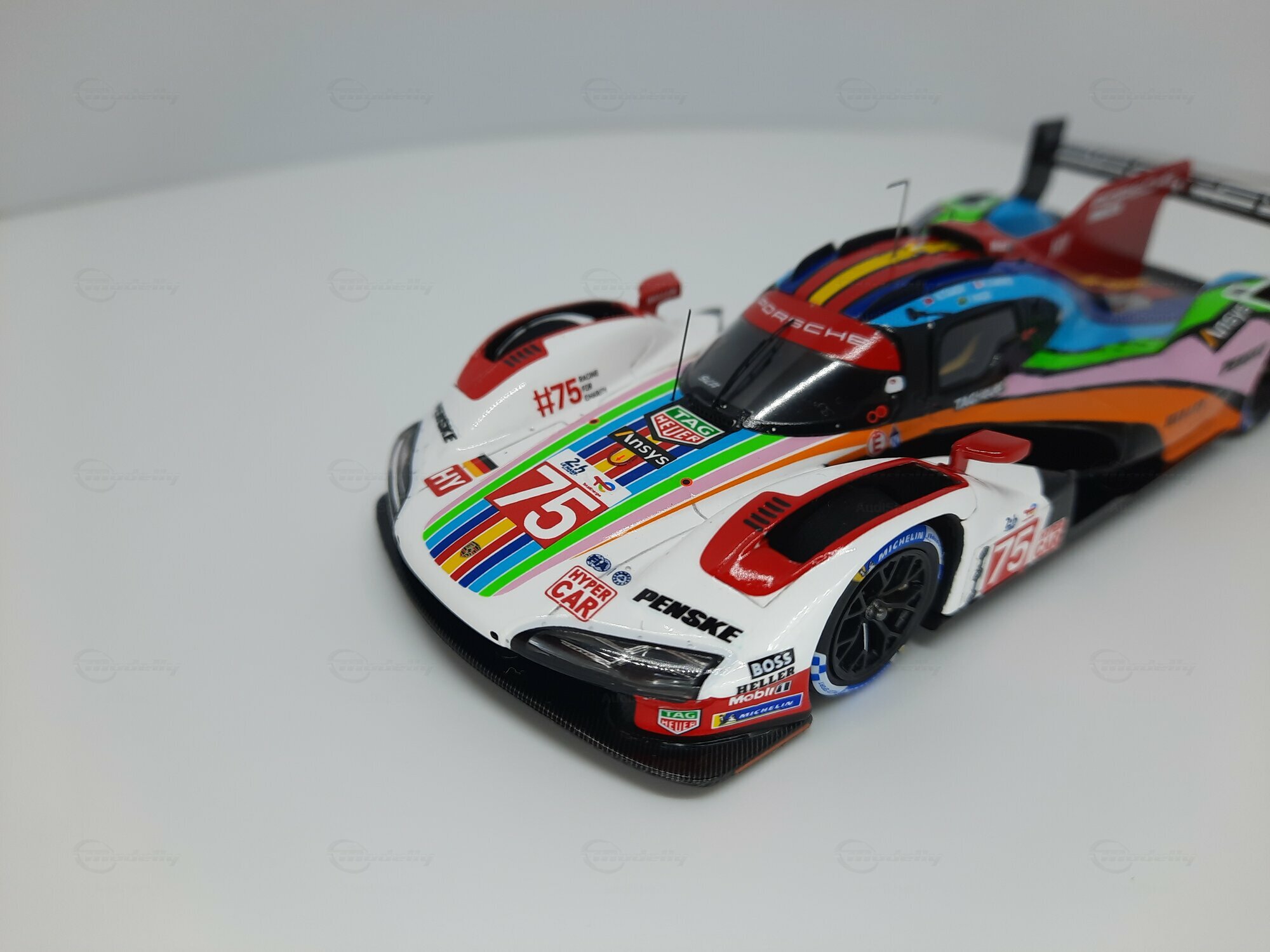 Die prägnante Lackierung des Modellautos, die überwiegend in Weiß gehalten ist, weist Regenbogenstreifen auf, die entlang der Karosserie verlaufen. Dies gibt dem Modell eine besondere Note und hebt es visuell von anderen Rennfahrzeugen ab. Auf den Türen und der Frontschürze sind deutlich die Logos von Sponsoren wie TAG Heuer, Michelin und Penske erkennbar. Die Lackierung ist nicht nur ein Hingucker, sondern zeigt auch die enge Verbindung zwischen Automobilhersteller und Sponsoren. Das Modell im Maßstab 1:43 von SPARK ist damit nicht nur ein Sammlerstück, sondern auch ein kleines Stück Automobilgeschichte, das die großen Momente des Porsche 963 in der Welt des Rennsports würdigt.