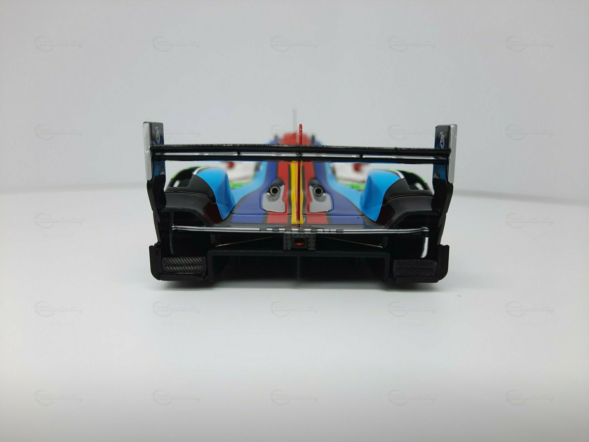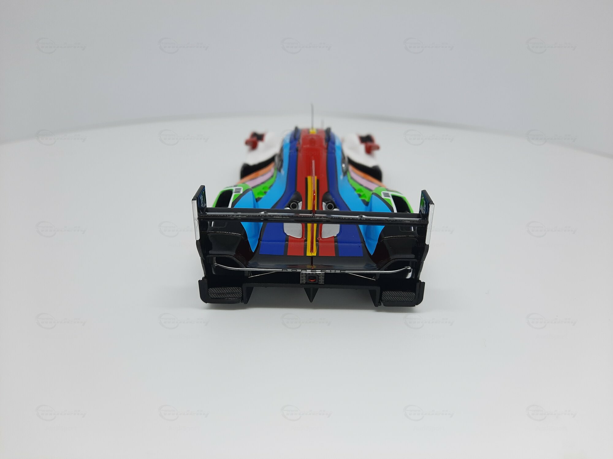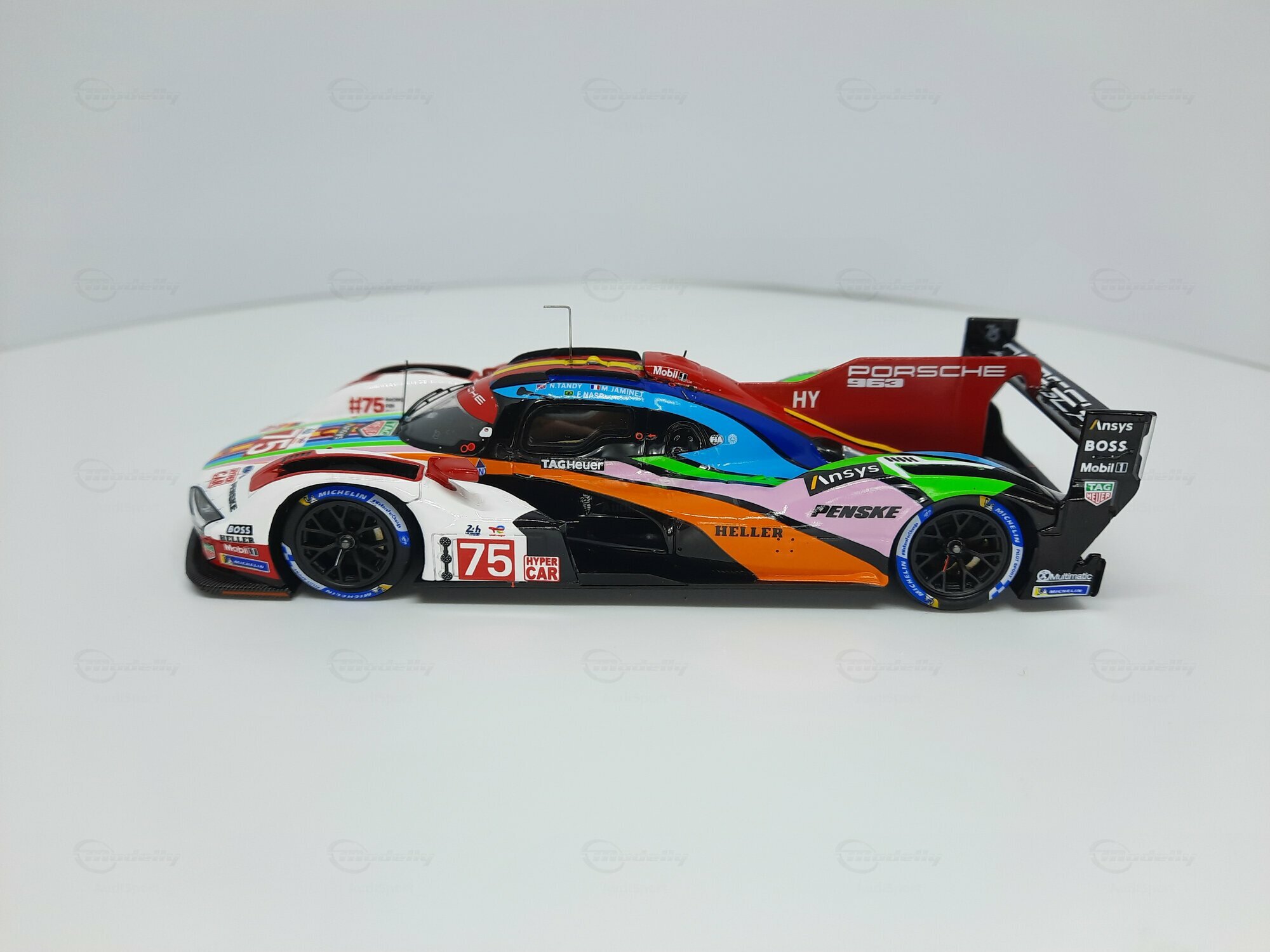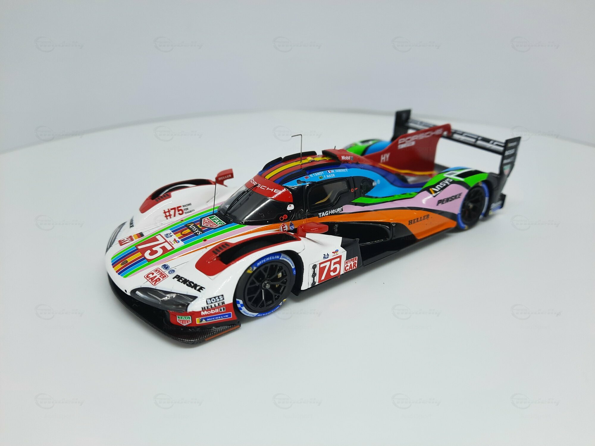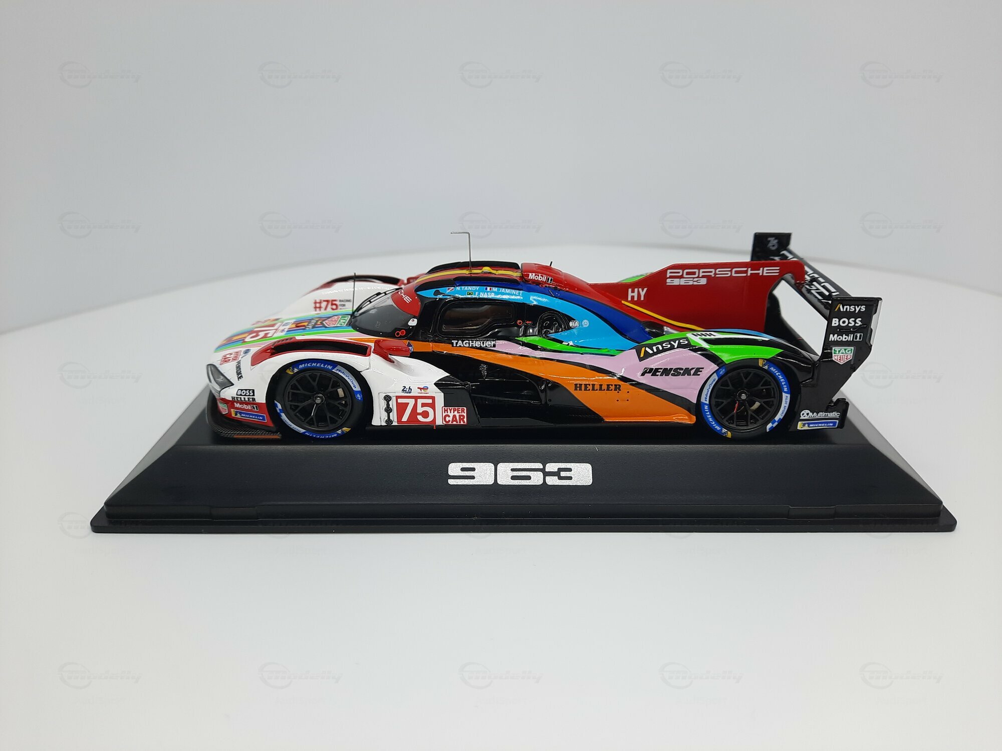 Die prägnante Lackierung des Modellautos, die überwiegend in Weiß gehalten ist, weist Regenbogenstreifen auf, die entlang der Karosserie verlaufen. Dies gibt dem Modell eine besondere Note und hebt es visuell von anderen Rennfahrzeugen ab. Auf den Türen und der Frontschürze sind deutlich die Logos von Sponsoren wie TAG Heuer, Michelin und Penske erkennbar. Die Lackierung ist nicht nur ein Hingucker, sondern zeigt auch die enge Verbindung zwischen Automobilhersteller und Sponsoren. Das Modell im Maßstab 1:43 von SPARK ist damit nicht nur ein Sammlerstück, sondern auch ein kleines Stück Automobilgeschichte, das die großen Momente des Porsche 963 in der Welt des Rennsports würdigt.