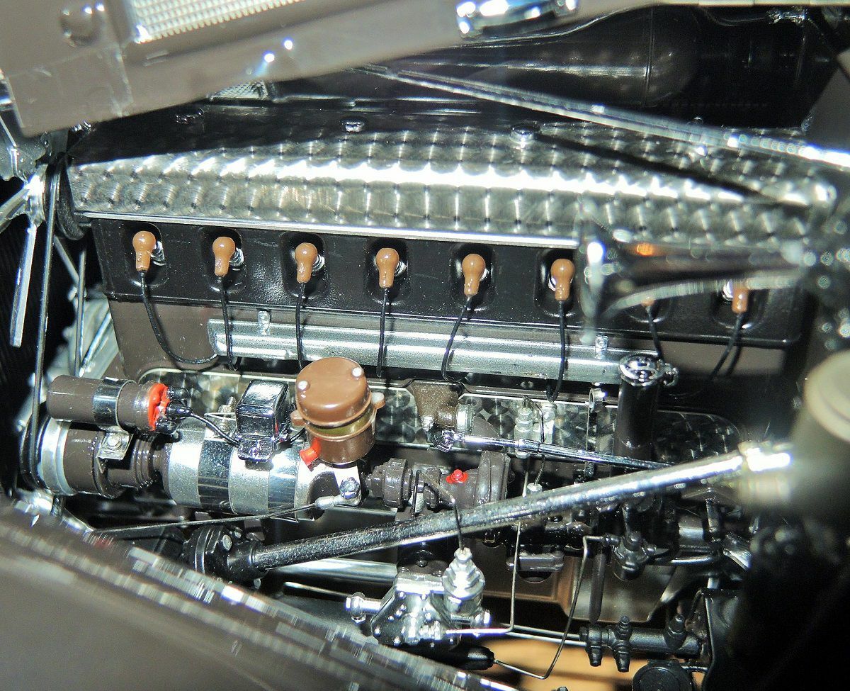 Das hier gezeigte Modell im 1:12 Maßstab von Bauer ist ein präzise gefertigtes Diecast-Modell, welches insbesondere durch seine Detailtreue besticht. Die Karosserie ist in einem eleganten Schwarz lackiert, was das klassische Aussehen des Originals perfekt einfängt. Die weiße Umrandung der Reifen und die beige Innenausstattung verstärken den Eindruck von Luxus und Eleganz. Im Gegensatz zu vielen anderen Modellen ist diese Miniatur auch unter der Haube detailliert und zeigt den akribisch nachgebildeten Motor mitsamt seiner Verkabelung und seinem Kompressor. Auch der Innenraum des Modells ist sehr detailreich gestaltet, was man an den gezeigten Fotos gut erkennen kann.