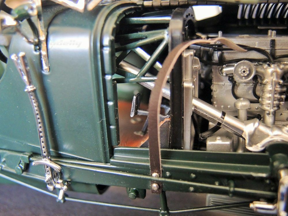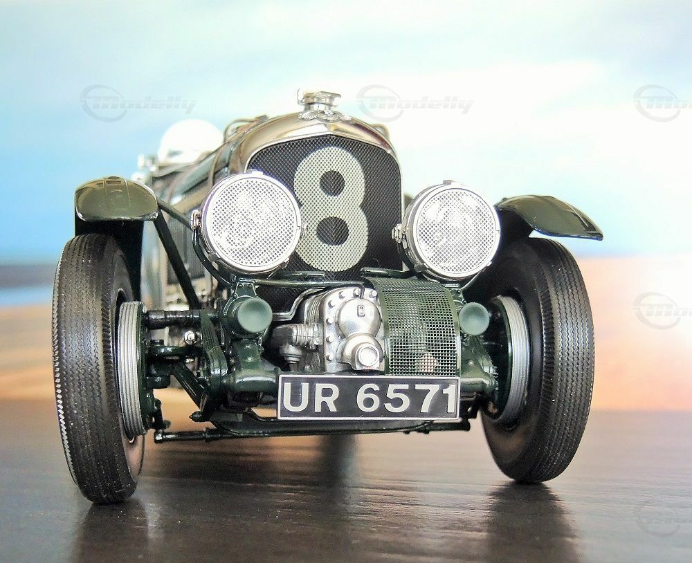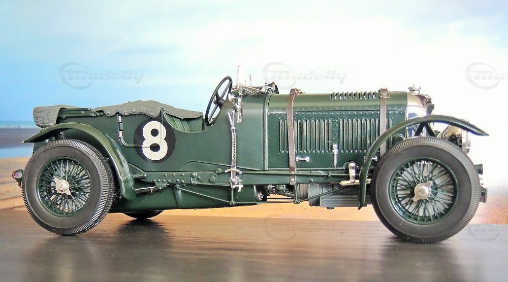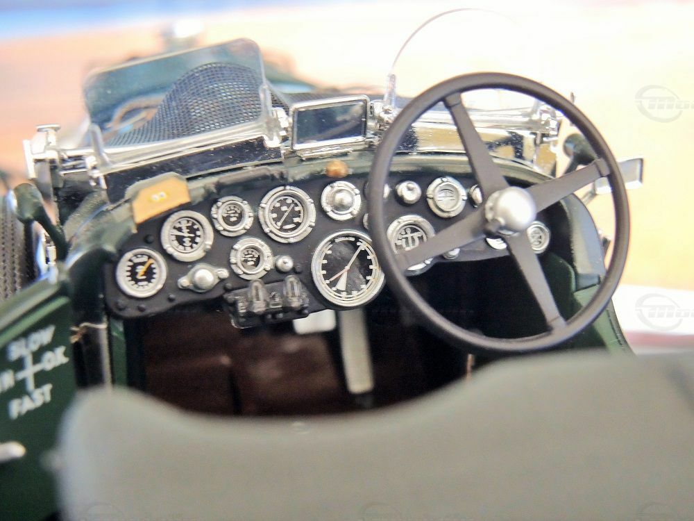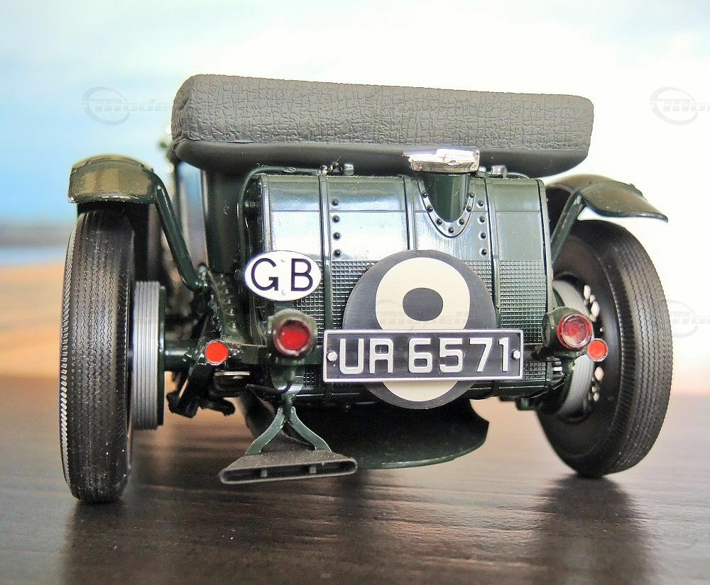 Dieses Modell des Bentley Blower 4,5 Litre im Maßstab 1:18 wurde von Minichamps mit viel Liebe zum Detail und auf Basis von diecast-Materialien gefertigt. Die Gründlichkeit und Präzision dieses Modells machen es zu einem Highlight jeder Sammlung. Das Modell mit der Nummernschild "UR 6571" spiegelt authentische Details und Merkmale des Originals wider, einschließlich der ikonischen Rundscheinwerfer und der markanten Frontgitter mit der großen Ziffer „8“. Die lackierten und gravierten Oberflächen, einschließlich der dunkelgrünen Farbgebung des Operationswagens, und die präzise Nachbildung des Motors und Fahrwerks, heben dieses Modell besonders hervor. Die Rückseite des Fahrzeugs zeigt exakt nachgebildete Details wie das Ersatzrad, Sponsorenaufkleber und die Bremsleuchten, was die Detailtreue dieses Modells unterstreicht.