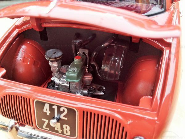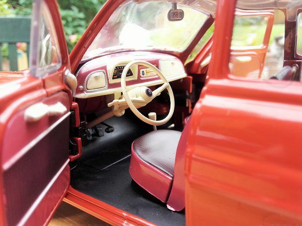 Das Modell im Maßstab 1:18 von Norev zeichnet sich durch besondere Detailtreue aus. Die charakteristischen Rundscheinwerfer und der markante Kühlergrill wurden präzise nachempfunden. Das Modellauto zeigt die typische rote Lackierung, die in den 50er Jahren beliebt war. Neben den korrekten Proportionen stechen auch die zierlichen Chromstoßstangen und originalgetreu nachempfundenen Räder mit weißwandreifen hervor. Die Nummernschilder sind ebenfalls detailliert und tragen die Inschrift „412 Z 48“, welche den regionalen Charakter des Fahrzeuges unterstreicht.