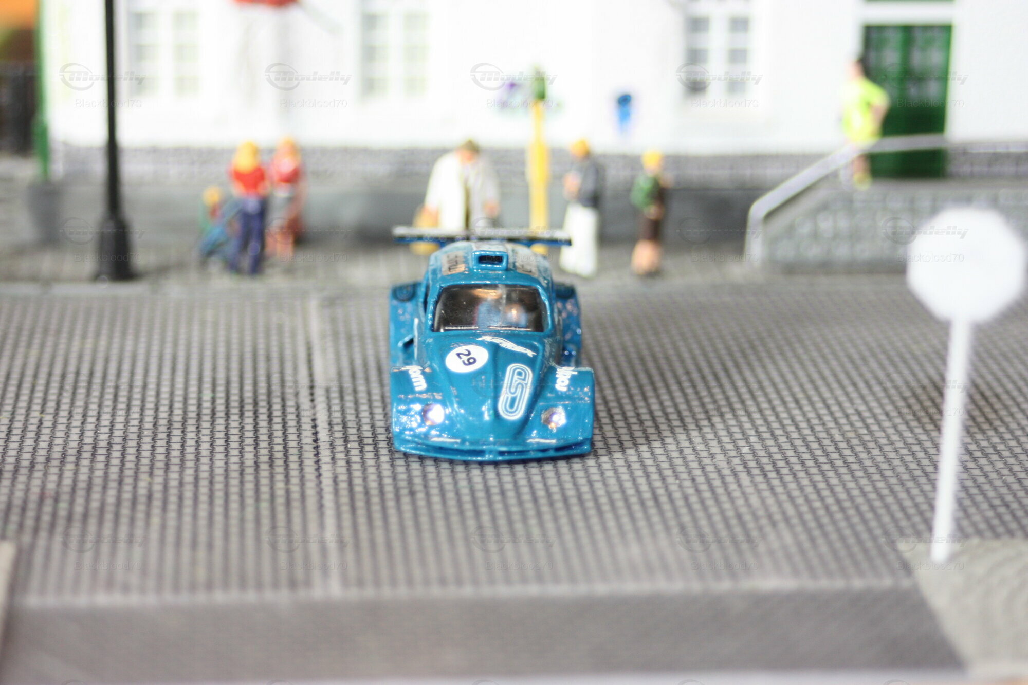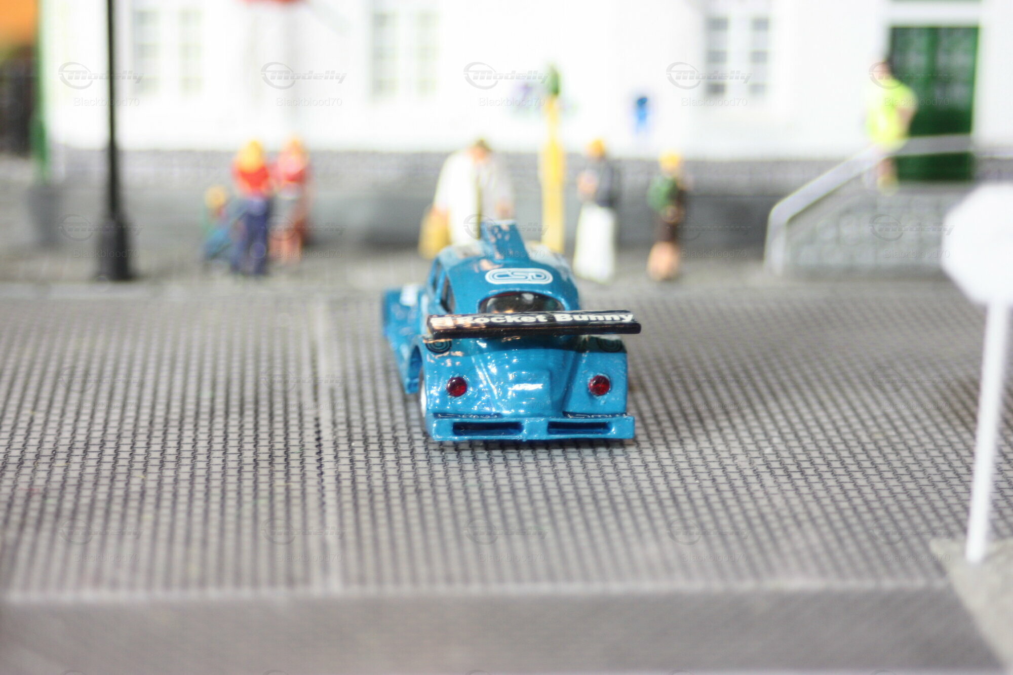 Das Modellauto, das zur Sammlung des Modelly Mitglieds „Blackblood70“ gehört, zeigt eine auffällige blaue Lackierung mit umgestalteten Kotflügeln und einer großen Heckflügel-Befestigung. Auf der Seite des Autos sind Nummernschilder und Sponsoraufkleber von Clutch Masters und Porcato angebracht, die das Modell authentisch aussehen lassen. Die modifizierte Karosserie und die hinzugefügten Details verleihen dem Modell ein einzigartiges Aussehen und machen es zu einem wertvollen Sammlerstück für Modellautoliebhaber. Das Design des Rennaufklebers, die aerodynamischen Formen und die präzise Nachbildung machen dieses Modell zu einer kleinen, aber detaillierten Hommage an den legendären VW Käfer.