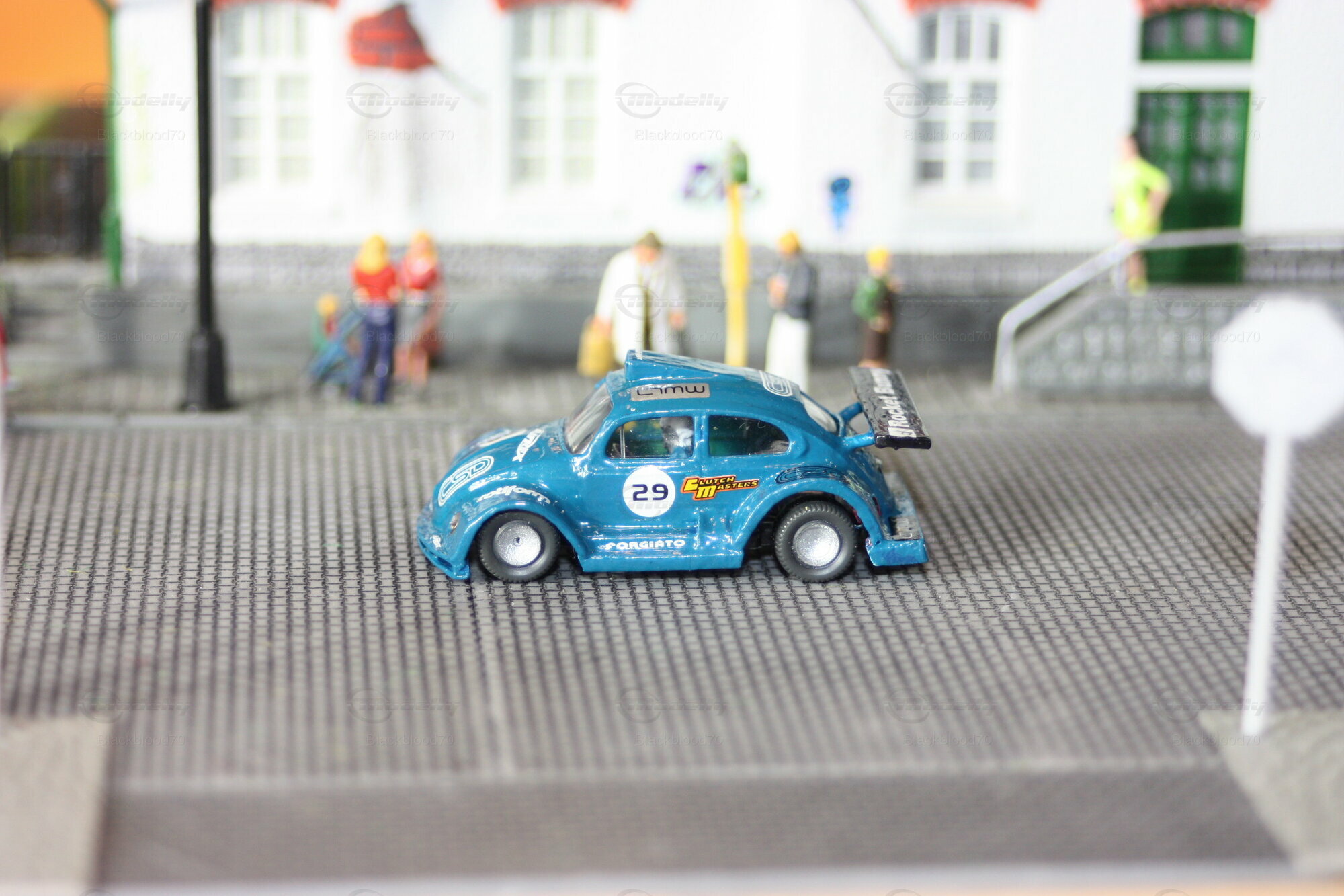 Bei dem hier gezeigten Modellauto handelt es sich um einen 1:87 Maßstab VW Käfer, hergestellt von WIKING. Dieses Modell ist aus Kunststoff gefertigt und wurde modifiziert, um einen Rennkäfer darzustellen. Entsprechend dem Maßstab 1:87, entspricht dieses Modell einer originalgetreuen Miniaturversion eines VW Käfer. Das Modellauto weist detaillierte Features wie ein Renndekor und Sponsorenaufkleber auf, die von dem Original VW Käfer inspiriert wurden. Aufgrund der vorgenommenen Modifikationen spiegelt dieses Modell nicht das Produkt wider, das ursprünglich von WIKING hergestellt wurde.