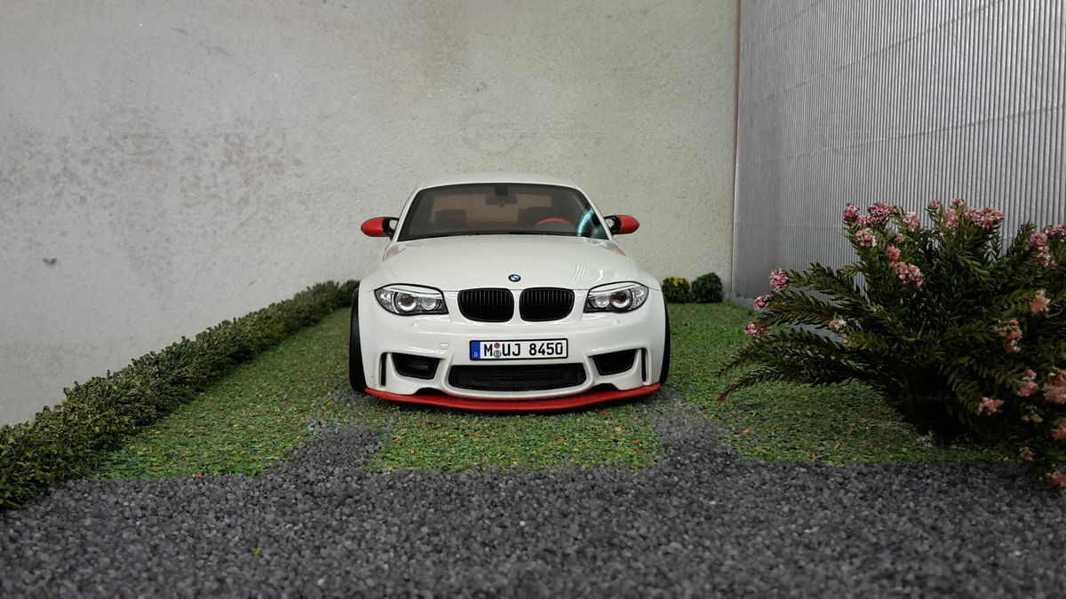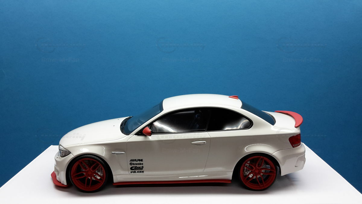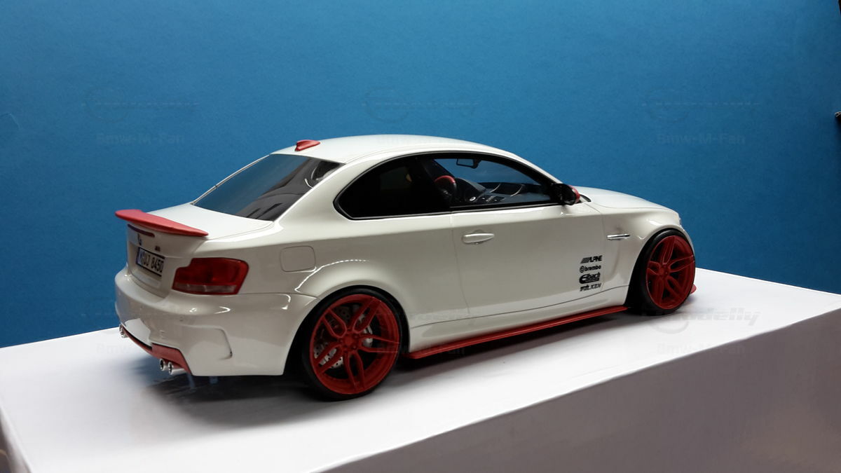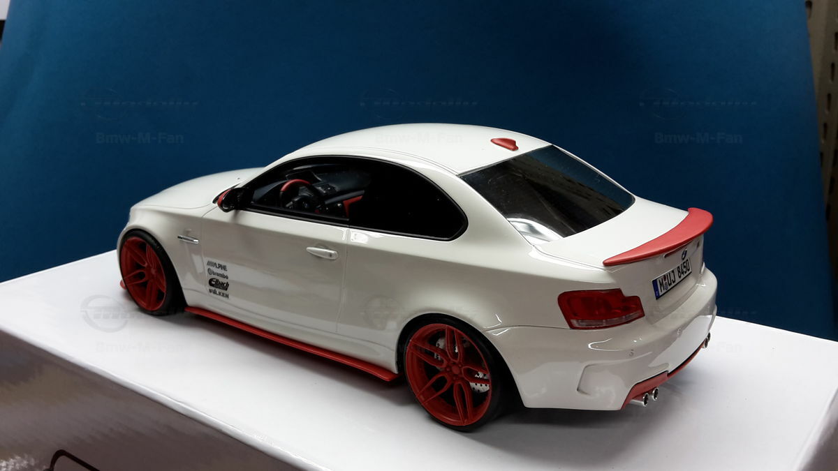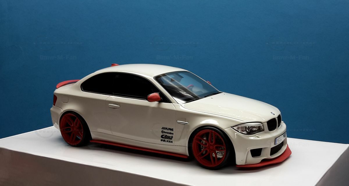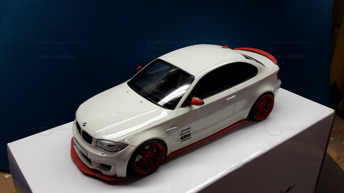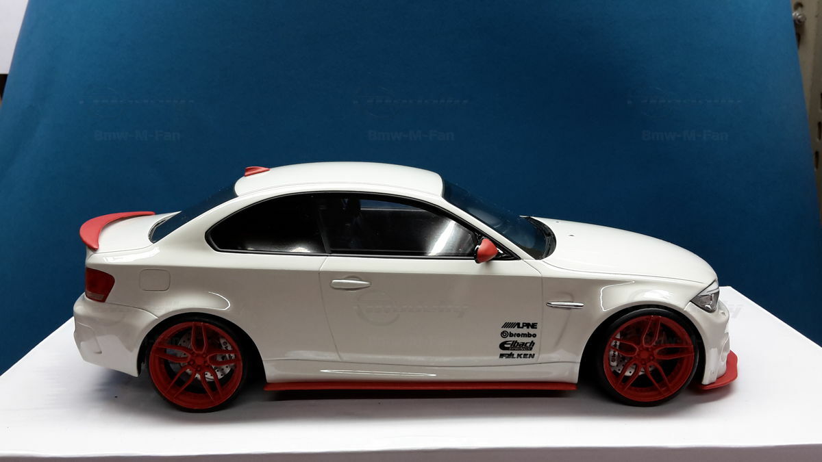 Das gezeigte Modellauto im Maßstab 1:18 ist ein Nachbau des BMW E82 1M Coupe und wurde von GT Spirit hergestellt. Es handelt sich dabei um eine stark modifizierte Version, die nicht das von GT Spirit ursprünglich produzierte Produkt repräsentiert. Dieses Modell besteht aus dem Material Resin, das für seine Detailgetreue und Langlebigkeit bekannt ist. Auffällig sind die roten Felgen und Details, die dem Modell eine besondere Note verleihen. Die aufgebrachten Decals von Marken wie Alpina, Brembo, Eibach und Falken tragen zur Authentizität und Attraktivität des Modells bei. Die auffälligen roten Akzente an den Spiegelkappen und dem Frontspoiler runden das Gesamtbild ab. Es ist klar erkennbar, dass es sich hierbei um eine liebevoll gestaltete und individualisierte Miniatur im Besitz von Modelly-Mitglied "Bmw-M-Fan" handelt.