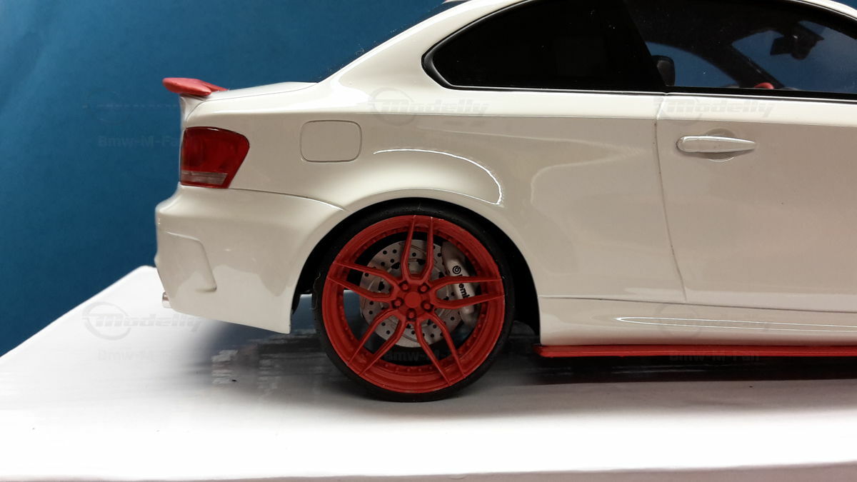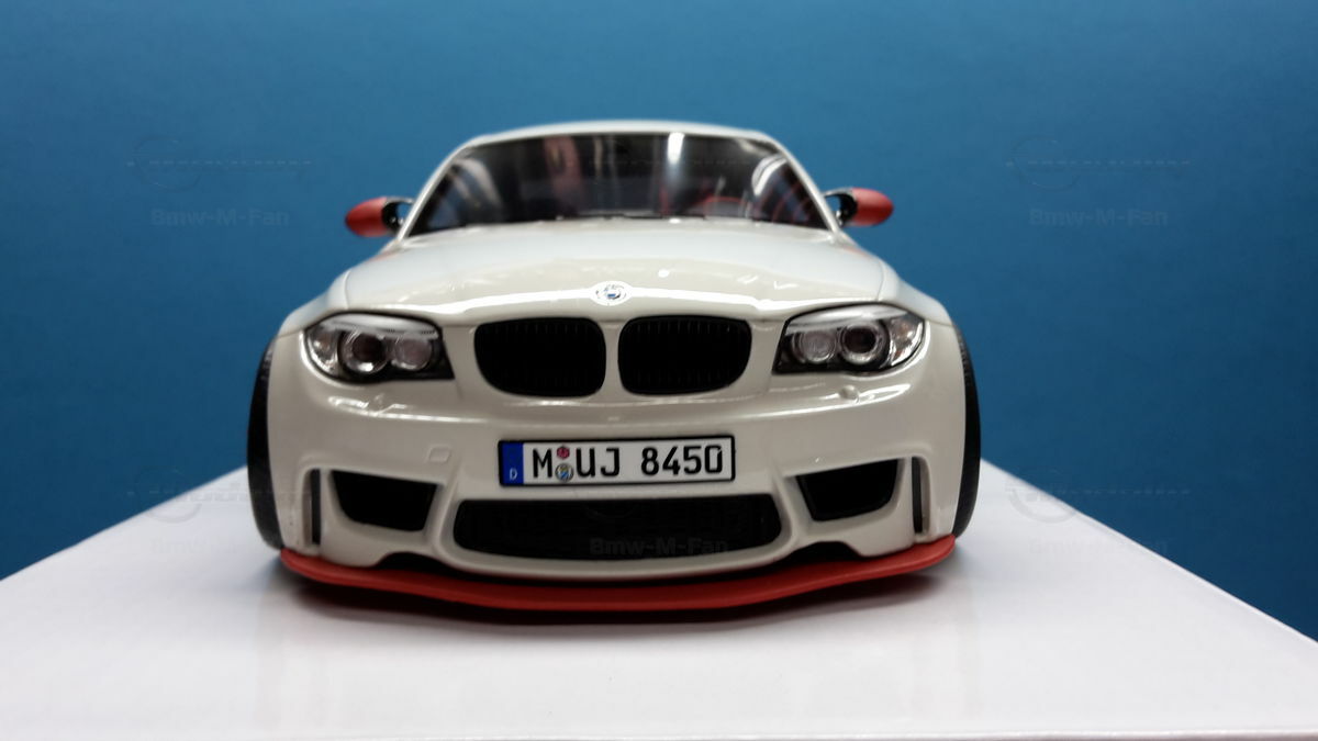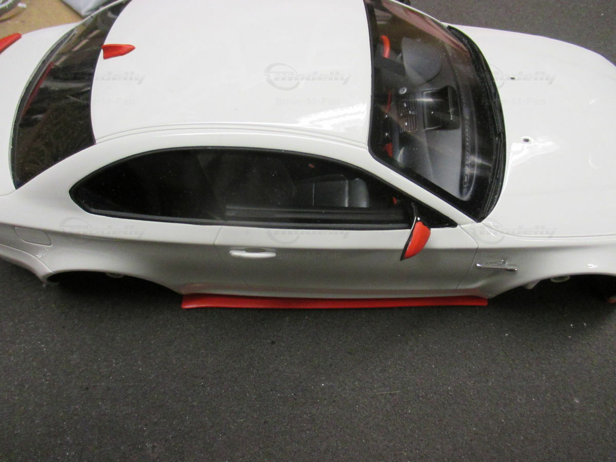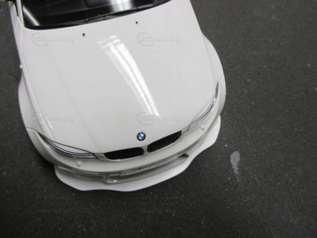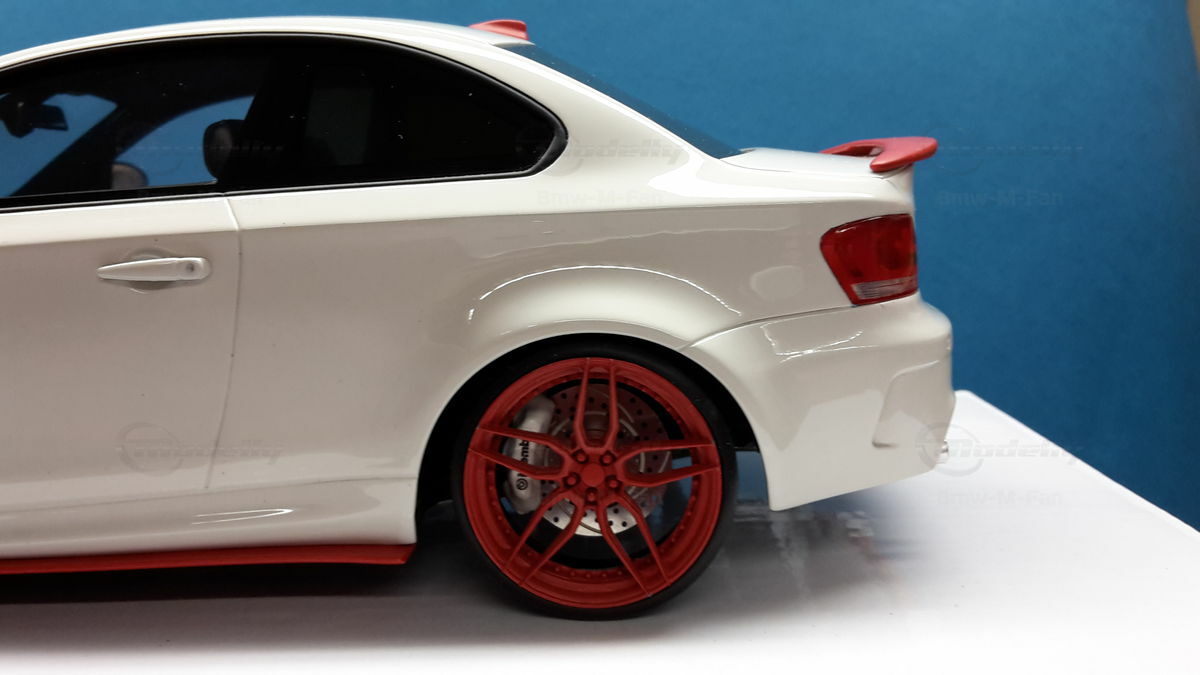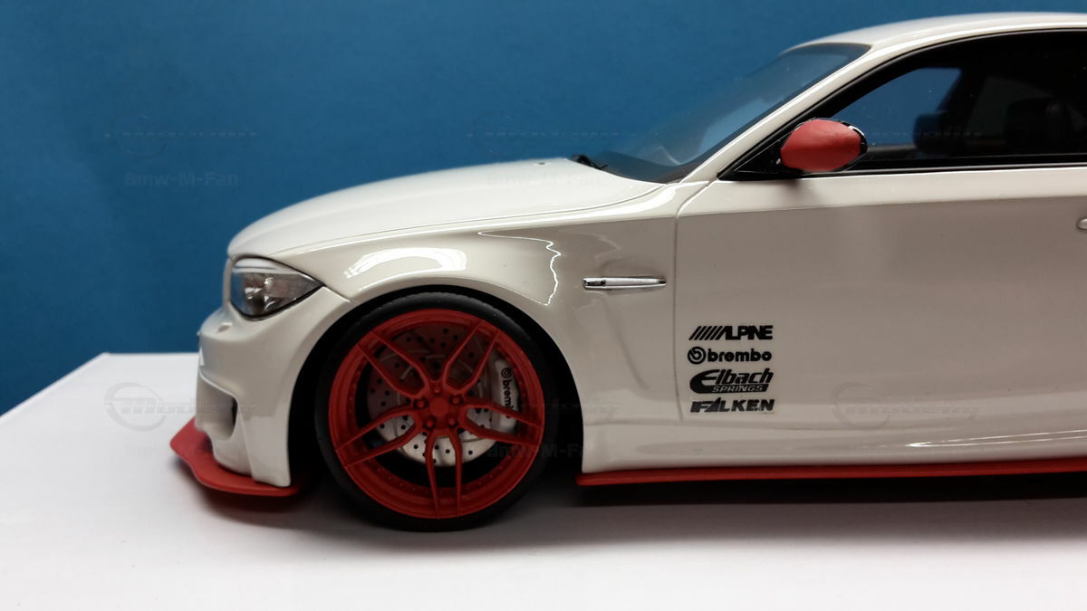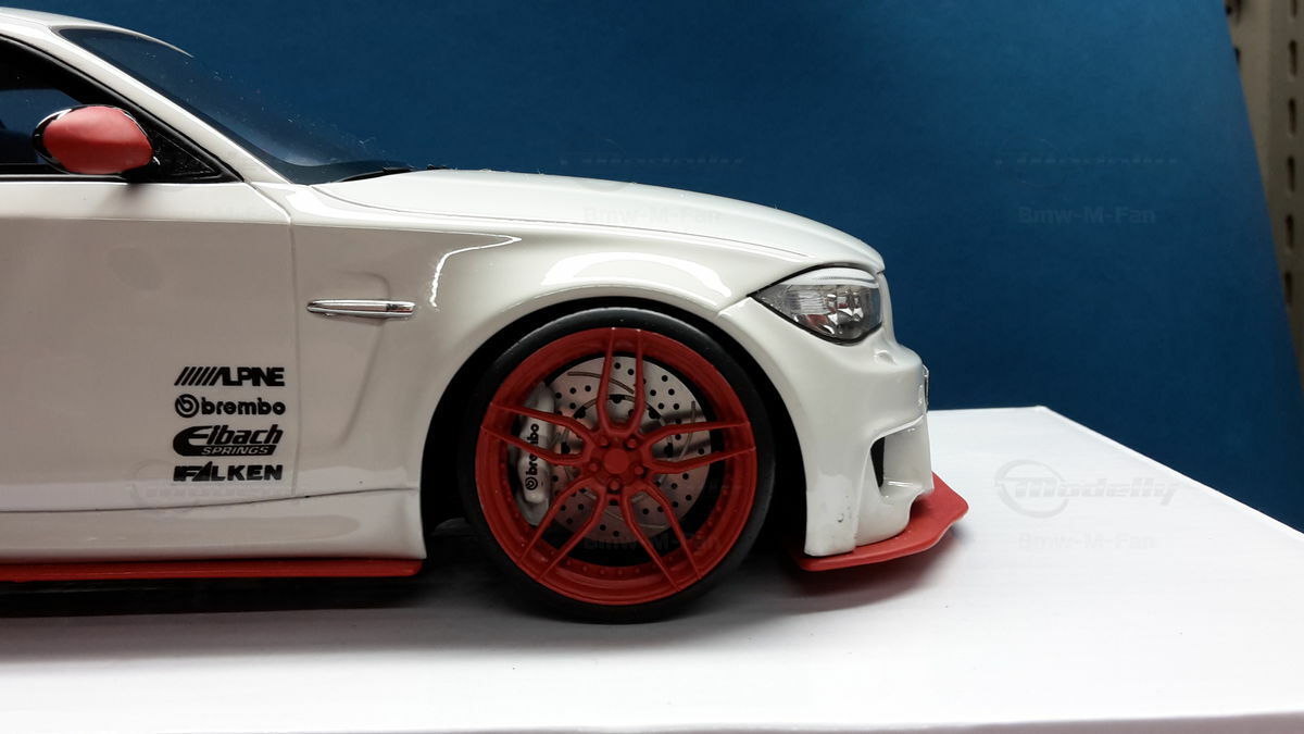 Das gezeigte Modellauto im Maßstab 1:18 ist ein Nachbau des BMW E82 1M Coupe und wurde von GT Spirit hergestellt. Es handelt sich dabei um eine stark modifizierte Version, die nicht das von GT Spirit ursprünglich produzierte Produkt repräsentiert. Dieses Modell besteht aus dem Material Resin, das für seine Detailgetreue und Langlebigkeit bekannt ist. Auffällig sind die roten Felgen und Details, die dem Modell eine besondere Note verleihen. Die aufgebrachten Decals von Marken wie Alpina, Brembo, Eibach und Falken tragen zur Authentizität und Attraktivität des Modells bei. Die auffälligen roten Akzente an den Spiegelkappen und dem Frontspoiler runden das Gesamtbild ab. Es ist klar erkennbar, dass es sich hierbei um eine liebevoll gestaltete und individualisierte Miniatur im Besitz von Modelly-Mitglied "Bmw-M-Fan" handelt.