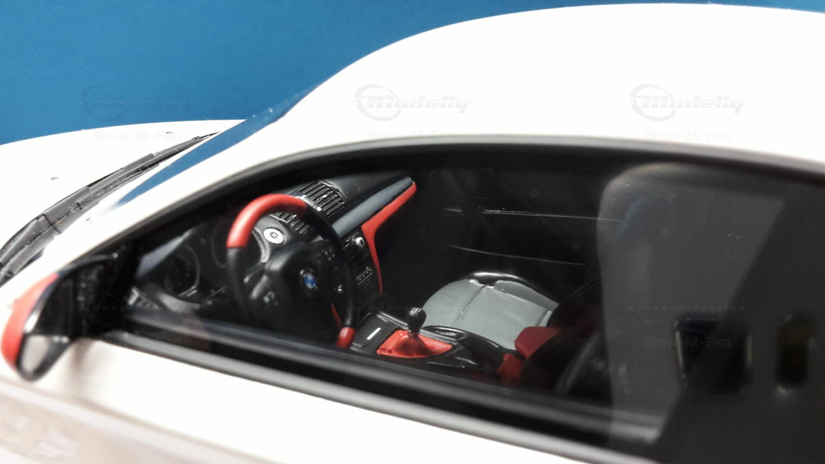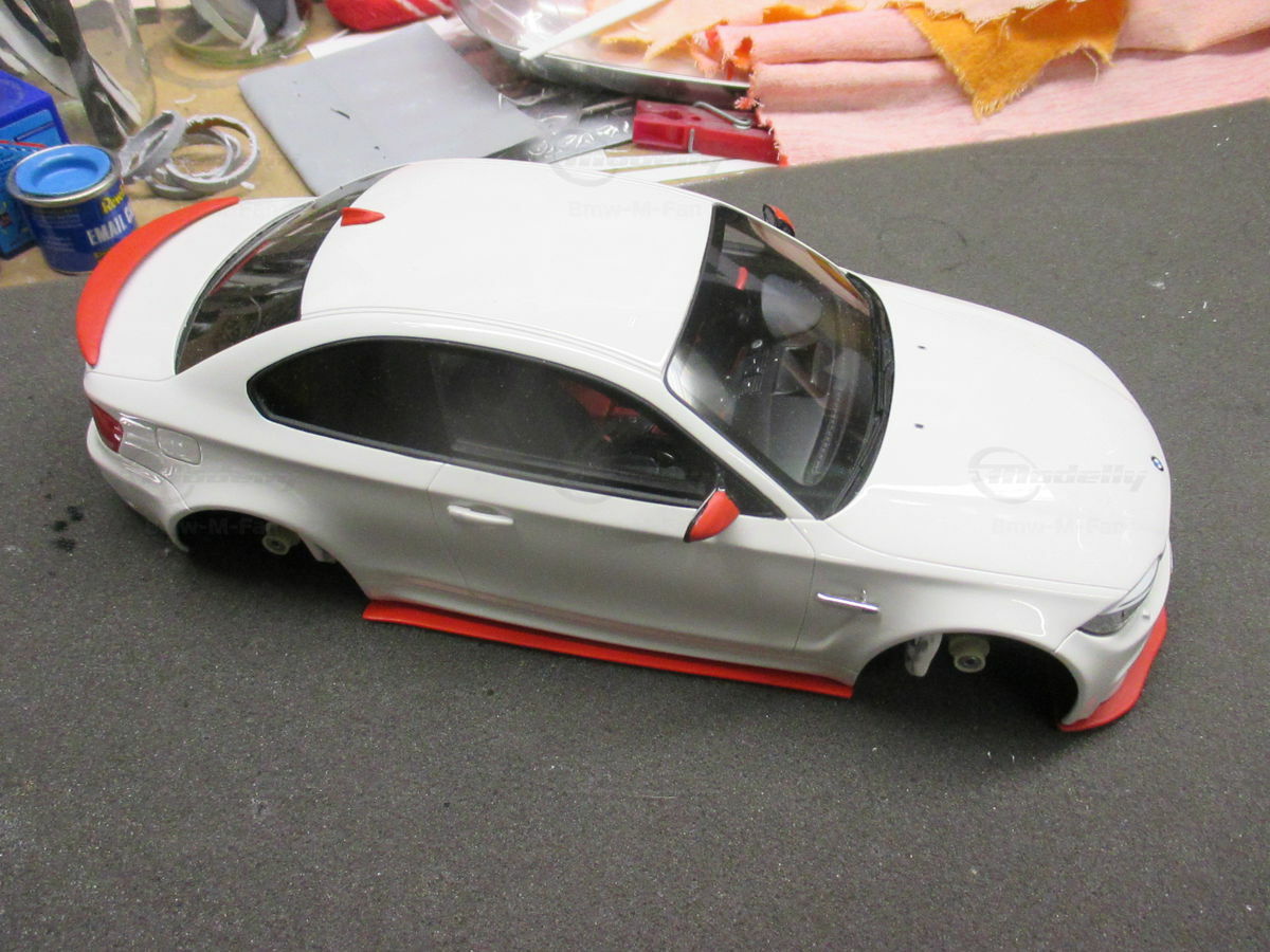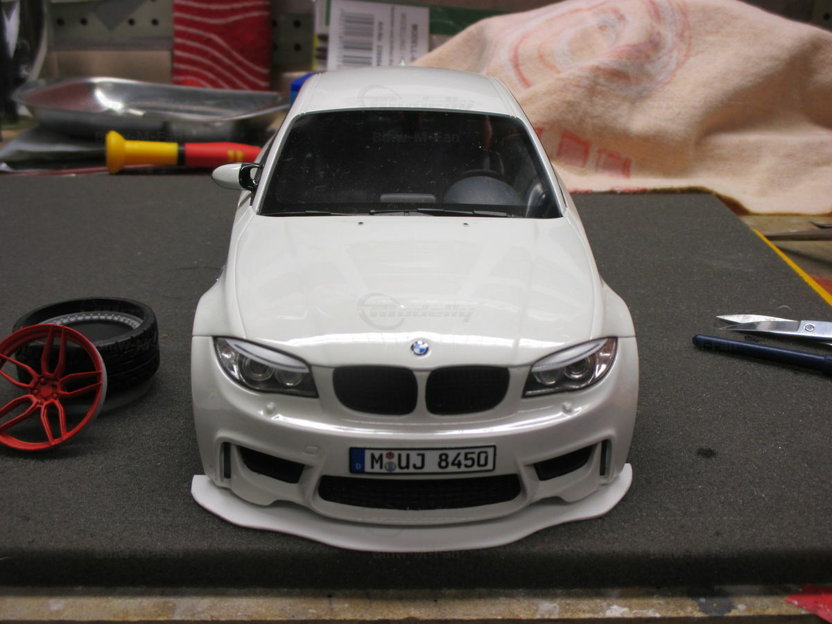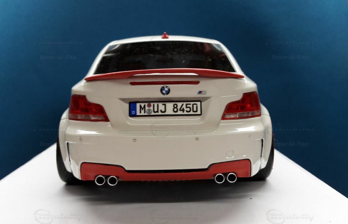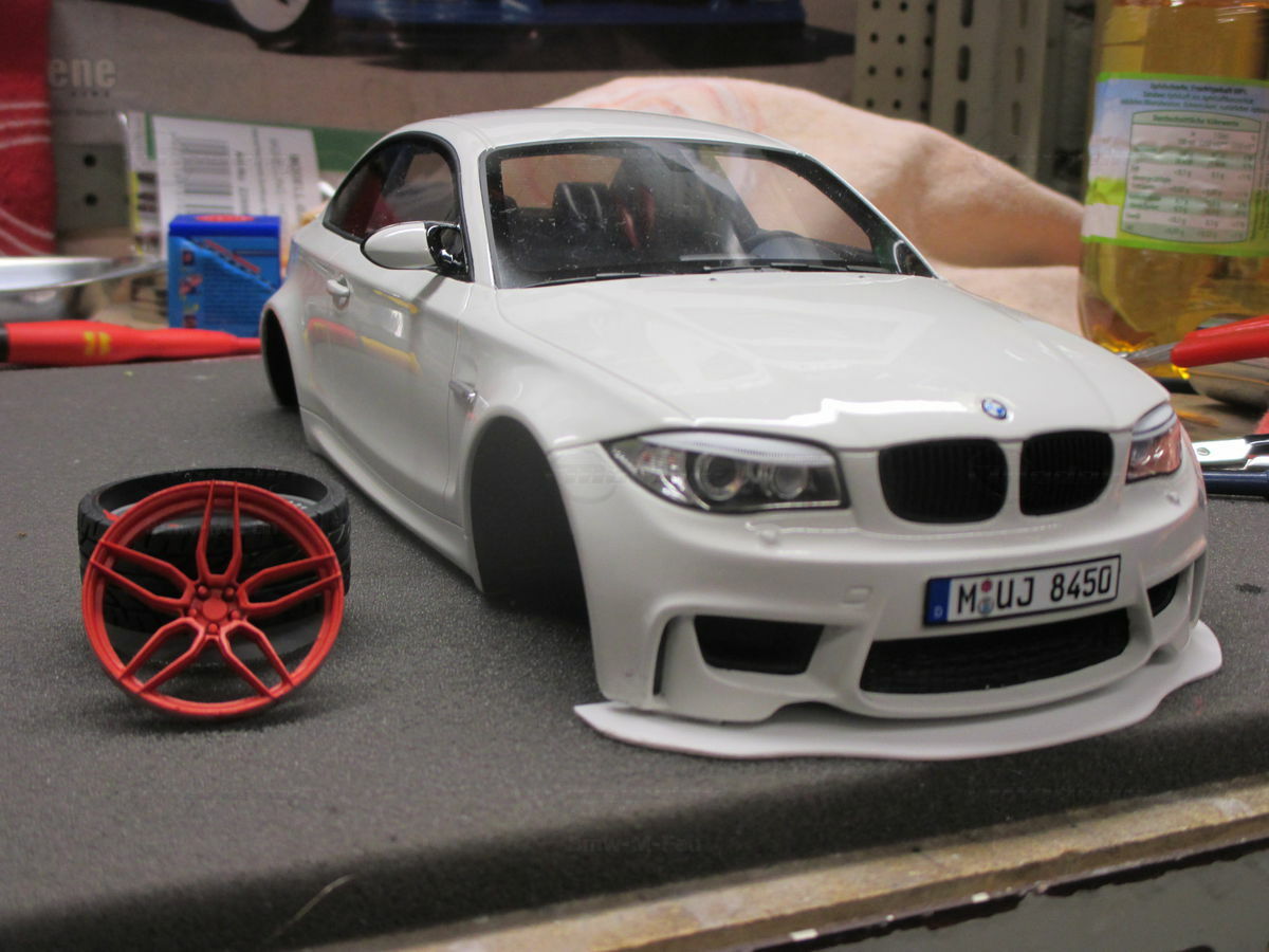 Das gezeigte Modellauto im Maßstab 1:18 ist ein Nachbau des BMW E82 1M Coupe und wurde von GT Spirit hergestellt. Es handelt sich dabei um eine stark modifizierte Version, die nicht das von GT Spirit ursprünglich produzierte Produkt repräsentiert. Dieses Modell besteht aus dem Material Resin, das für seine Detailgetreue und Langlebigkeit bekannt ist. Auffällig sind die roten Felgen und Details, die dem Modell eine besondere Note verleihen. Die aufgebrachten Decals von Marken wie Alpina, Brembo, Eibach und Falken tragen zur Authentizität und Attraktivität des Modells bei. Die auffälligen roten Akzente an den Spiegelkappen und dem Frontspoiler runden das Gesamtbild ab. Es ist klar erkennbar, dass es sich hierbei um eine liebevoll gestaltete und individualisierte Miniatur im Besitz von Modelly-Mitglied "Bmw-M-Fan" handelt.