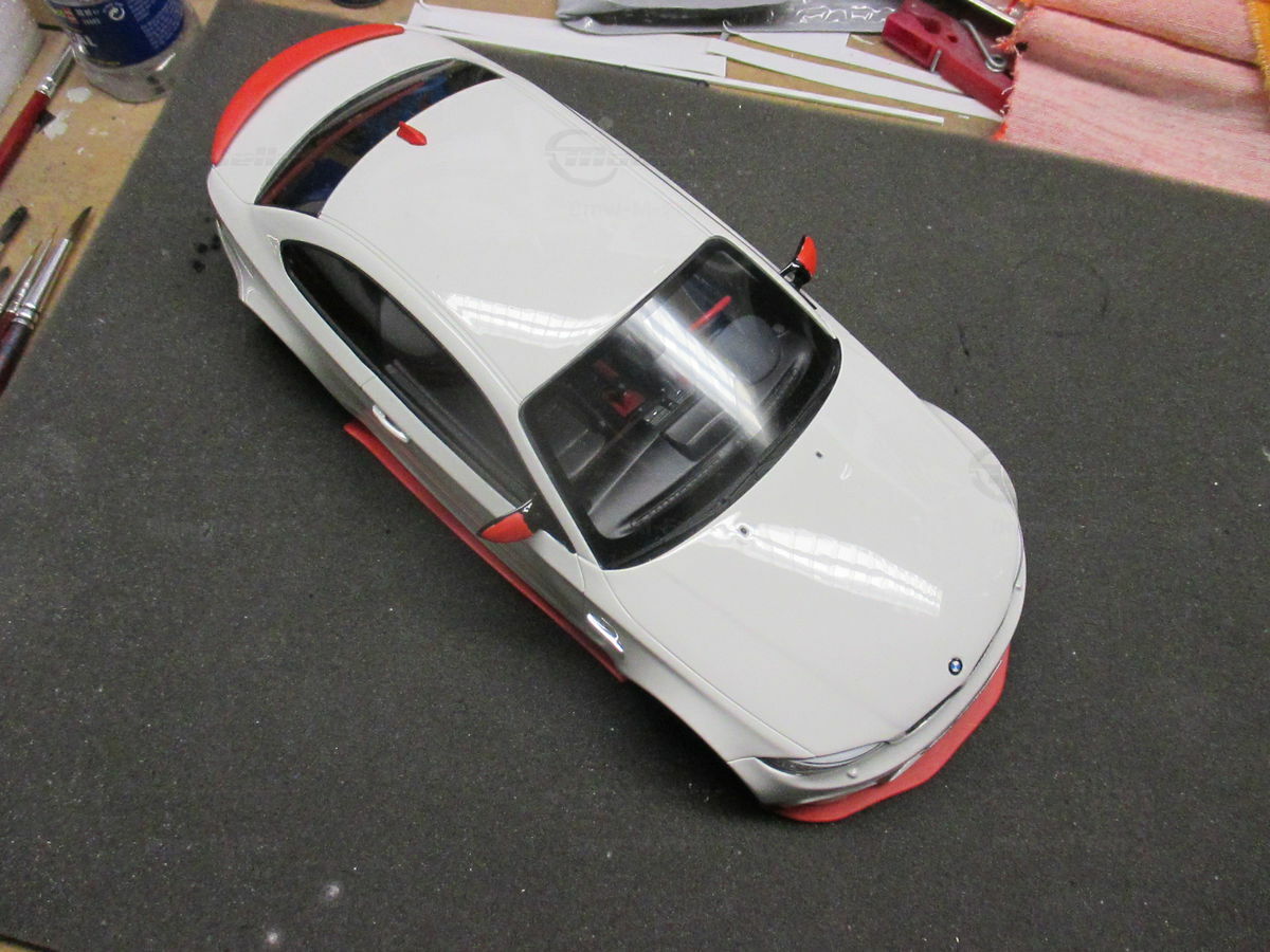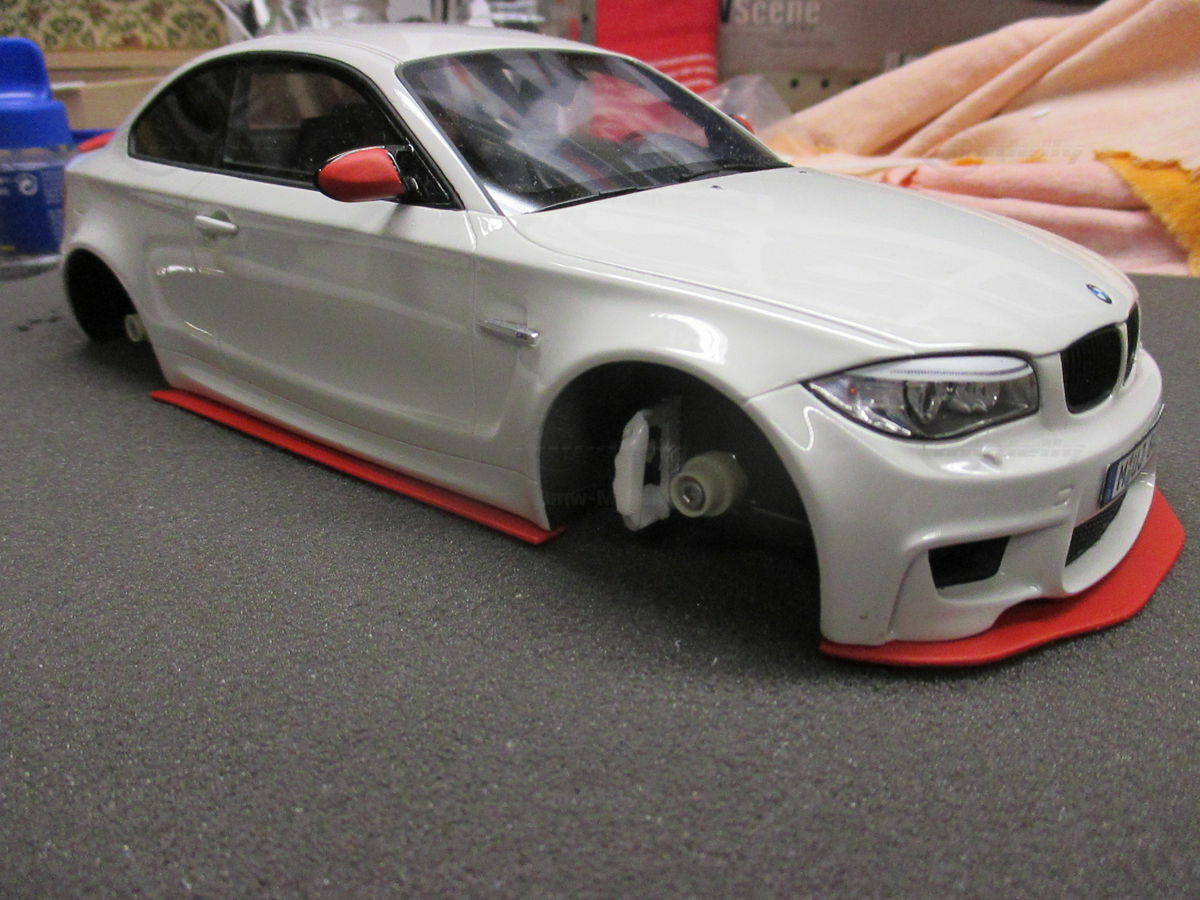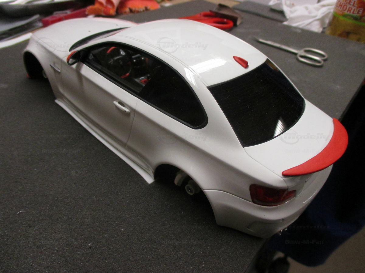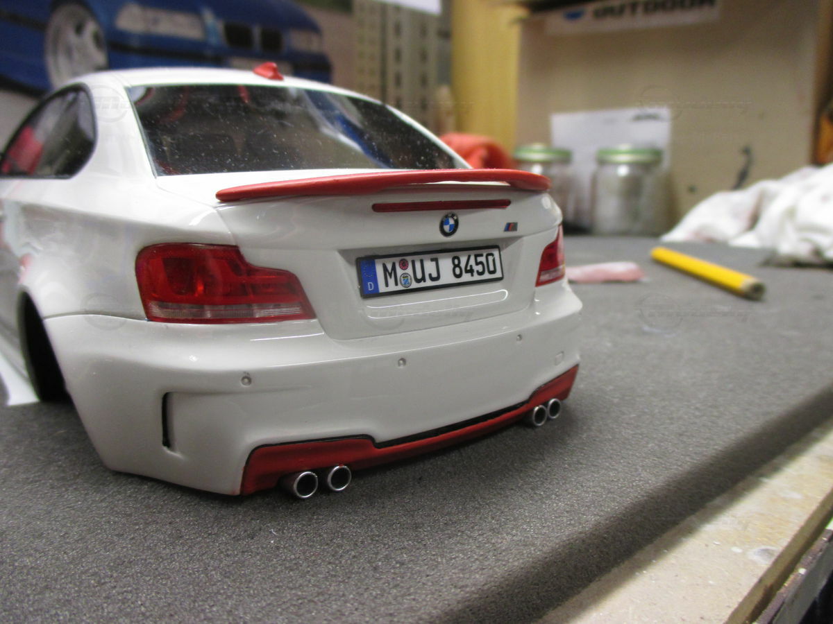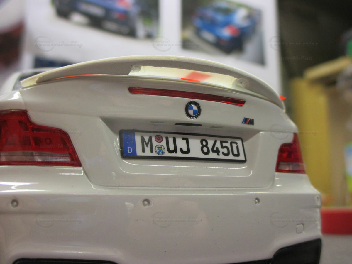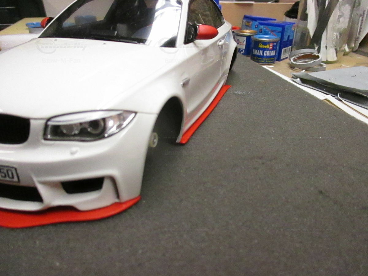 Das gezeigte Modellauto im Maßstab 1:18 ist ein Nachbau des BMW E82 1M Coupe und wurde von GT Spirit hergestellt. Es handelt sich dabei um eine stark modifizierte Version, die nicht das von GT Spirit ursprünglich produzierte Produkt repräsentiert. Dieses Modell besteht aus dem Material Resin, das für seine Detailgetreue und Langlebigkeit bekannt ist. Auffällig sind die roten Felgen und Details, die dem Modell eine besondere Note verleihen. Die aufgebrachten Decals von Marken wie Alpina, Brembo, Eibach und Falken tragen zur Authentizität und Attraktivität des Modells bei. Die auffälligen roten Akzente an den Spiegelkappen und dem Frontspoiler runden das Gesamtbild ab. Es ist klar erkennbar, dass es sich hierbei um eine liebevoll gestaltete und individualisierte Miniatur im Besitz von Modelly-Mitglied "Bmw-M-Fan" handelt.
