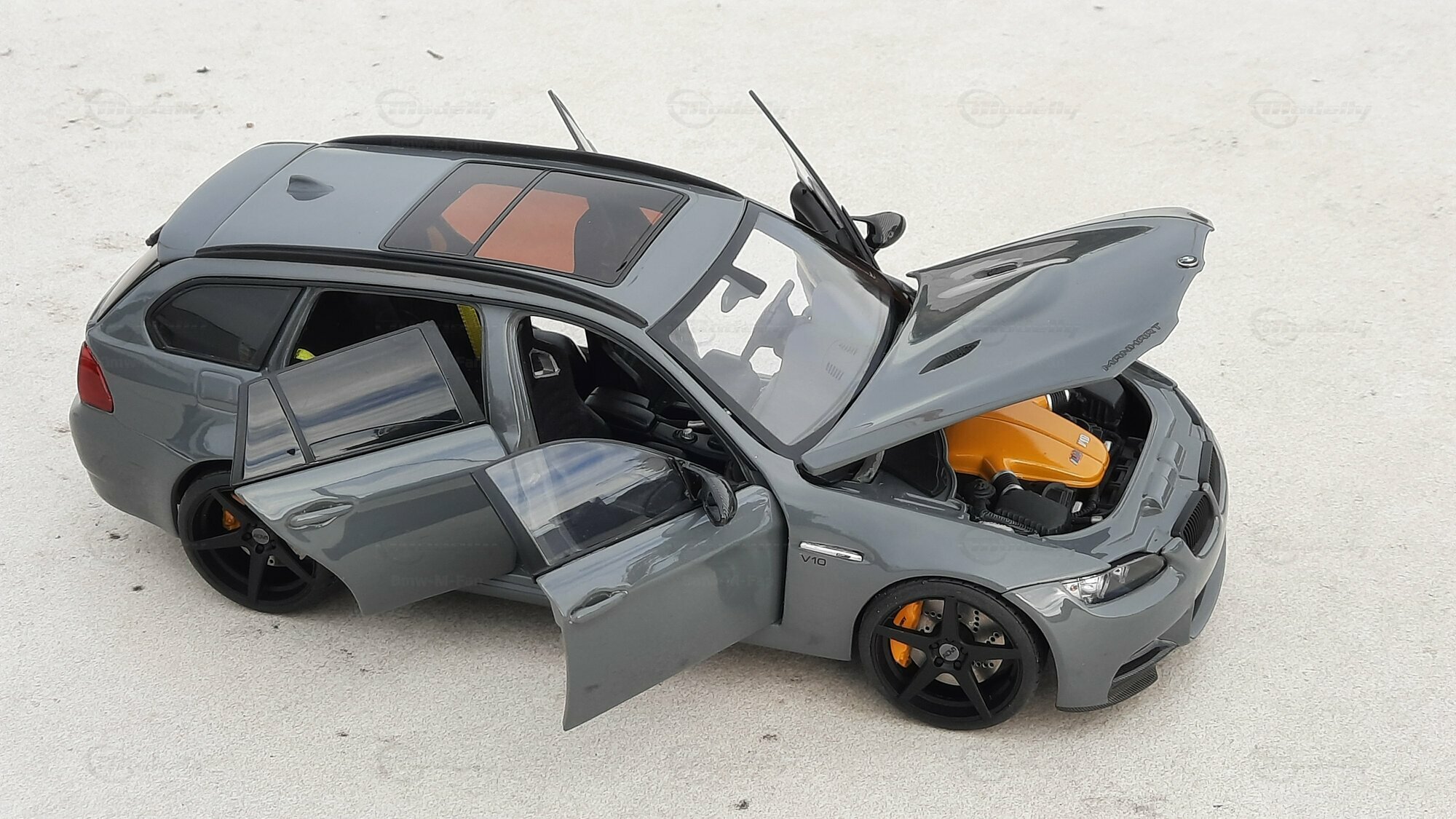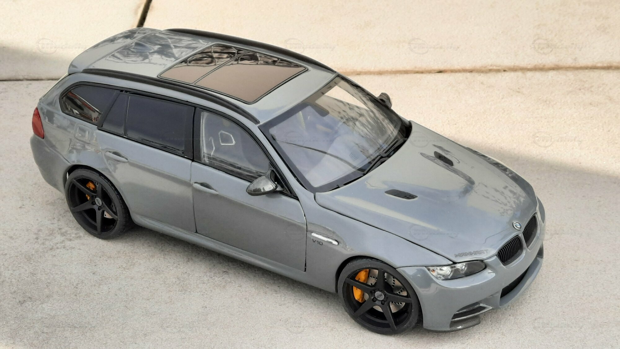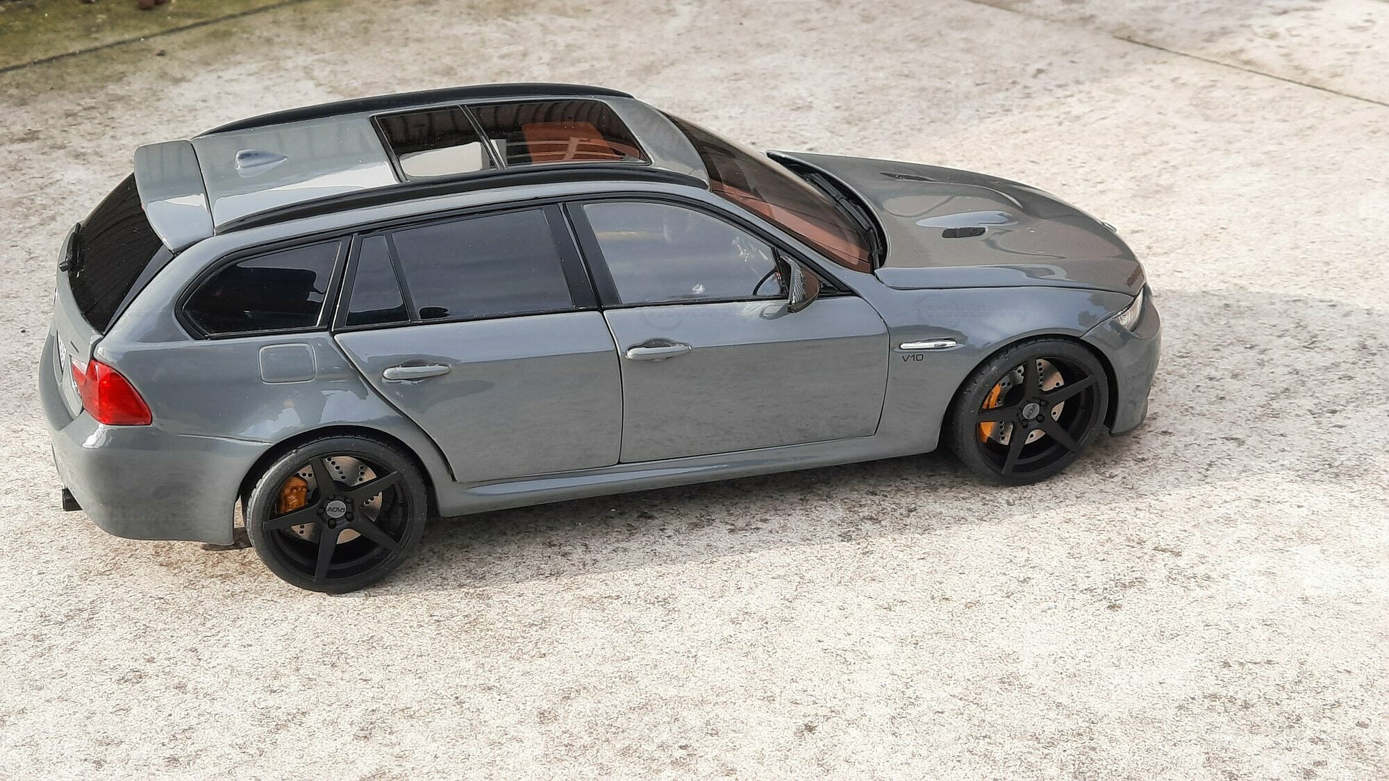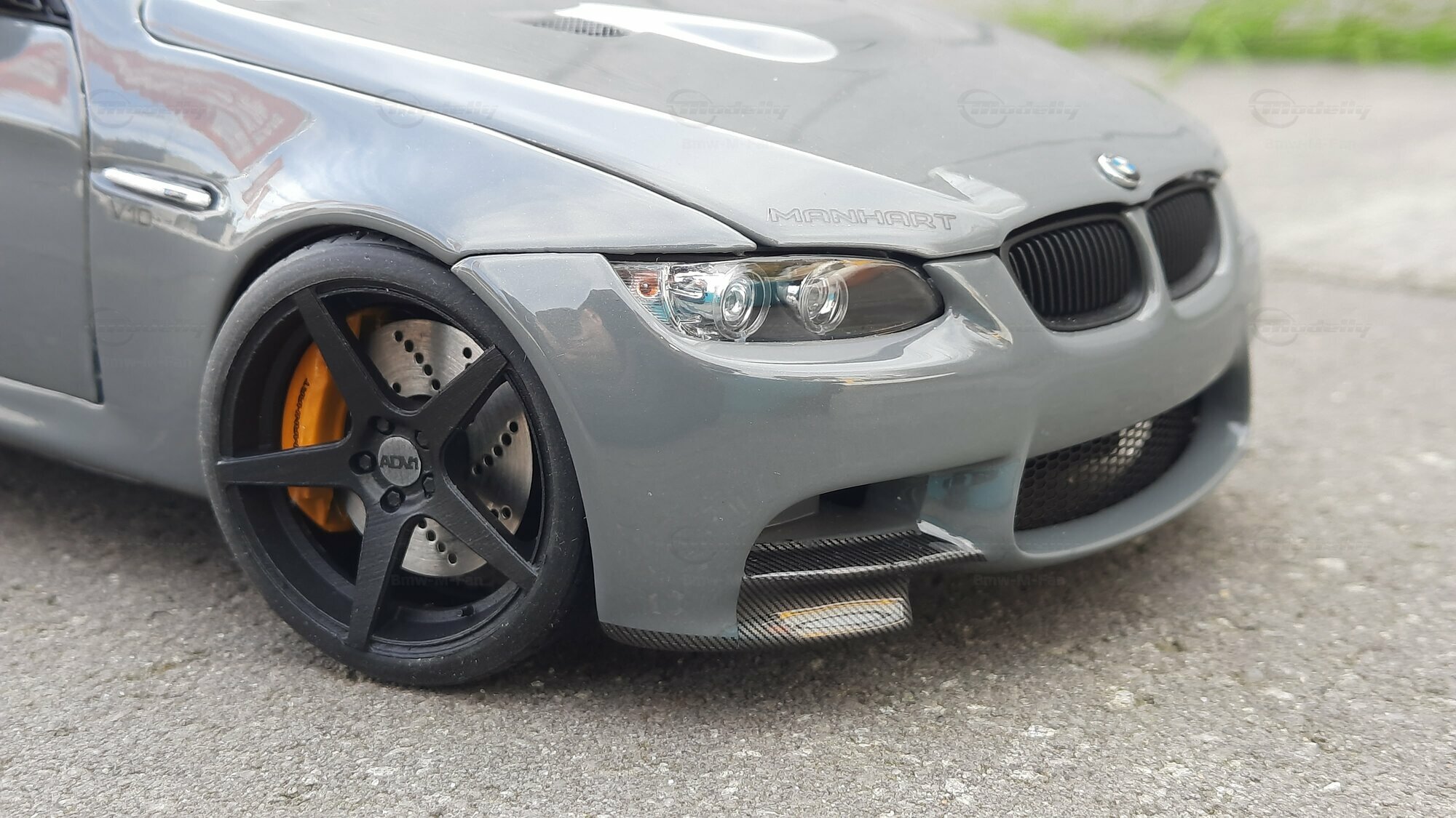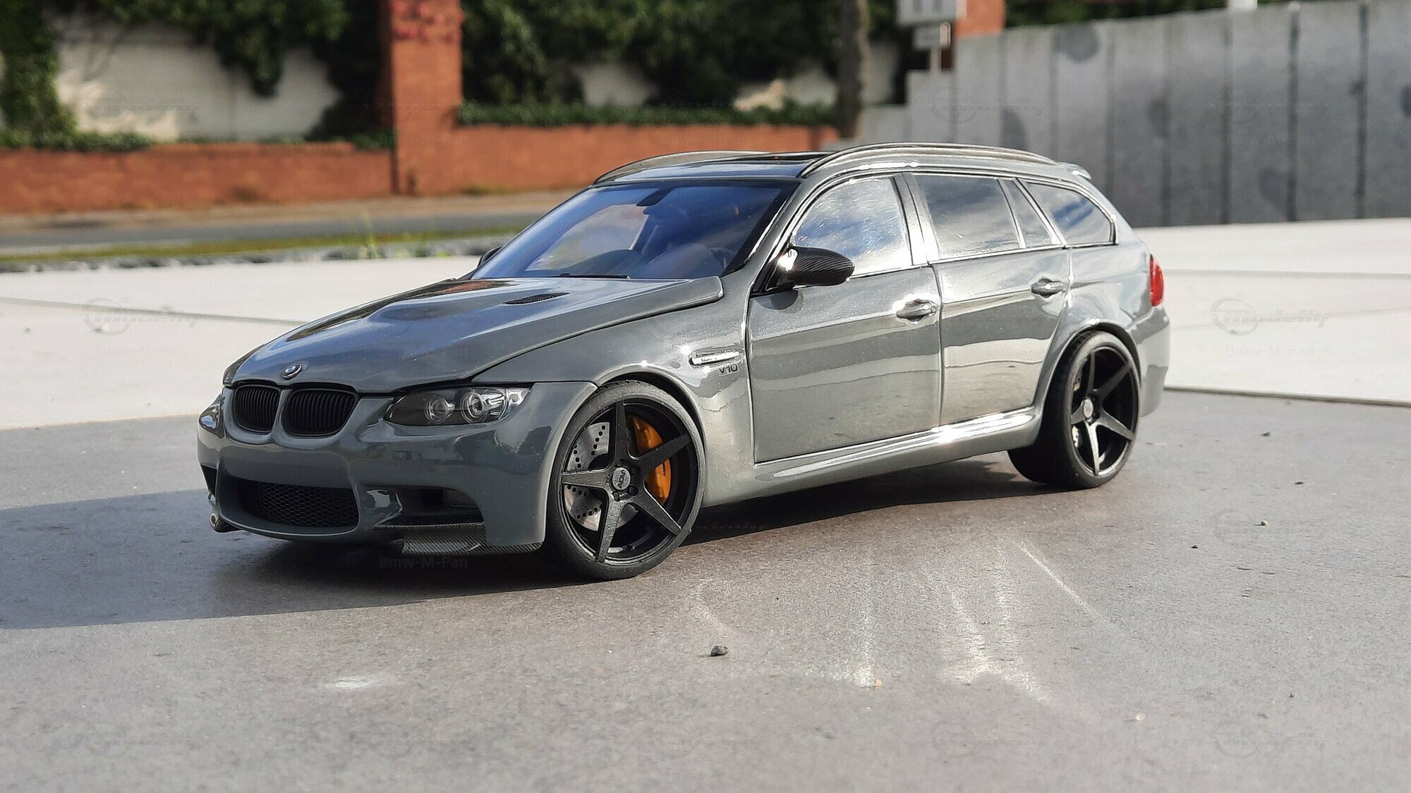 Das Modell von Kyosho welches als Basis alleine mit dem e91 Touring,e92 M3 und Heckstosstange e90 M3 verbunden wurde sticht durch spezifische Tuning-Merkmale hervor, die auf den Bildern gut sichtbar sind. Die X6M Bremse vorne und e60 M5 Bremse hinten werden durch die 20 Zoll ADV 1 5.1 Felgen ergänzt.
