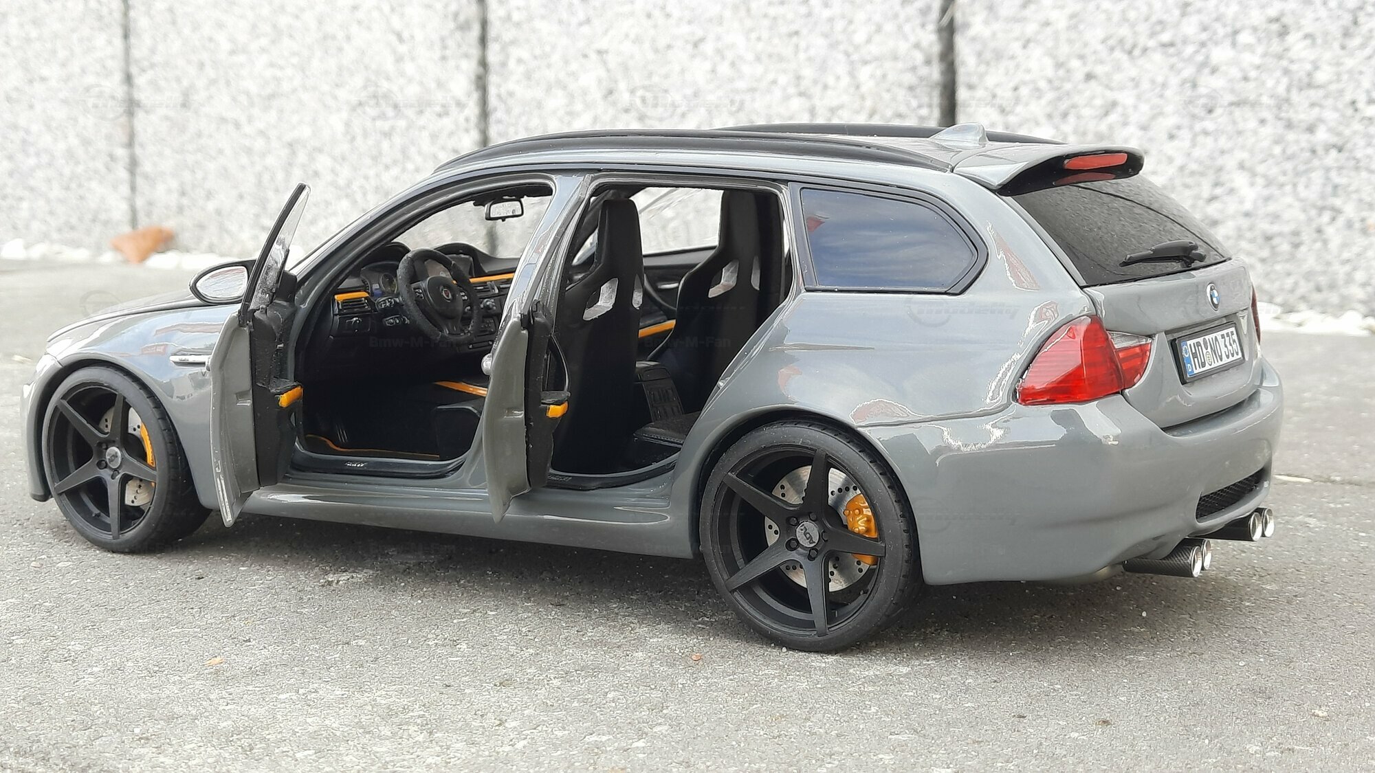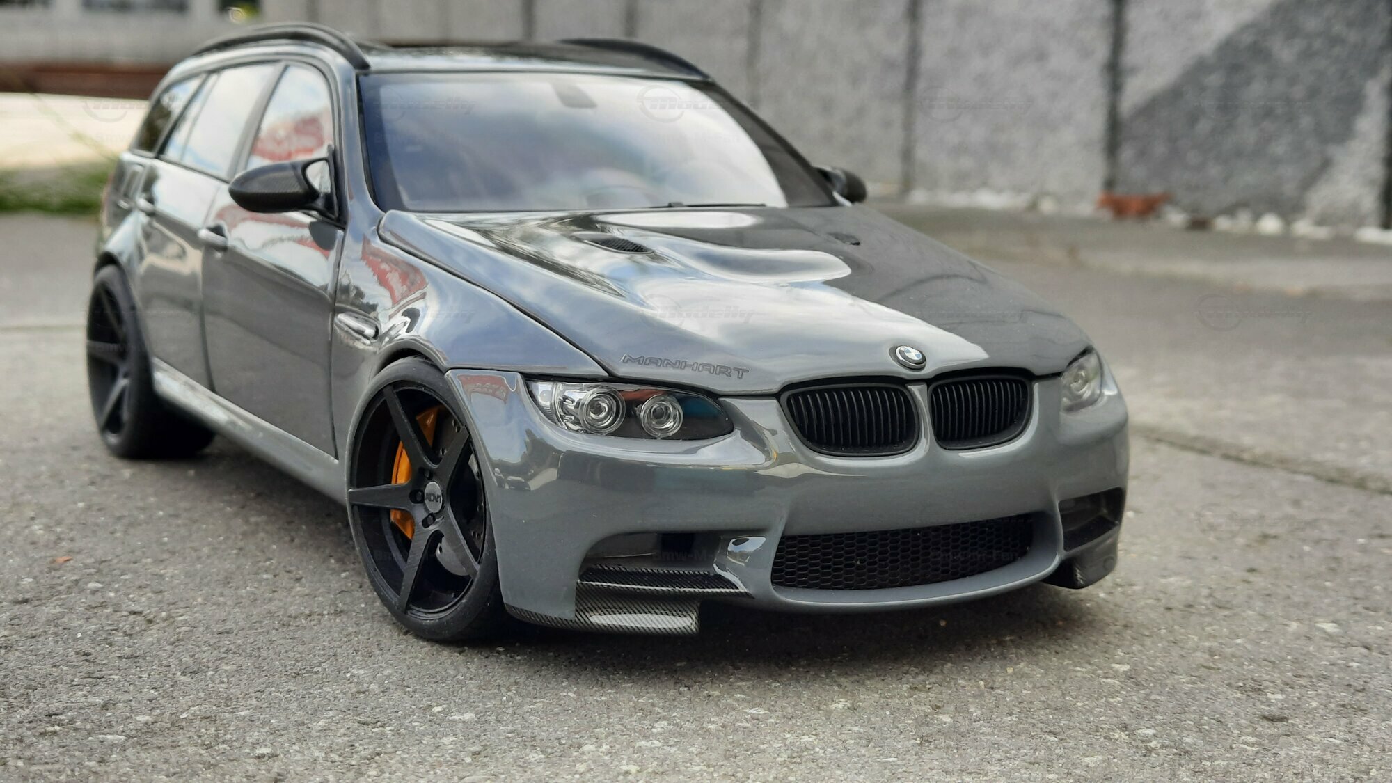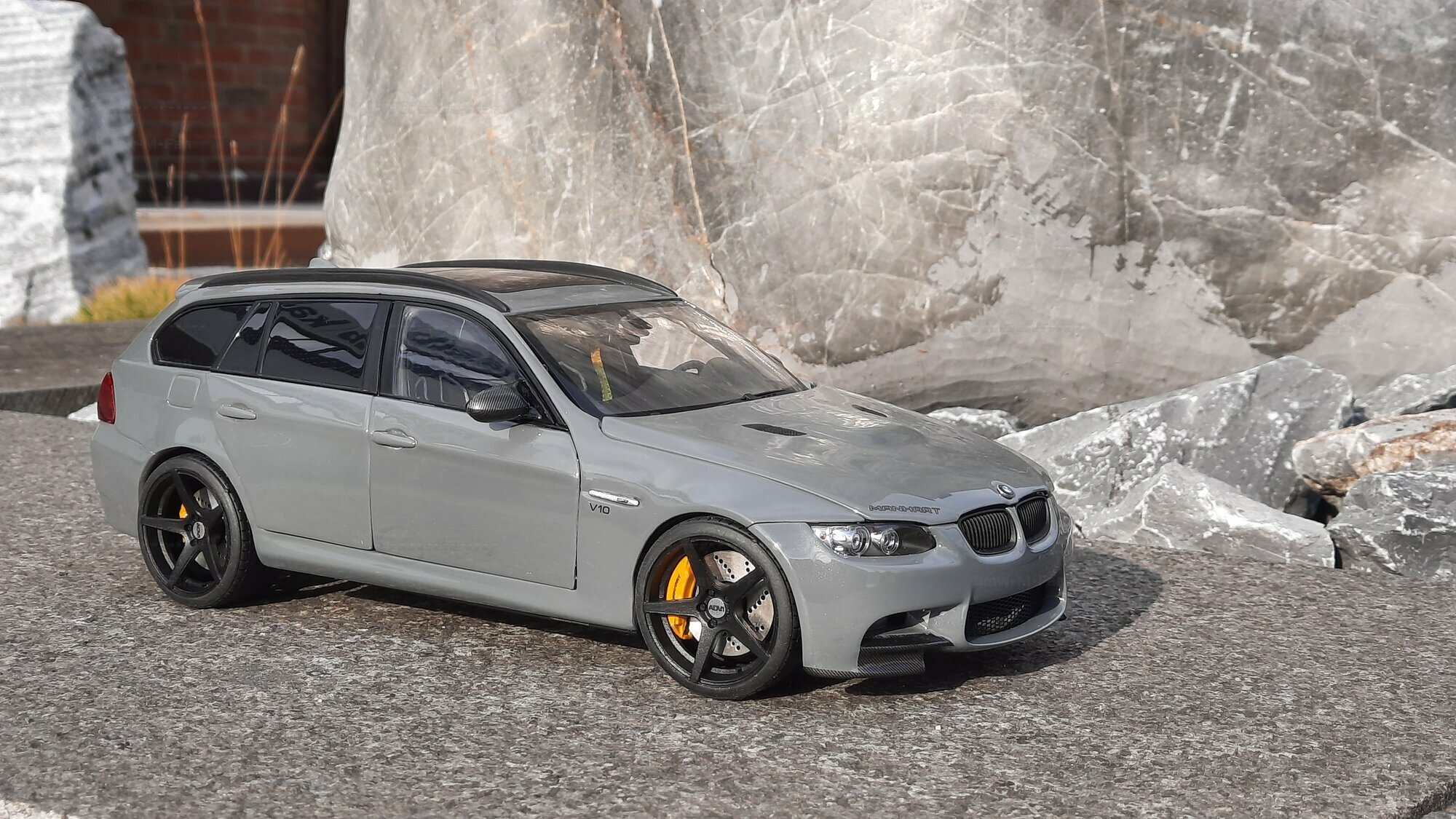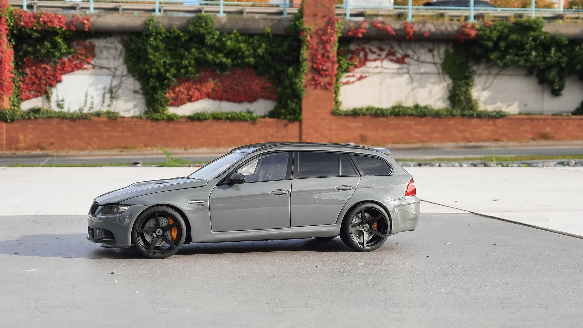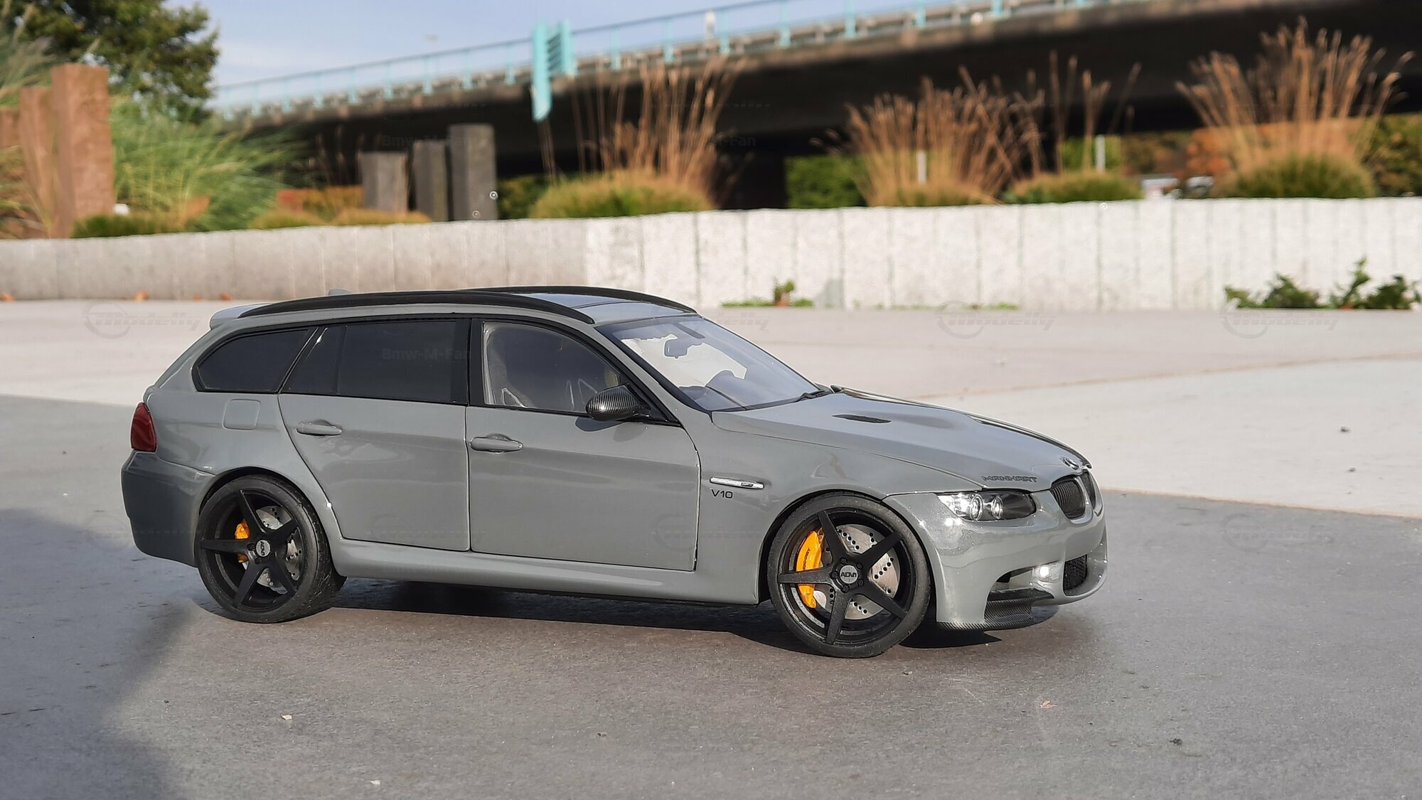 Das Modell von Kyosho welches als Basis alleine mit dem e91 Touring,e92 M3 und Heckstosstange e90 M3 verbunden wurde sticht durch spezifische Tuning-Merkmale hervor, die auf den Bildern gut sichtbar sind. Die X6M Bremse vorne und e60 M5 Bremse hinten werden durch die 20 Zoll ADV 1 5.1 Felgen ergänzt.
