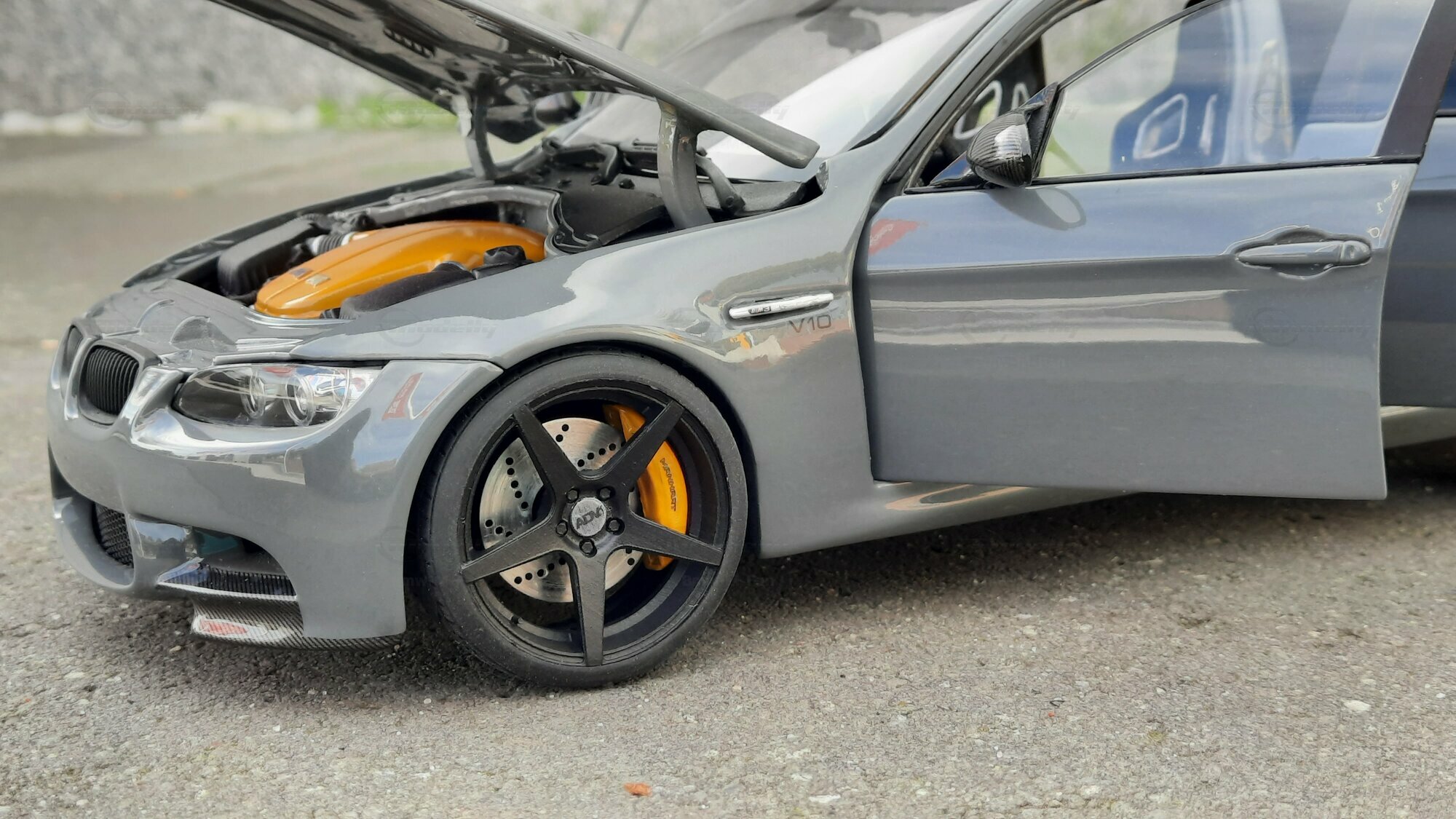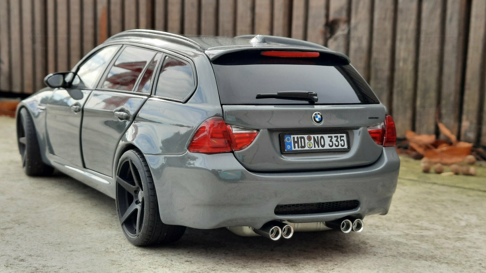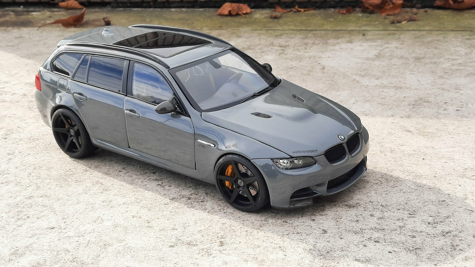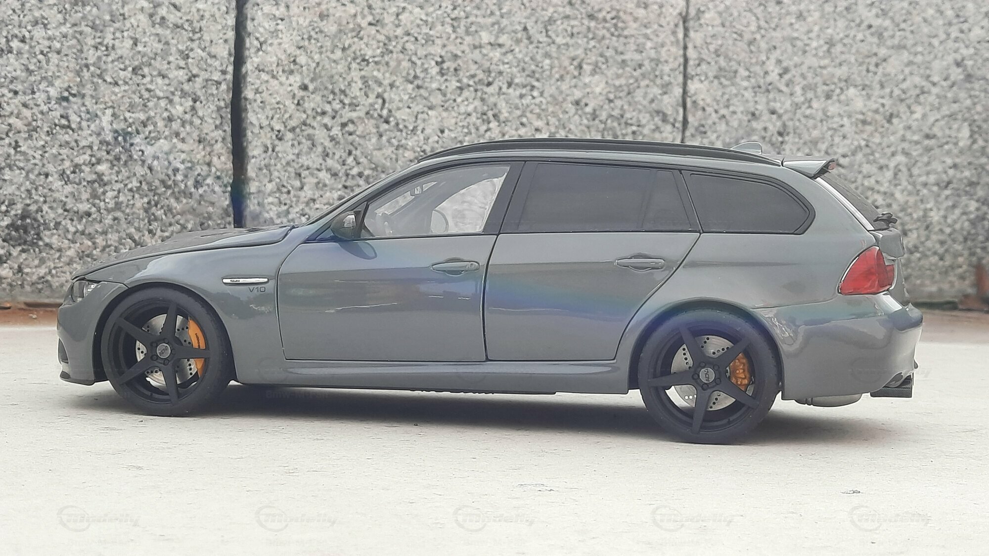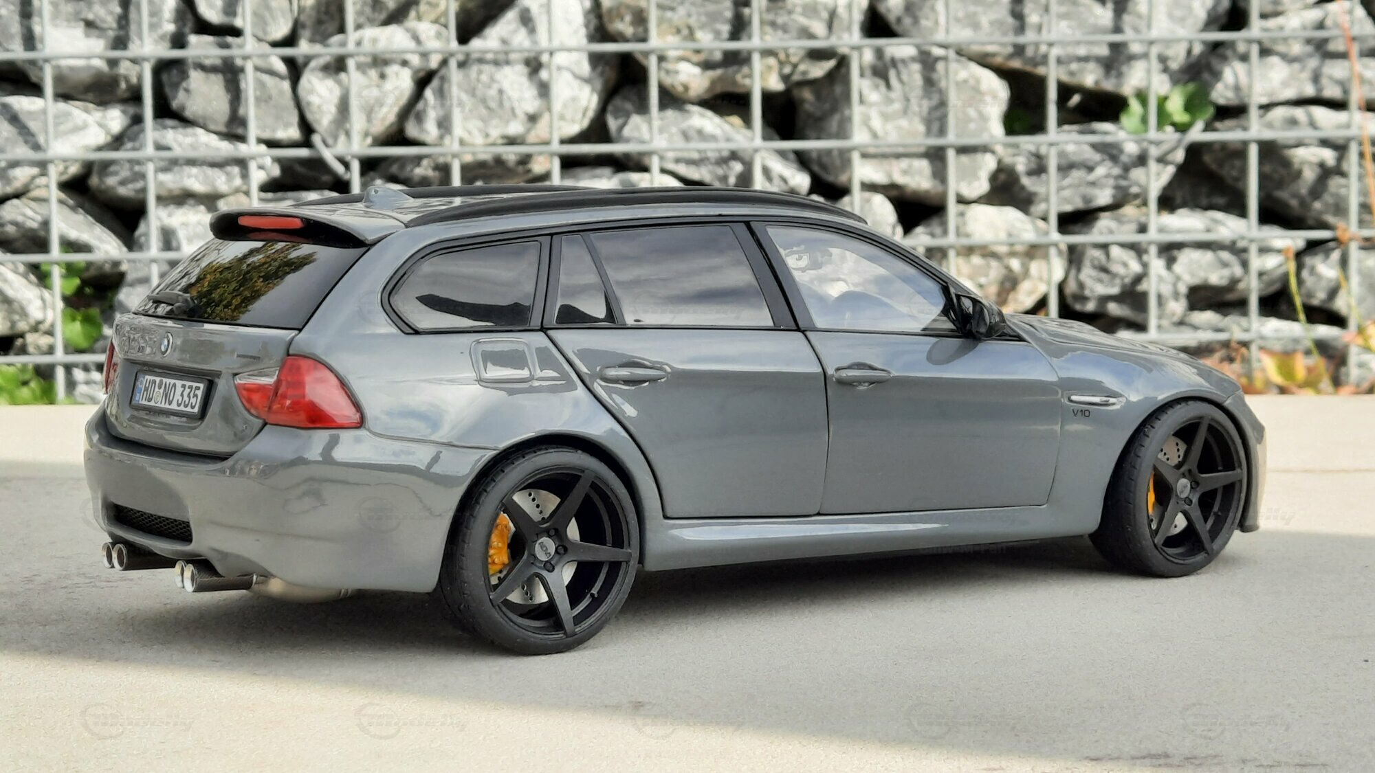 Das Modell von Kyosho welches als Basis alleine mit dem e91 Touring,e92 M3 und Heckstosstange e90 M3 verbunden wurde sticht durch spezifische Tuning-Merkmale hervor, die auf den Bildern gut sichtbar sind. Die X6M Bremse vorne und e60 M5 Bremse hinten werden durch die 20 Zoll ADV 1 5.1 Felgen ergänzt.