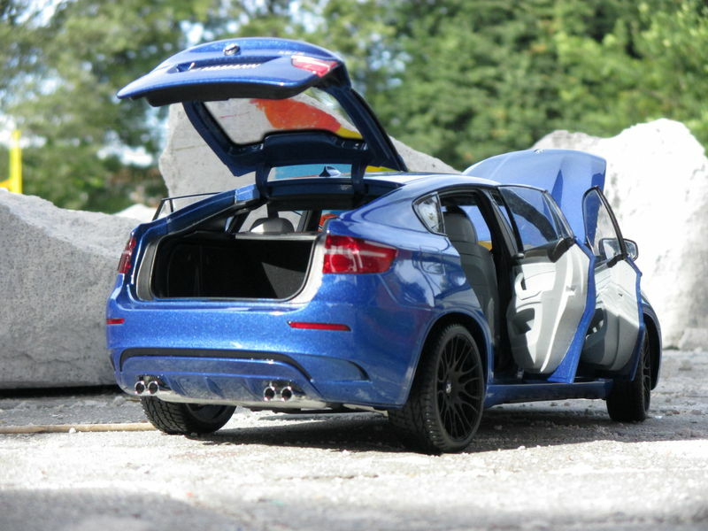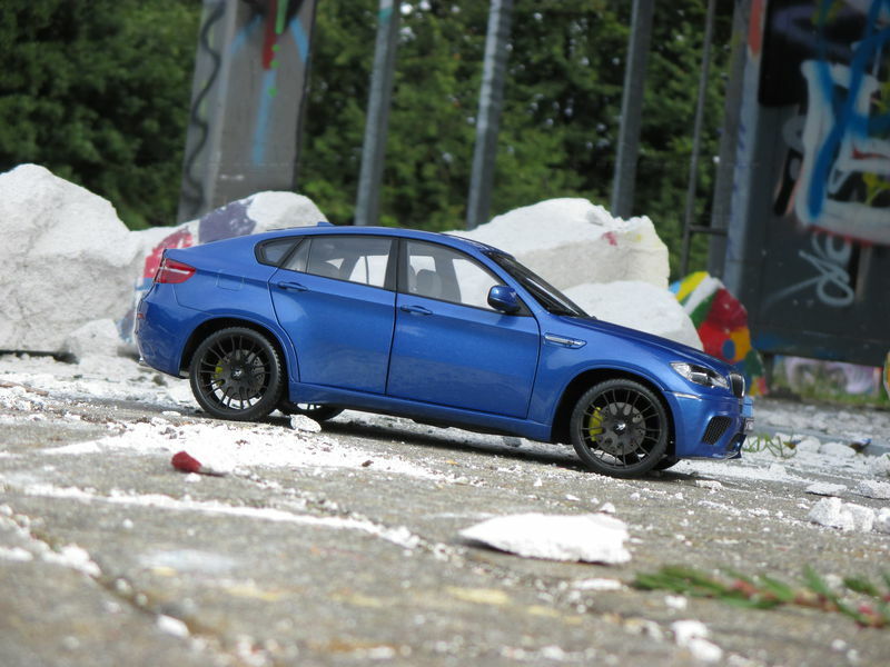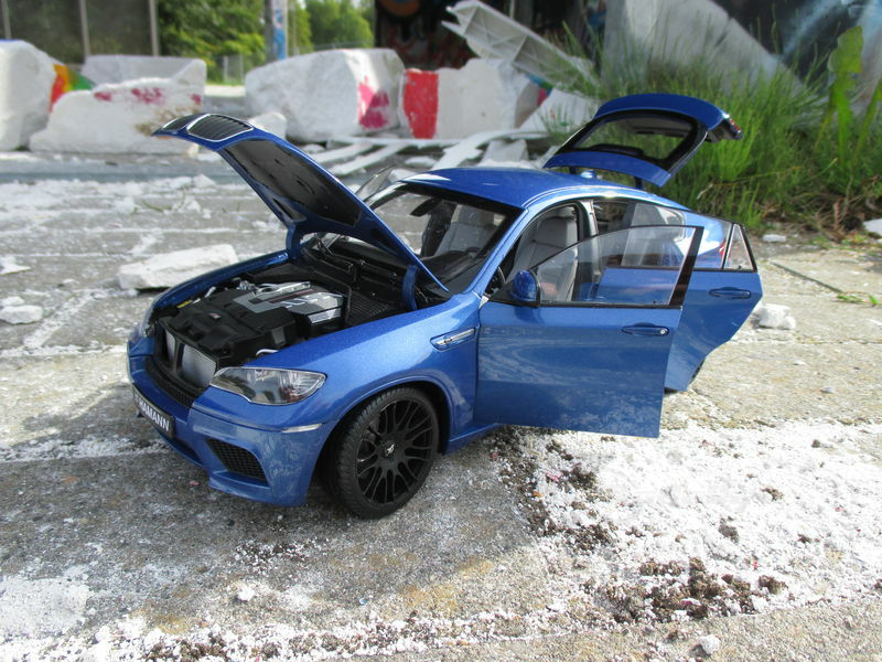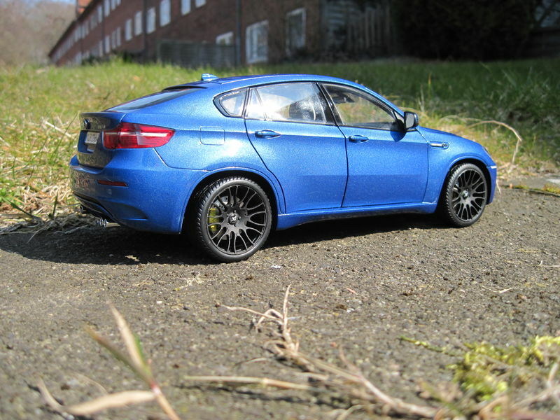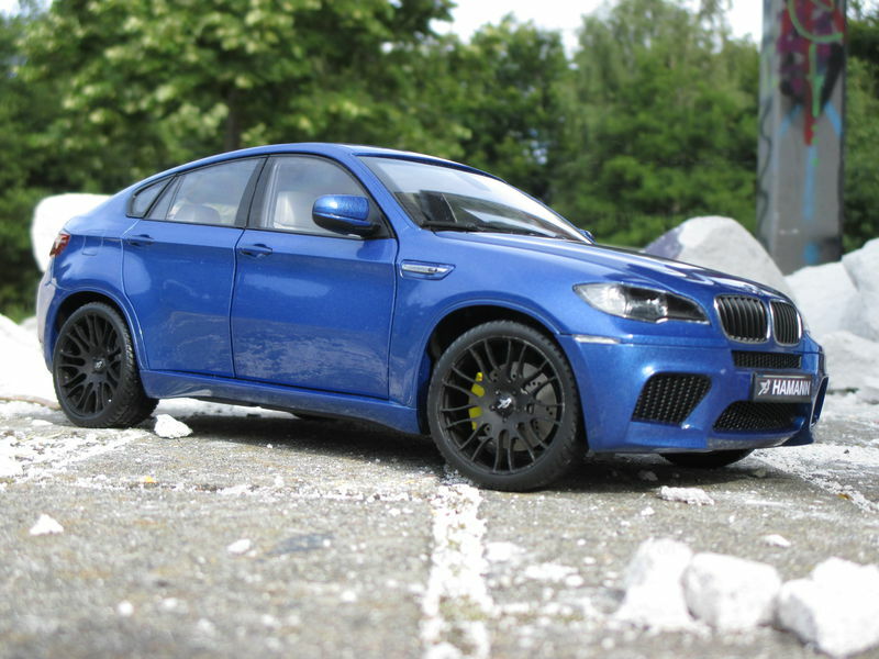 Dieses modifizierte Modellauto in 1:18 Maßstab, das auf dem BMW X6 M basiert, weist eine markante blaue Lackierung auf, die unter freiem Himmel besonders lebendig und reflektierend wirkt. Die fotorealistische Nachbildung zeigt weitere Tuning-Elemente, die nicht im Standardmodell von Kyosho enthalten sind. Ein besonderes Highlight sind die speziellen Hamann Felgen, die in mattem Schwarz gehalten sind und den sportlichen Charakter des Fahrzeugs betonen. Weitere Details wie gelbe Bremssättel und ein tiefer gelegtes Fahrwerk machen dieses Modell zu einem Hingucker in jedermanns Sammlung. Sammler aus der ganzen Welt können dieses Modell aufgrund seiner Einzigartigkeit und detailierten Modifikationen besonders schätzen.