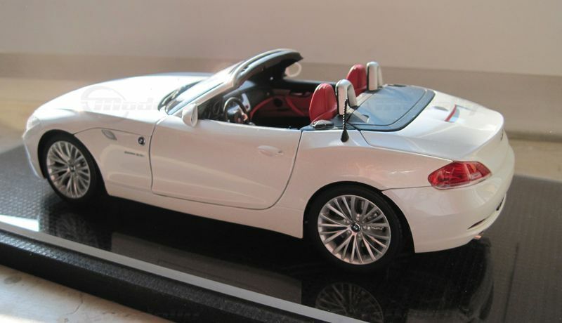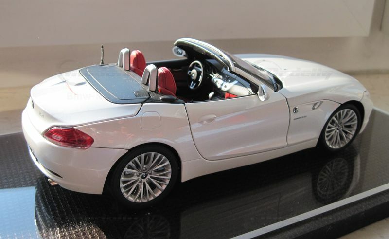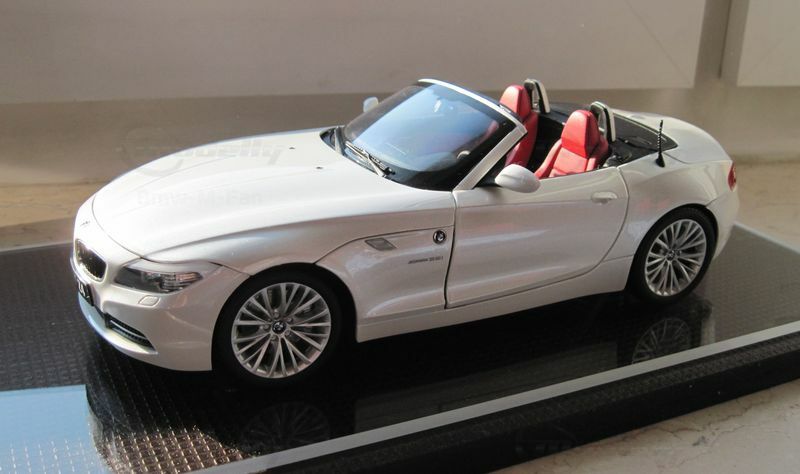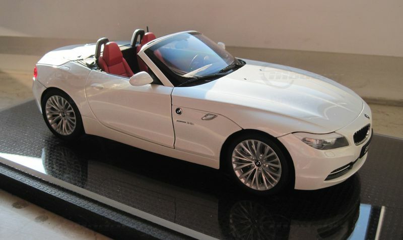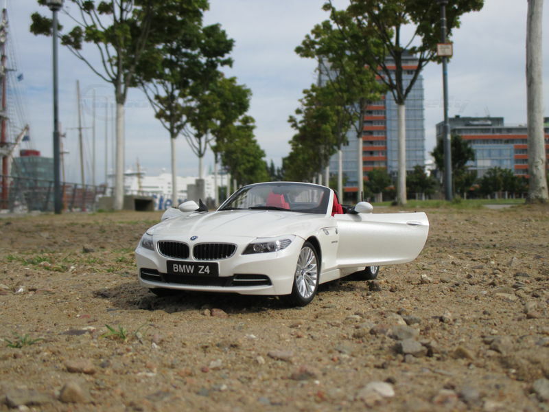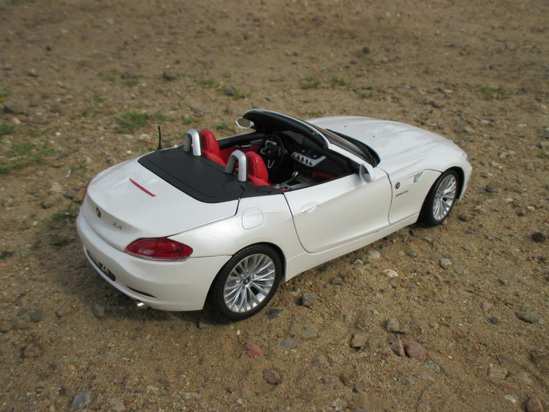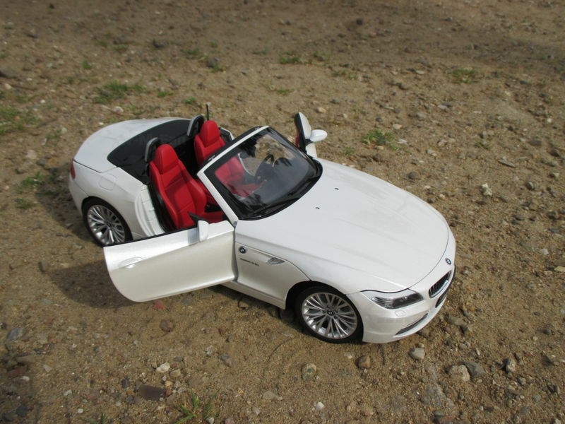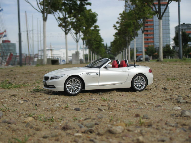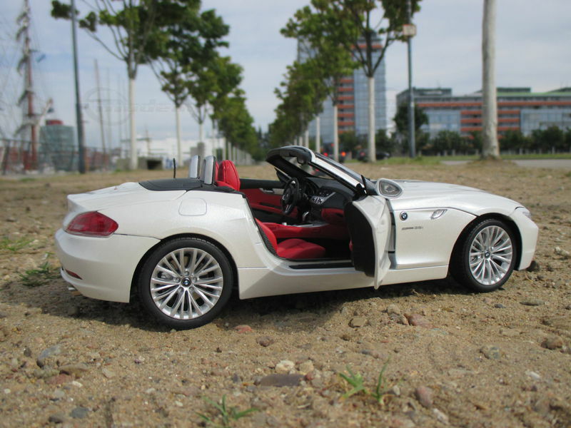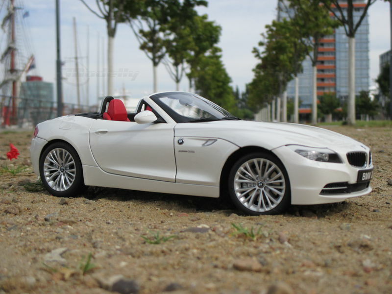 Das hier gezeigte Modell des BMW Z4 E89 ist im Maßstab 1:18 gehalten und wurde von Kyosho gefertigt. Es gehört zur Sammlung des Modelly-Mitglieds "Bmw-M-Fan". Von vorne betrachtet, erkennt man die charakteristischen Nieren des BMW-Grills und die scharf gezeichneten Scheinwerfer. Die Lackierung ist klassisch Weiß, das dem Fahrzeug eine edle Erscheinung verleiht. Besonders ins Auge fällt die rote Innenausstattung, die einen schönen Kontrast zur Außenfarbe darstellt und das sportliche Ambiente betont.