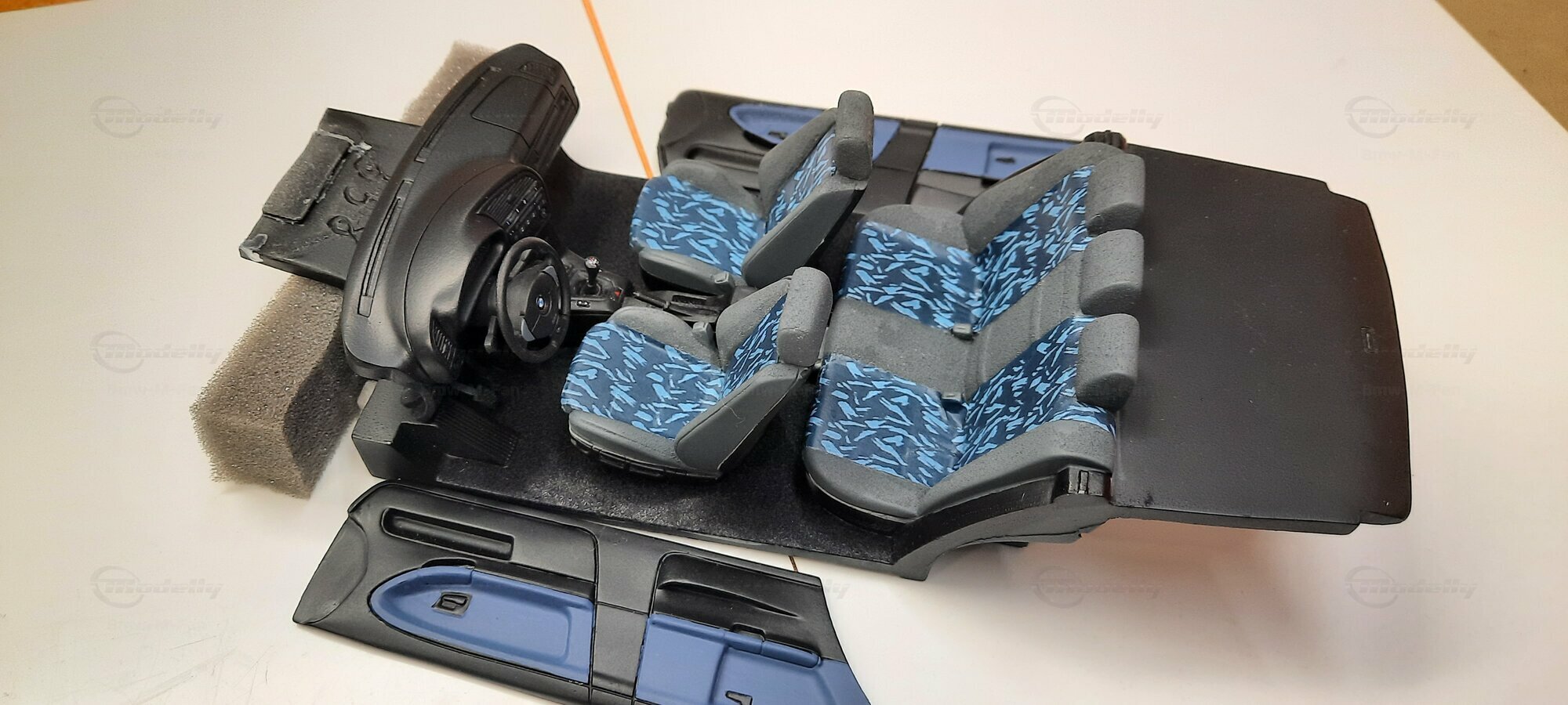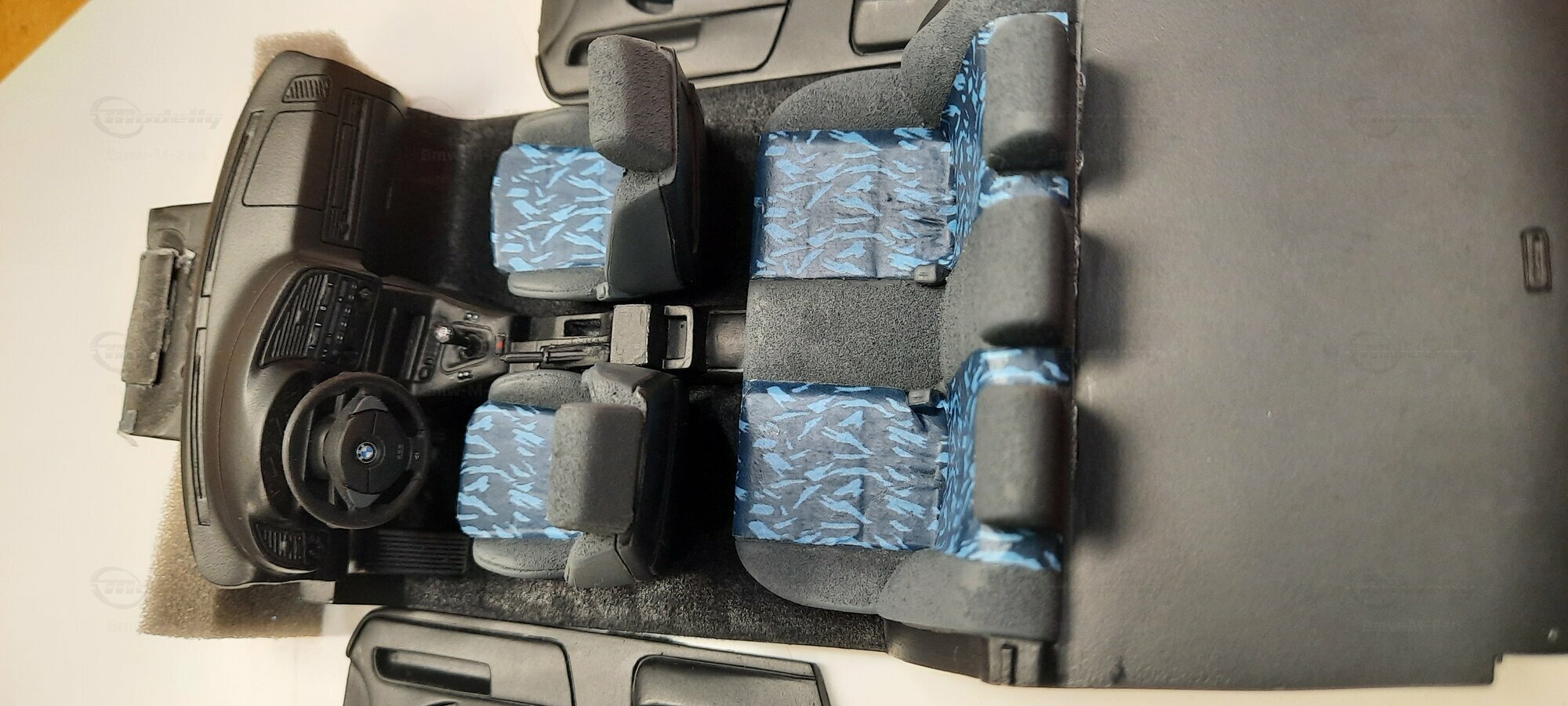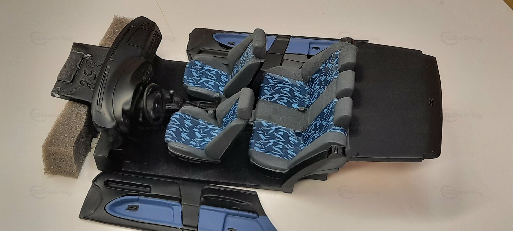 Das Modell zeigt ein einzigartiges Erscheinungsbild mit einem kräftigen Blauton und sorgfältig platzierten Details wie Hochglanzfelgen und einer authentischen Kennzeichenreplik. Leider kann der genaue Felgenhersteller oder das spezielle Modell nicht eindeutig identifiziert werden, doch die Ränder passen perfekt zum sportlichen Äußeren. Das Innere der Miniatur ist dem Original detailgetreu nachempfunden, sichtbar an Instrumententafel und Lenkradgestaltung. Diese Liebe zum Detail macht die Miniatur zu einem bemerkenswerten Sammlerstück, das die Essenz des Originals einfängt.