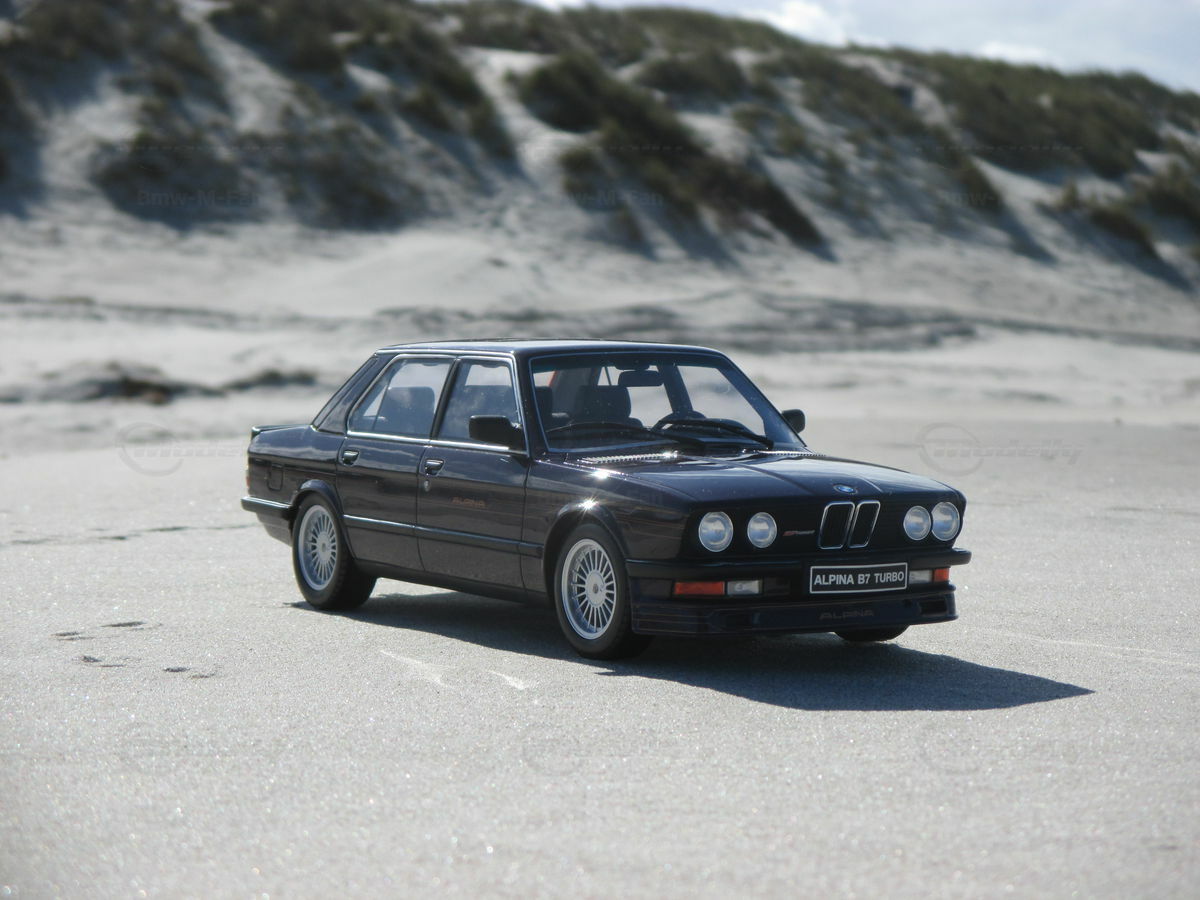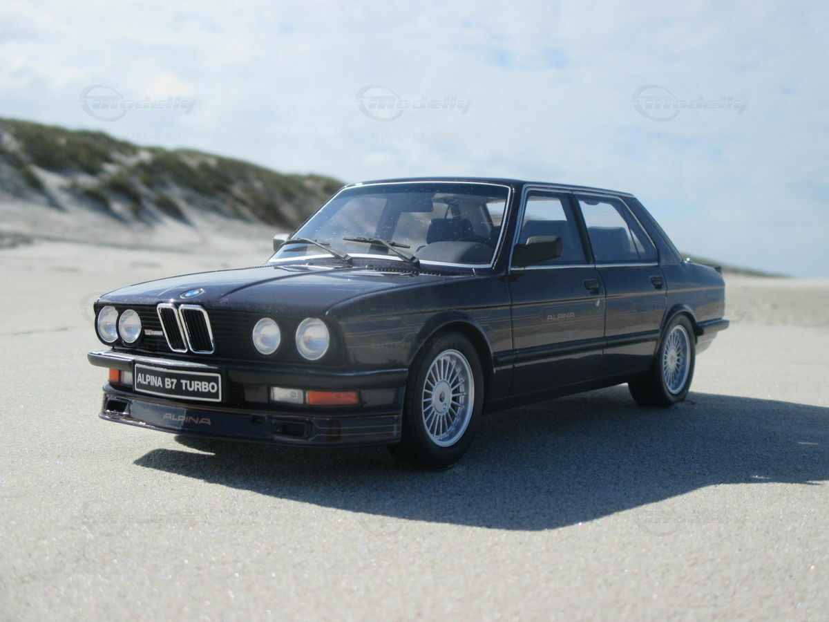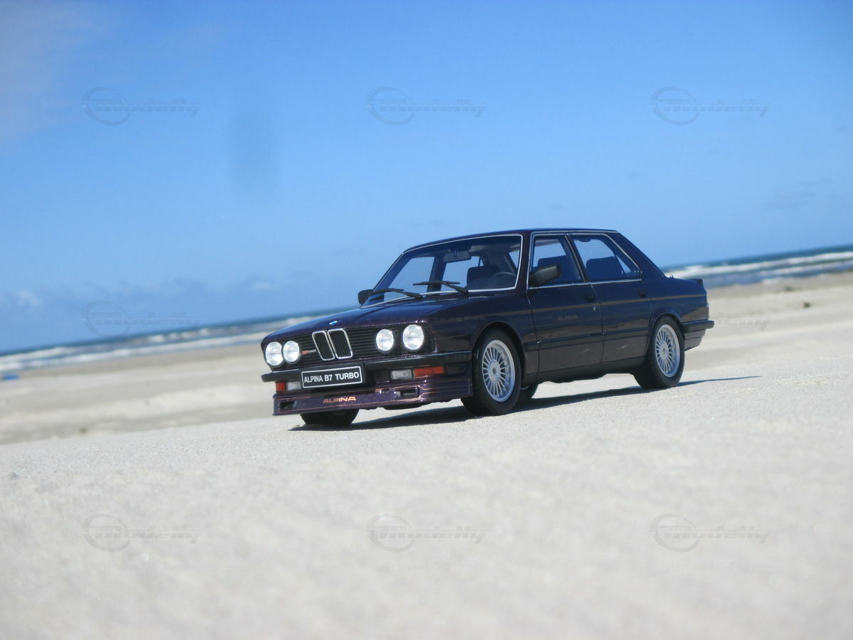 Das hier gezeigte Miniaturmodell ist im Maßstab 1:18 von Otto Models hergestellt und wurde aus hochwertigem Harz gefertigt. Die Detaillierung dieses Modells ist beeindruckend realistisch und fängt die Essenz des Originals ein. Die Karosserie zeigt sich in einem glänzenden Schwarz, ergänzt durch die typischen Alpina-Streifen in Silber, welche der Miniatur ein markantes Aussehen verleihen. Jede Kurve und jedes Detail, von den Frontscheinwerfern über das charakteristische Nieren-Design bis hin zu den Schriftzügen und Logos, wurde mit äußerster Präzision nachgebildet. Die Felgen, ebenfalls speziell von Alpina designt, tragen maßgeblich zum authentischen Eindruck dieser Miniatur bei. Der detailliert ausgearbeitete Frontspoiler mit dem alpina-typischen "Alpina"-Schriftzug unterstreicht den sportlichen Charakter dieser berühmten Limousine. Der Modellauto-Sammler "Bmw-M-Fan", in dessen Sammlung sich dieses Modell befindet, kann sich an einer makellosen Nachbildung erfreuen.