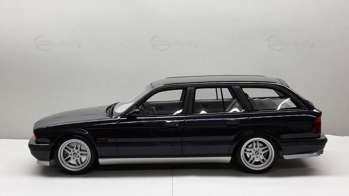 Das 1:18 Modell von Otto Models fängt die Eleganz und das Design des BMW E34 M5 Touring detailgetreu ein. Es ist aus Resin gefertigt, was den Modellen eine hohe Oberflächenqualität und präzise Details verleiht. Der Lack des Modells, der in einem tiefen Schwarz gehalten ist, reflektiert subtil das Licht und bringt die eleganten Linien des Fahrzeugs zur Geltung. Die markante Front mit den vier runden Scheinwerfern und die Rückansicht mit den großen Rückleuchten sind präzise wiedergegeben. Auf den Fotos sind keine besonderen Tuning-Komponenten oder Modifikationen sichtbar, was auf eine klassische Version des Fahrzeugs hinweist. Damit bietet das Modell einen realistischen Nachbau für Sammler, die den Charme des M5 Touring schätzen.
