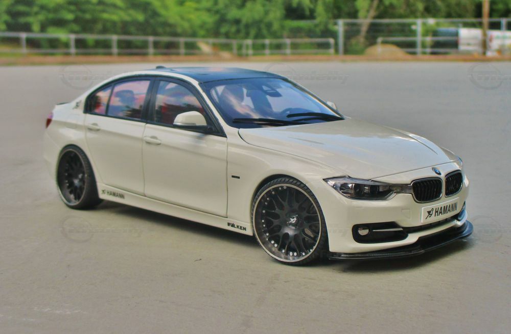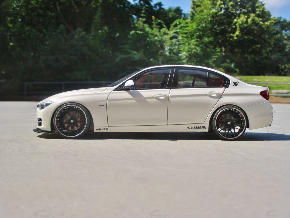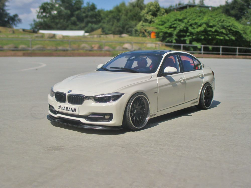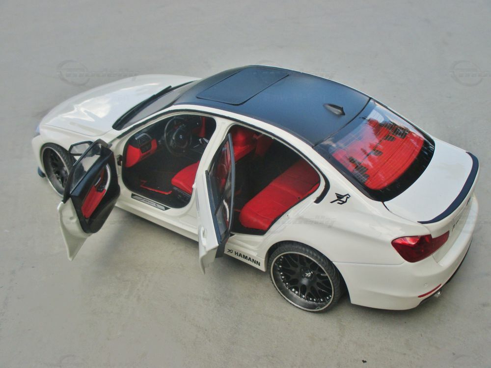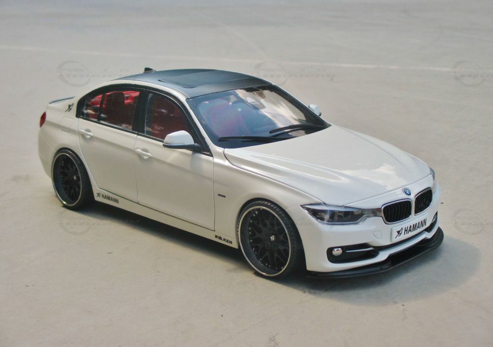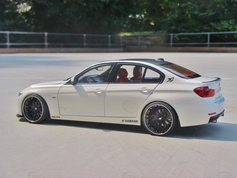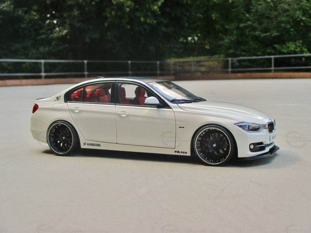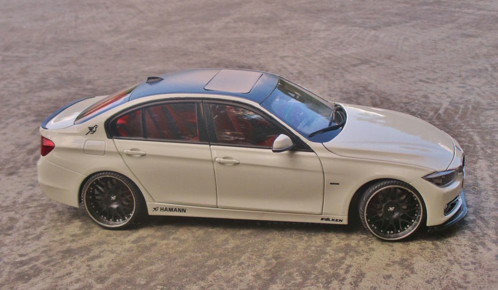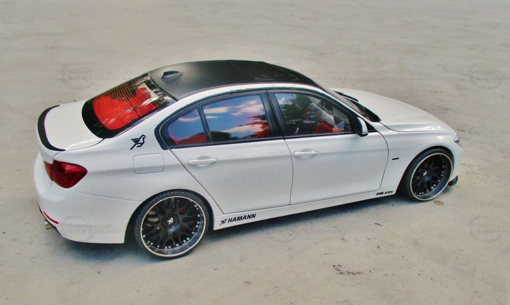 Das hier abgebildete Modellauto im Maßstab 1:18, hergestellt von Paragon, stellt eine modifizierte Version des BMW F30 335i dar. Es handelt sich hierbei nicht um das vom Hersteller ursprünglich produzierte Produkt. Die auffälligsten Modifikationen umfassen das Tuning-Kit von Hamann, welches durch den Frontspoiler, die Seitenschweller und den Heckspoiler deutlich zu erkennen ist. Diese Anbauteile verleihen dem Modell eine sportlichere Optik und eine betonte Aggressivität. Auf den Seitenschwellern und dem vorderen unteren Spoiler sind „Hamann“-Logos aufgedruckt, was auf die Anpassung durch diese spezialisierte Tuning-Firma hinweist.