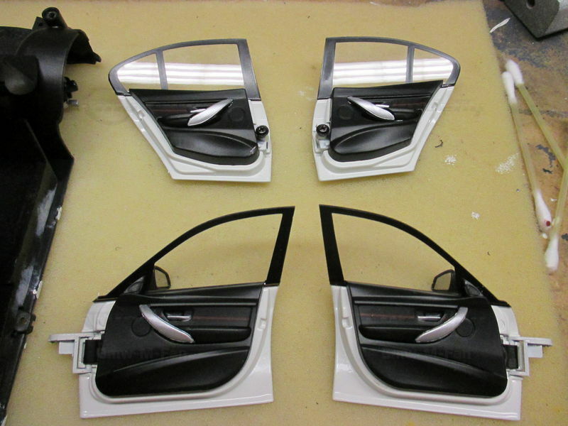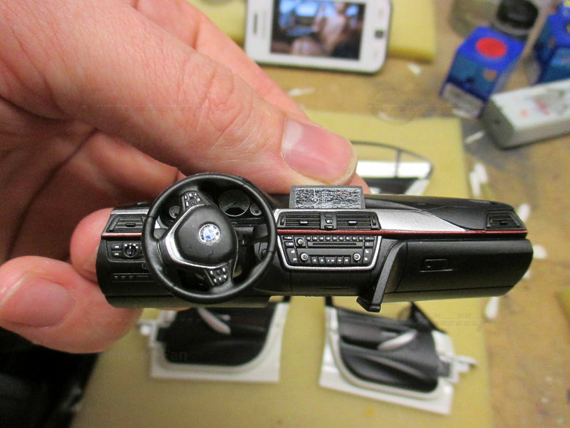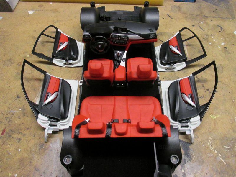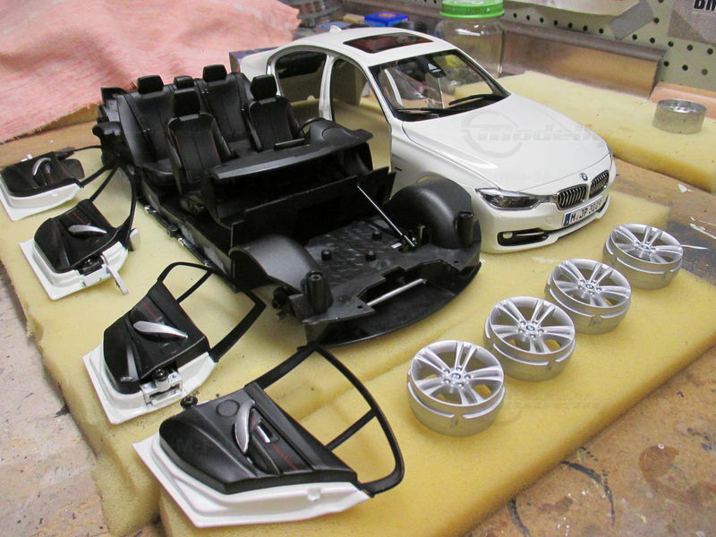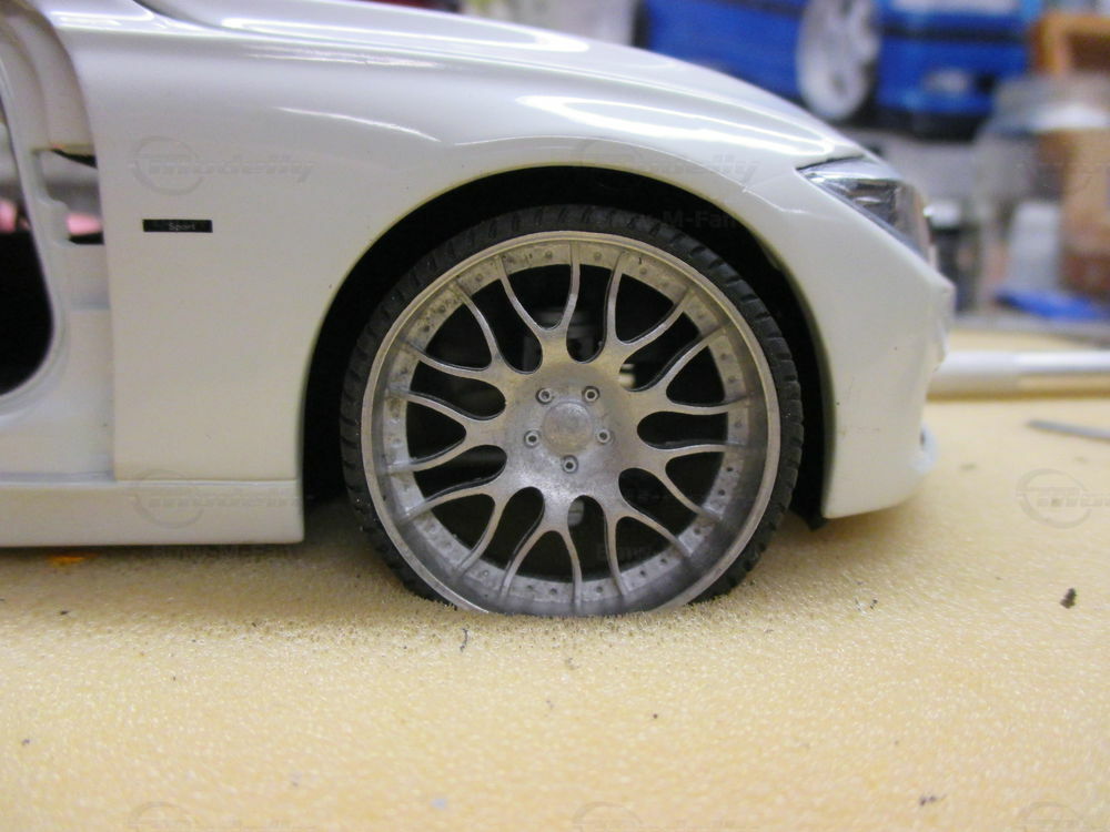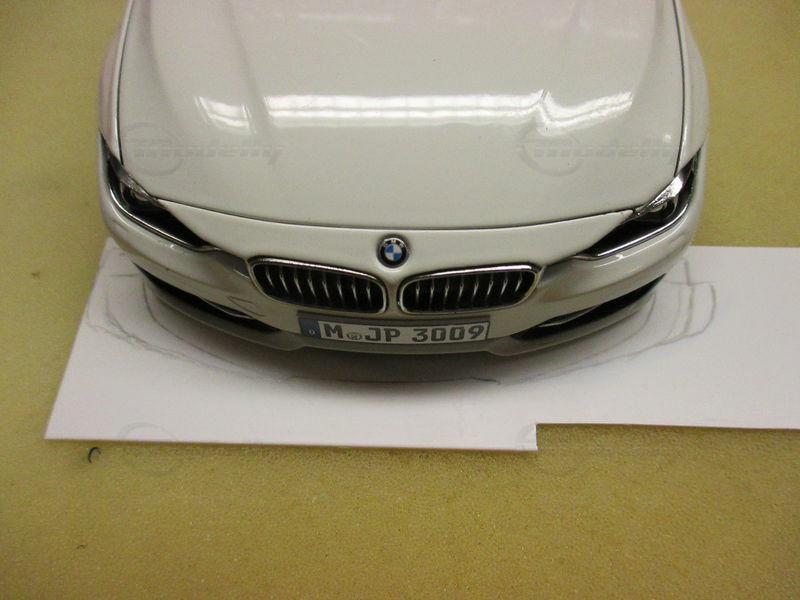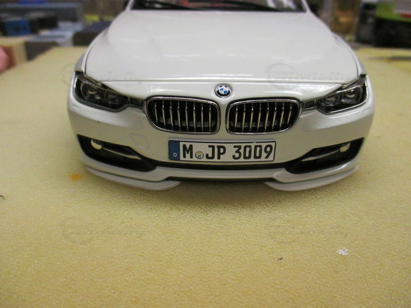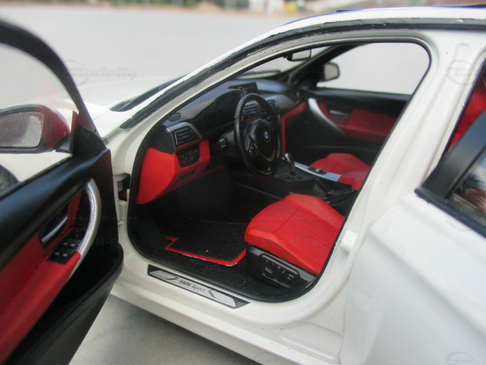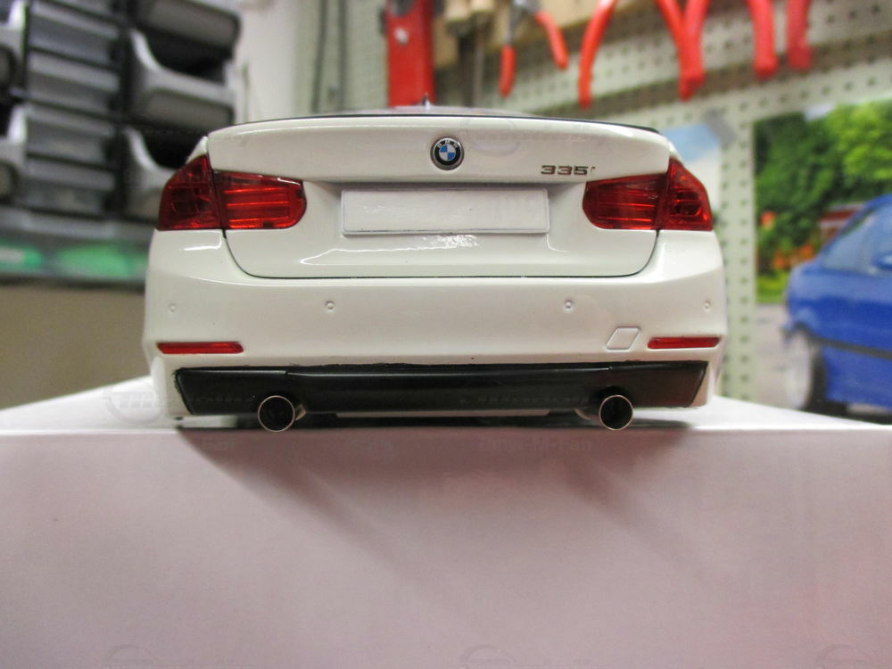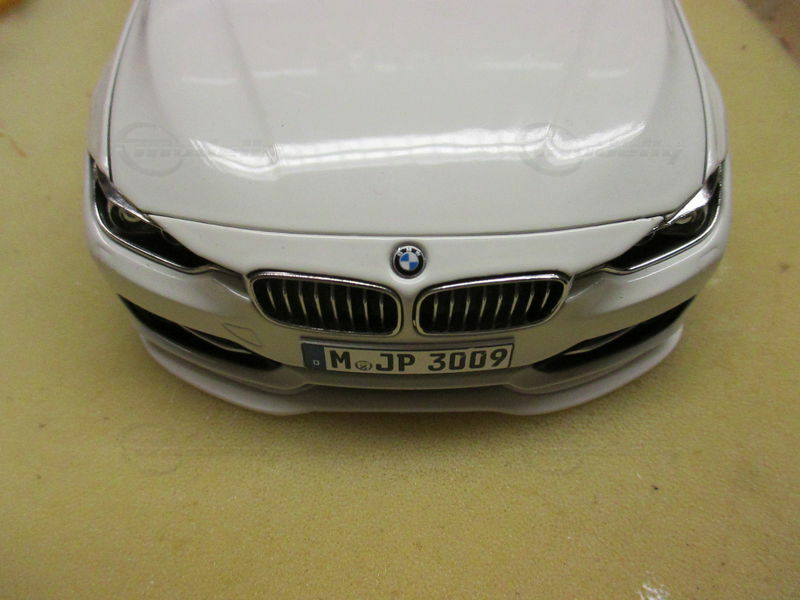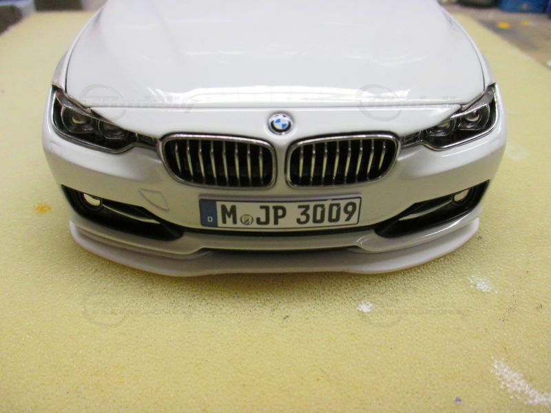 Das hier abgebildete Modellauto im Maßstab 1:18, hergestellt von Paragon, stellt eine modifizierte Version des BMW F30 335i dar. Es handelt sich hierbei nicht um das vom Hersteller ursprünglich produzierte Produkt. Die auffälligsten Modifikationen umfassen das Tuning-Kit von Hamann, welches durch den Frontspoiler, die Seitenschweller und den Heckspoiler deutlich zu erkennen ist. Diese Anbauteile verleihen dem Modell eine sportlichere Optik und eine betonte Aggressivität. Auf den Seitenschwellern und dem vorderen unteren Spoiler sind „Hamann“-Logos aufgedruckt, was auf die Anpassung durch diese spezialisierte Tuning-Firma hinweist.