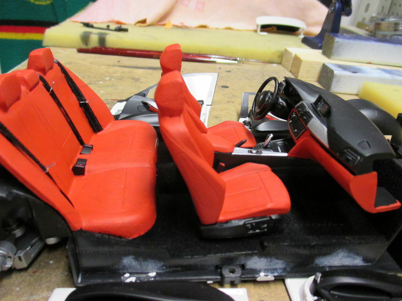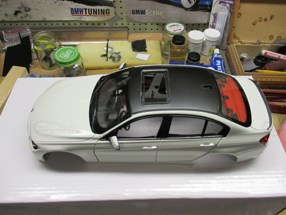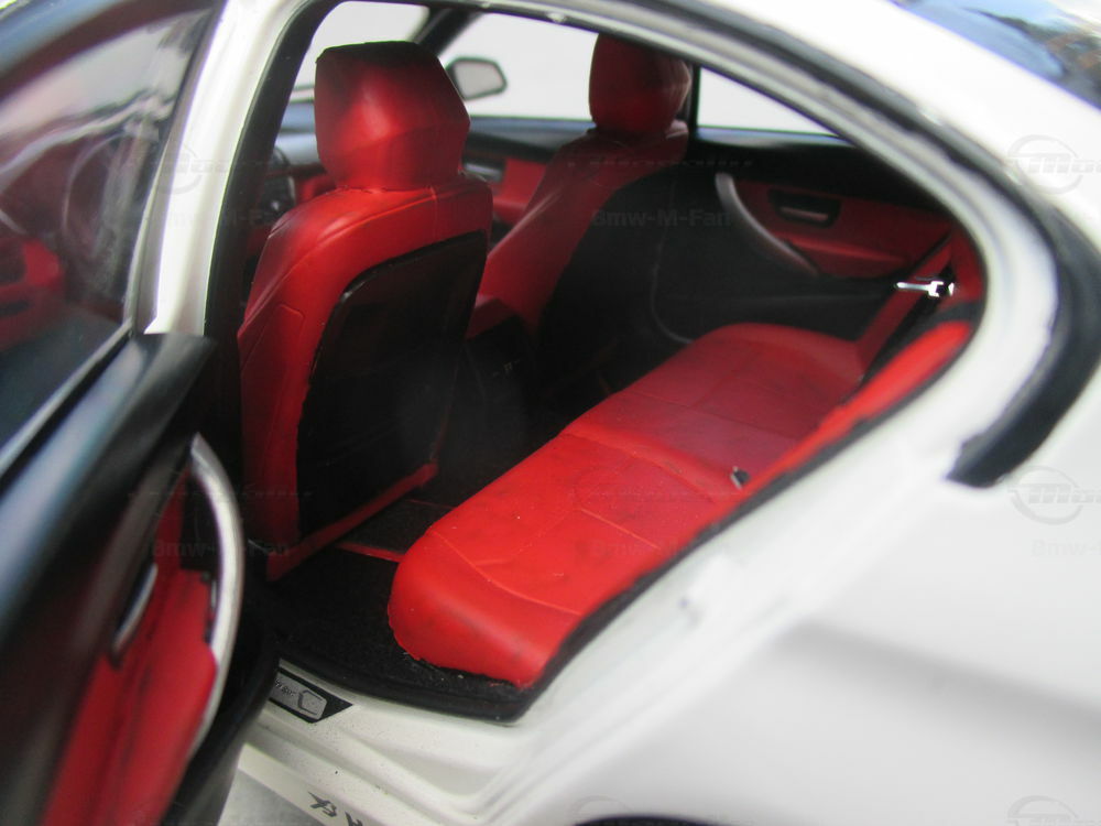 Das Modellauto kennzeichnet sich durch eine weiße Lackierung in Kombination mit einem schwarzen Dach und roten Innenraumdetails, die durch die Fenster gut sichtbar sind. Der Kontrast zwischen dem weißen Korpus und dem schwarzen Dach verleiht dem Fahrzeug eine markante Optik. Zusätzlich sind hochwertige Felgen von Hamann verbaut, welche in einem schlichten Schwarz gehalten sind und das sportliche Gesamtbild abrunden. Auffällig sind auch die Rückspiegelkappen und die Fenstereinfassungen in Hochglanz, die das Äußere harmonisch vervollständigen. Diese Details machen das Modellauto zu einem besonders attraktiven Sammlerstück für BMW- und Modellauto-Enthusiasten weltweit.