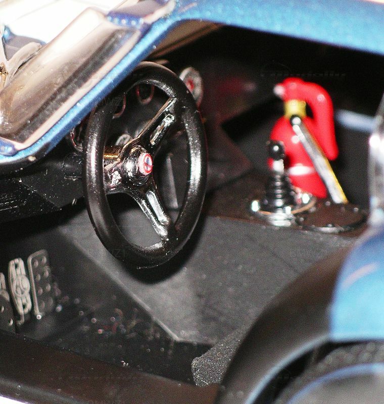 Was das Erscheinungsbild des Modells angeht, ist die Lackierung eine exakte Nachbildung des Originals. Das Fahrzeug leuchtet in seinem metallisch-blauen Finish mit den markanten weißen Rennstreifen, die sowohl über die Motorhaube als auch Heckpartie verlaufen. Diese Lackierung ist charakteristisch für die Fahrzeuge, die hauptsächlich von Phil Hill und Bob Bondurant pilotiert wurden. Die Sponsorenaufkleber sind ebenso präzise nachgebildet, darunter Logos von Firestone und Champion, die symbolhaft für die Rennhistorie stehen.