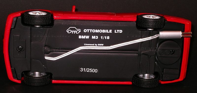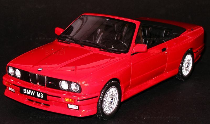 Ein weiteres Highlight des Modells sind die Felgen. Es handelt sich hierbei um die ikonischen Kreuzspeichenfelgen, die perfekt zum sportlichen Charakter passen. Die Art der Gestaltung lässt darauf schließen, dass die Kreuzspeichen aus der Originalreihe des M3 (E30) übernommen wurden, was diesem Replikat zusätzliche Authentizität verleiht. Auch der schwarz gehaltene Verdeckmechanismus, der eingefahren dargestellt ist, entspricht den Standards der Cabriolet-Variante.Besonderes Augenmerk verdient die Lackierung dieses Modellautos. Das klassische Rot, das den aggressiven Stil des M3 verkörpert, ist durchgehend gleichmäßig verarbeitet. Im direkten Licht kommen die kantigen Formen, wie beispielsweise der berühmte Nieren-Kühlergrill von BMW, besonders gut zur Geltung. Solch ein Detailreichtum ist typisch für die Modelle von Otto Models, die dafür bekannt sind, präzise Reproduktionen zu schaffen.