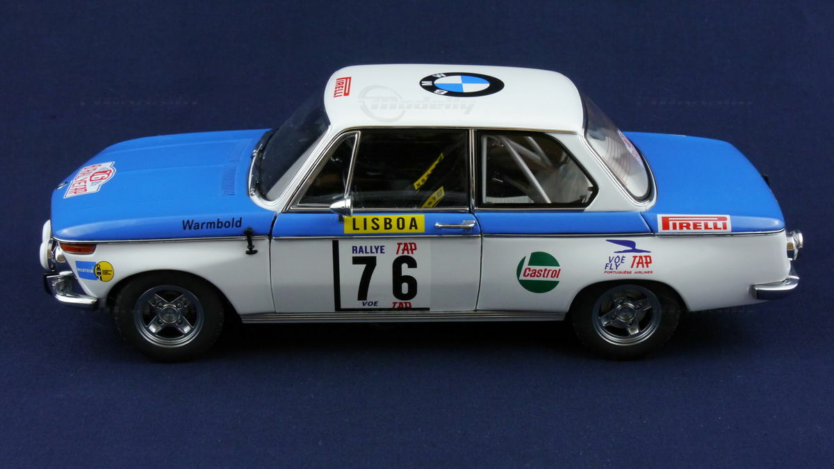 Die speziell für die TAP Rallye entworfene Lackierung des BMW 2002 ist in den Farben Blau und Weiß gehalten, was sowohl eine Hommage an die bayerischen Wurzeln des Herstellers als auch an die nationalen Farben ist. Das Modell, mit seiner Startnummer 76, trägt zudem diverse Sponsorenaufkleber, die ein authentisches Bild der damaligen Zeit vermitteln. Zu den Sponsoren gehören bekannte Marken wie Pirelli, Bilstein, und Castrol. Diese Details sind nicht nur auf dem Originalwagen, sondern auch auf dem 1:18 Modell von AUTOart Millennium emotional und detailgetreu umgesetzt.