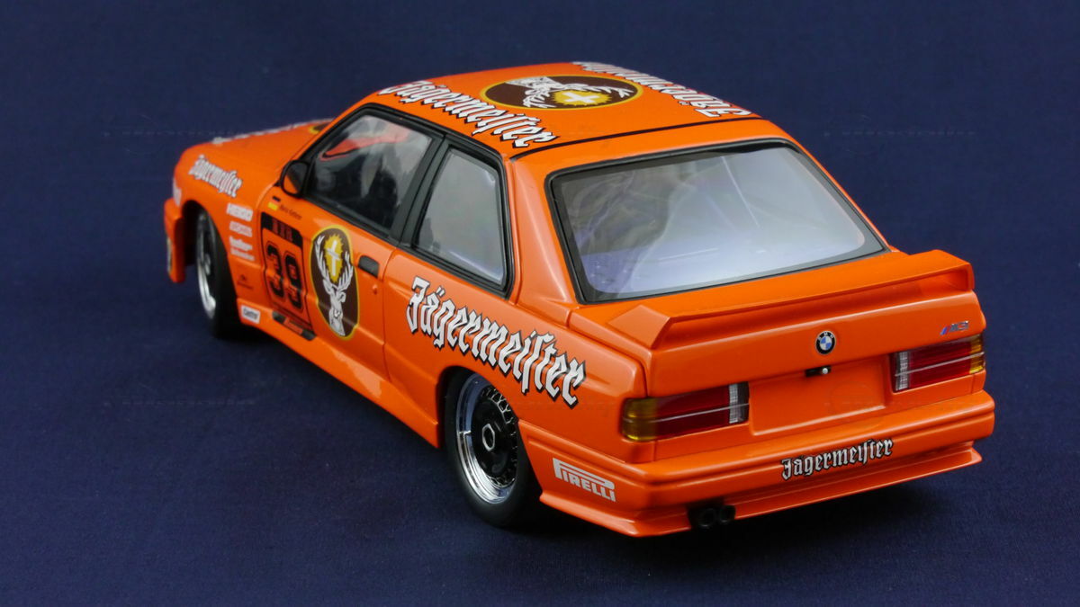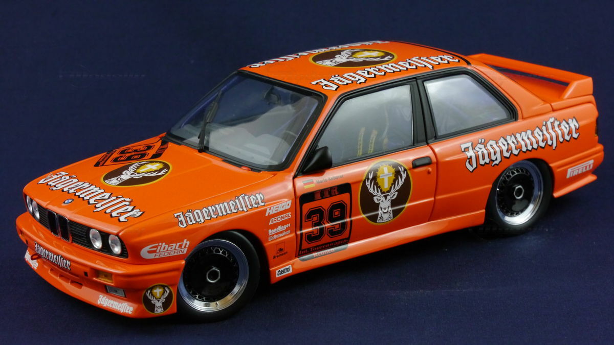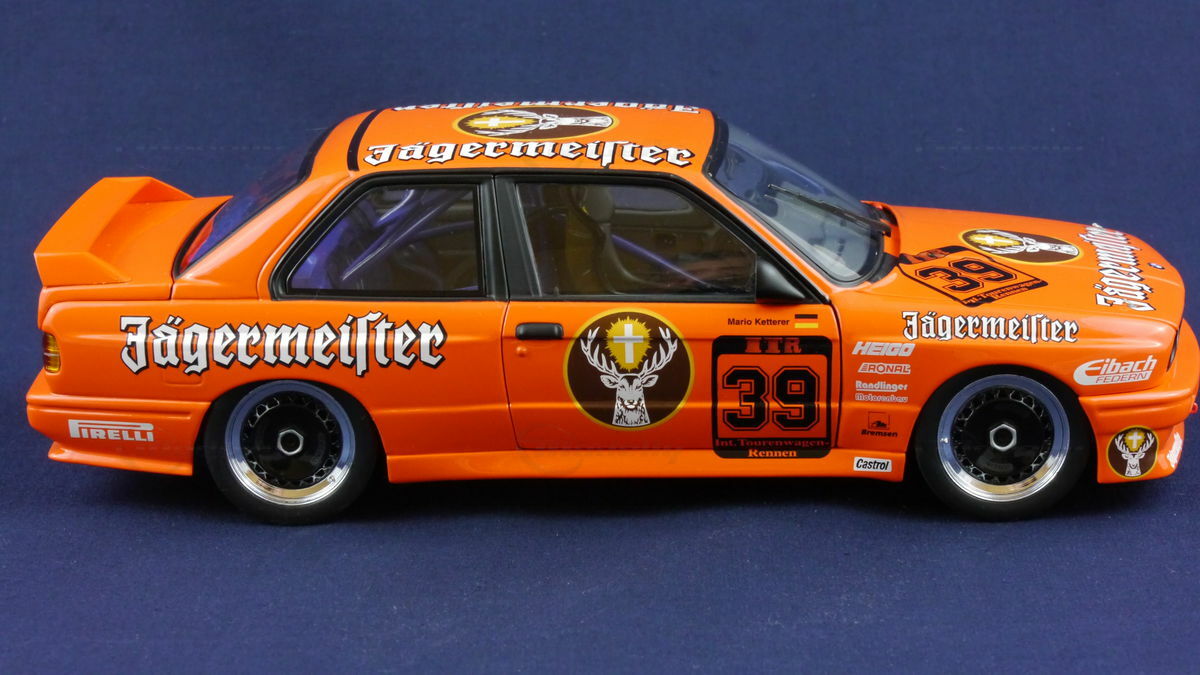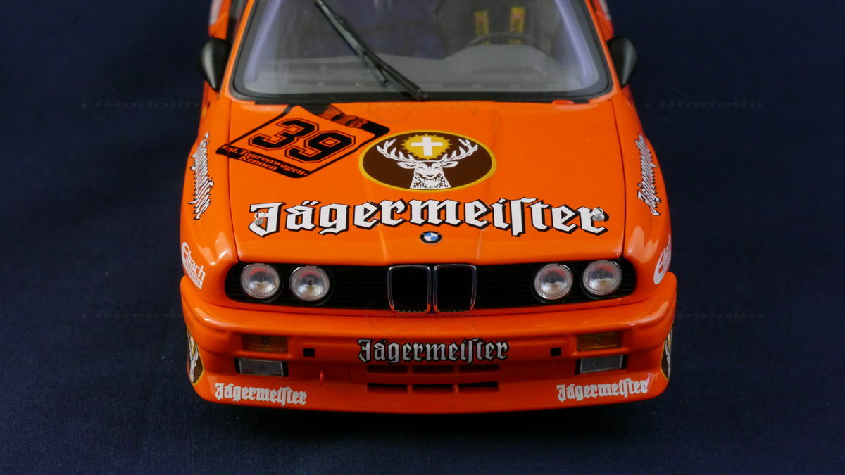 Die Bemalung des BMW M3 DTM 1988 Jägermeister ist ikonisch. Das auffällige Orange mit den weißen Jägermeister-Logos ist nicht nur ein Blickfang, sondern verkörpert auch die Marke und das Erbe dieses Fahrzeugs. Alle wichtigen Sponsoren-Logos sind sichtbar, darunter Jägermeister, Pirelli und Castrol, und verleihen dem Auto einen authentischen Look. Das detaillierte Jägermeister-Logo mit dem Hirschkopf ist prominent auf der Motorhaube und den Seiten des Fahrzeugs platziert, und die Startnummer 39 ist ebenfalls gut sichtbar. Diese lebendige Farbkombination und die Sponsoren-Details machen den M3 sofort erkennbar und zu einem favorisierten Sammlerstück.