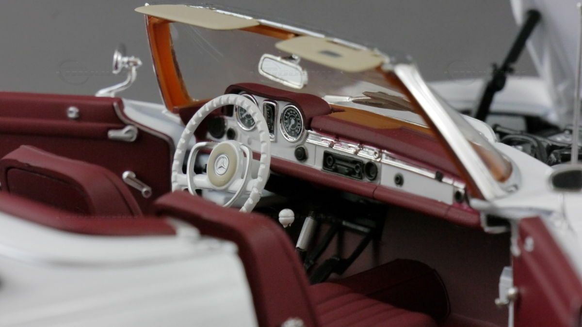 Das Modellauto von Norev besticht durch eine Vielzahl beeindruckender Details, die für Sammler besonders reizvoll sind. Die Türen, die Motorhaube und der Kofferraum können geöffnet werden, wodurch ein Blick auf den detailgetreuen Innenraum und Motor ermöglicht wird. Das Interieur ist in einem edlen Rot gehalten und weist eine hohe Detailgenauigkeit auf, einschließlich des originalgetreuen Lenkrads, der Instrumententafel und der Sitze. Die Modelle sind bekannt für ihre hohe Präzision und Liebe zum Detail, was sie zu einem wertvollen Sammlerstück macht. Die filigranen Details, wie die Chromakzente und die realistischen Reifen, tragen weiter zur Authentizität des Modells bei.
